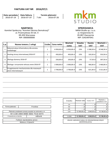 FAKTURA VAT NR 2016/07/1 Data sprzedaży 2016-07-19 Data faktury 2016-07-19 Termin płatności 7 dni 2016-07-26 1900-01-01 NABYWCA SPRZEDAWCA Komitet Społeczny "Komitet Obrony Demokracji" ul. Przemysłowa 35 lok. 4 00-450 Warszawa NIP: 0000000000 MKM-Studio sp. z o.o. ul. Książenicka 41 05-807 Owczarnia NIP: 5342497041 L.p. Nazwa towaru / usługi Liczba Cena netto Wartość netto Stawka VAT Kwota VAT Wartość z VAT 1 Rekonstrukcja infrastruktury dla serwisu medialnego 1 6 950,00 zł 6 950,00 zł 23% 1 598,50 zł 8 548,50 zł 2 Hosting strony internetowej 2016-07 1 450,00 zł 450,00 zł 23% 103,50 zł 553,50 zł 3 Obsługa domeny 2016-07 1 250,00 zł 250,00 zł 23% 57,50 zł 307,50 zł 4 Obsługa i utrzymanie witryny www 2016-07 1 2 000,00 zł 2 000,00 zł 23% 460,00 zł 2 460,00 zł 5 Przygotowanie mechanizmów dla masowych stron internetowych 1 2 700,00 zł 2 700,00 zł 23% 621,00 zł 3 321,00 zł 6 — 0 - zł - zł 0% - zł - zł 7 — 0 - zł - zł 0% - zł - zł 8 — 0 - zł - zł 0% - zł - zł 9 — 0 - zł - zł 0% - zł - zł 10 — 0 - zł - zł 0% - zł - zł Uwagi Forma płatności Stawka Przelew Wartość netto Kwota VAT Wartość z podatkiem VAT zw. - zł - zł - zł 0% - zł - zł - zł - zł 8% - zł - zł Płatności przelewem proszę wysyłać na rachunek o nr 23% 12 350,00 zł 2 840,50 zł 15 190,50 zł 59 1140 2004 0000 3602 7516 6473 mBank SUMA 12 350,00 zł 2 840,50 zł 15 190,50 zł Prowadzony w banku Faktura wystawiona przez: Mateusz Kijowski słownie: piętnaście tysięcy sto dziewięćdziesiąt złotych pięćdziesiąt groszy
