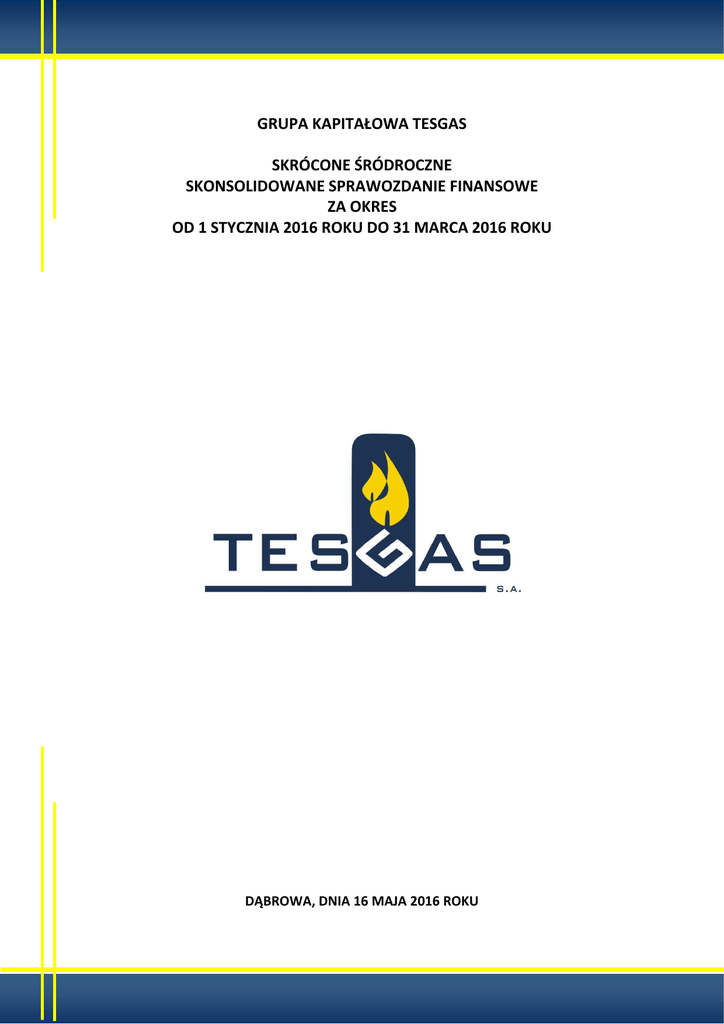 GRUPA KAPITAŁOWA TESGAS SKRÓCONE ŚRÓDROCZNE SKONSOLIDOWANE SPRAWOZDANIE FINANSOWE ZA OKRES OD 1 STYCZNIA 2016 ROKU DO 31 MARCA 2016 ROKU DĄBROWA, DNIA 16 MAJA 2016 ROKU Nazwa grupy kapitałowej: Grupa Kapitałowa TESGAS Okres objęty sprawozdaniem finansowym: 01.01.2016 – 31.03.2016 Poziom zaokrągleń: wszystkie kwoty wyrażone są w tysiącach złotych polskich (o ile nie wskazano inaczej) Waluta sprawozdawcza: złoty polski (PLN) SPIS TREŚCI WYBRANE DANE FINANSOWE GRUPY KAPITAŁOWEJ TESGAS ................................................................................................... 5 WYBRANE DANE FINANSOWE TESGAS S.A. ................................................................................................................................ 6 SKRÓCONE ŚRÓDROCZNE SPRAWOZDANIE FINANSOWE GRUPY KAPITAŁOWEJ TESGAS ...................................................... 7 SKRÓCONE ŚRÓDROCZNE SKONSOLIDOWANE SPRAWOZDANIE Z SYTUACJI FINANSOWEJ (BILANS) ....................................... 7 SKRÓCONY ŚRÓDROCZNY SKONSOLIDOWANY RACHUNEK ZYSKÓW I STRAT ............................................................................ 9 ZYSK (STRATA) NETTO NA JEDNĄ AKCJĘ ZWYKŁĄ ...................................................................................................................... 9 SKRÓCONE ŚRÓDROCZNE SKONSOLIDOWANE SPRAWOZDANIE Z CAŁKOWITYCH DOCHODÓW .............................................. 9 SKRÓCONE ŚRÓDROCZNE SKONSOLIDOWANE ZESTAWIENIE ZMIAN W KAPITALE WŁASNYM ............................................... 11 SKRÓCONE SKONSOLIDOWANE SPRAWOZDANIE Z PRZEPŁYWÓW PIENIĘŻNYCH ................................................................... 14 DODATKOWE INFORMACJE I OBJAŚNIENIA DO SPRAWOZDANIA FINANSOWEGO GRUPY KAPITAŁOWEJ ......................... 16 1. Informacje ogólne ............................................................................................................................................................. 16 2. Osoby zarządzające i nadzorujące Spółki dominującej ...................................................................................................... 17 3. Podstawa sporządzenia oraz zasady (polityka) rachunkowości ......................................................................................... 17 3.1. 3.2. 3.3. 3.4. 3.5. Podstawa sporządzenia .............................................................................................................................................. 17 Zasady rachunkowości ............................................................................................................................................... 18 Niepewność szacunków ............................................................................................................................................. 18 Korekty błędów oraz zmiana zasad rachunkowości ................................................................................................... 18 Zasady konwersji złotych na euro .............................................................................................................................. 18 4. Znaczące zdarzenia i transakcje ......................................................................................................................................... 18 5. Noty objaśniające pozycje sprawozdania finansowego ..................................................................................................... 18 NOTA 1. Sezonowość działalności ............................................................................................................................................ 18 NOTA 2. Zysk na akcję .............................................................................................................................................................. 19 NOTA 3. Segmenty operacyjne ................................................................................................................................................. 19 NOTA 4. Połączenia jednostek gospodarczych ......................................................................................................................... 21 NOTA 5. Wartość firmy............................................................................................................................................................. 21 NOTA 6. Wartości niematerialne .............................................................................................................................................. 23 NOTA 7. Rzeczowe aktywa trwałe ............................................................................................................................................ 25 NOTA 8. Wartość godziwa instrumentów finansowych ........................................................................................................... 27 NOTA 9. Odpisy aktualizujące wartość aktywów ..................................................................................................................... 28 NOTA 10. Kapitał podstawowy ................................................................................................................................................. 28 NOTA 11. Programy płatności akcjami ..................................................................................................................................... 29 NOTA 12. Dywidendy ............................................................................................................................................................... 29 NOTA 13. Emisja i wykup papierów dłużnych .......................................................................................................................... 29 NOTA 14. Naruszenie postanowień umów (kredyty, pożyczki) ................................................................................................ 29 NOTA 15. Rezerwy..