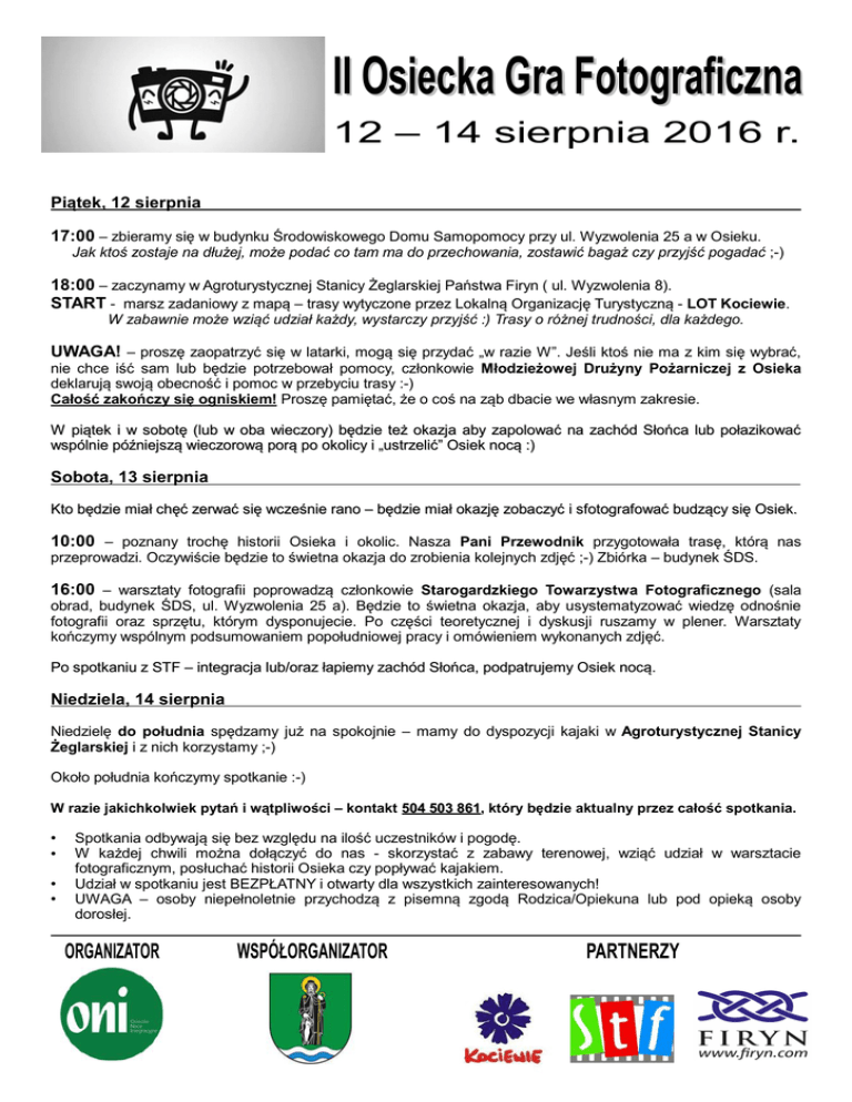 II Osiecka Gra Fotograficzna 12 – 14 sierpnia 2016 r. Piątek, 12 sierpnia 17:00 – zbieramy się w budynku Środowiskowego Domu Samopomocy przy ul. Wyzwolenia 25 a w Osieku. Jak ktoś zostaje na dłużej, może podać co tam ma do przechowania, zostawić bagaż czy przyjść pogadać ;-) 18:00 – zaczynamy w Agroturystycznej Stanicy Żeglarskiej Państwa Firyn ( ul. Wyzwolenia 8). START - marsz zadaniowy z mapą – trasy wytyczone przez Lokalną Organizację Turystyczną - LOT Kociewie. W zabawnie może wziąć udział każdy, wystarczy przyjść :) Trasy o różnej trudności, dla każdego. UWAGA! – proszę zaopatrzyć się w latarki, mogą się przydać „w razie W”. Jeśli ktoś nie ma z kim się wybrać, nie chce iść sam lub będzie potrzebował pomocy, członkowie Młodzieżowej Drużyny Pożarniczej z Osieka deklarują swoją obecność i pomoc w przebyciu trasy :-) Całość zakończy się ogniskiem! Proszę pamiętać, że o coś na ząb dbacie we własnym zakresie. W piątek i w sobotę (lub w oba wieczory) będzie też okazja aby zapolować na zachód Słońca lub połazikować wspólnie późniejszą wieczorową porą po okolicy i „ustrzelić” Osiek nocą :) Sobota, 13 sierpnia Kto będzie miał chęć zerwać się wcześnie rano – będzie miał okazję zobaczyć i sfotografować budzący się Osiek. 10:00 – poznany trochę historii Osieka i okolic. Nasza Pani Przewodnik przygotowała trasę, którą nas przeprowadzi. Oczywiście będzie to świetna okazja do zrobienia kolejnych zdjęć ;-) Zbiórka – budynek ŚDS. 16:00 – warsztaty fotografii poprowadzą członkowie Starogardzkiego Towarzystwa Fotograficznego (sala obrad, budynek ŚDS, ul. Wyzwolenia 25 a). Będzie to świetna okazja, aby usystematyzować wiedzę odnośnie fotografii oraz sprzętu, którym dysponujecie. Po części teoretycznej i dyskusji ruszamy w plener. Warsztaty kończymy wspólnym podsumowaniem popołudniowej pracy i omówieniem wykonanych zdjęć. Po spotkaniu z STF – integracja lub/oraz łapiemy zachód Słońca, podpatrujemy Osiek nocą. Niedziela, 14 sierpnia Niedzielę do południa spędzamy już na spokojnie – mamy do dyspozycji kajaki w Agroturystycznej Stanicy Żeglarskiej i z nich korzystamy ;-) Około południa kończymy spotkanie :-) W razie jakichkolwiek pytań i wątpliwości – kontakt 504 503 861, 861 który będzie aktualny przez całość spotkania. ● ● ● ● Spotkania odbywają się bez względu na ilość uczestników i pogodę. W każdej chwili można dołączyć do nas - skorzystać z zabawy terenowej, wziąć udział w warsztacie fotograficznym, posłuchać historii Osieka czy popływać kajakiem. Udział w spotkaniu jest BEZPŁATNY i otwarty dla wszystkich zainteresowanych! UWAGA – osoby niepełnoletnie przychodzą z pisemną zgodą Rodzica/Opiekuna lub pod opieką osoby dorosłej. ORGANIZATOR WSPÓŁORGANIZATOR PARTNERZY