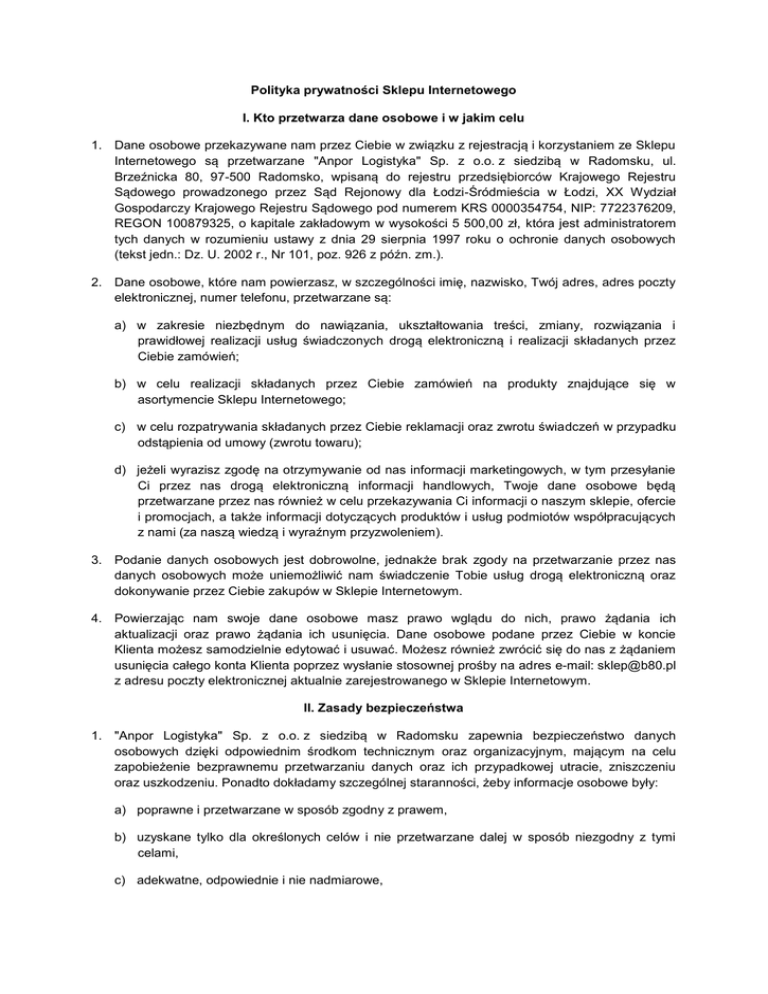 Polityka prywatności Sklepu Internetowego I. Kto przetwarza dane osobowe i w jakim celu 1. Dane osobowe przekazywane nam przez Ciebie w związku z rejestracją i korzystaniem ze Sklepu Internetowego są przetwarzane "Anpor Logistyka" Sp. z o.o. z siedzibą w Radomsku, ul. Brzeźnicka 80, 97-500 Radomsko, wpisaną do rejestru przedsiębiorców Krajowego Rejestru Sądowego prowadzonego przez Sąd Rejonowy dla Łodzi-Śródmieścia w Łodzi, XX Wydział Gospodarczy Krajowego Rejestru Sądowego pod numerem KRS 0000354754, NIP: 7722376209, REGON 100879325, o kapitale zakładowym w wysokości 5 500,00 zł, która jest administratorem tych danych w rozumieniu ustawy z dnia 29 sierpnia 1997 roku o ochronie danych osobowych (tekst jedn.: Dz. U. 2002 r., Nr 101, poz. 926 z późn. zm.). 2. Dane osobowe, które nam powierzasz, w szczególności imię, nazwisko, Twój adres, adres poczty elektronicznej, numer telefonu, przetwarzane są: a) w zakresie niezbędnym do nawiązania, ukształtowania treści, zmiany, rozwiązania i prawidłowej realizacji usług świadczonych drogą elektroniczną i realizacji składanych przez Ciebie zamówień; b) w celu realizacji składanych przez Ciebie zamówień na produkty znajdujące się w asortymencie Sklepu Internetowego; c) w celu rozpatrywania składanych przez Ciebie reklamacji oraz zwrotu świadczeń w przypadku odstąpienia od umowy (zwrotu towaru); d) jeżeli wyrazisz zgodę na otrzymywanie od nas informacji marketingowych, w tym przesyłanie Ci przez nas drogą elektroniczną informacji handlowych, Twoje dane osobowe będą przetwarzane przez nas również w celu przekazywania Ci informacji o naszym sklepie, ofercie i promocjach, a także informacji dotyczących produktów i usług podmiotów współpracujących z nami (za naszą wiedzą i wyraźnym przyzwoleniem). 3. Podanie danych osobowych jest dobrowolne, jednakże brak zgody na przetwarzanie przez nas danych osobowych może uniemożliwić nam świadczenie Tobie usług drogą elektroniczną oraz dokonywanie przez Ciebie zakupów w Sklepie Internetowym. 4. Powierzając nam swoje dane osobowe masz prawo wglądu do nich, prawo żądania ich aktualizacji oraz prawo żądania ich usunięcia. Dane osobowe podane przez Ciebie w koncie Klienta możesz samodzielnie edytować i usuwać. Możesz również zwrócić się do nas z żądaniem usunięcia całego konta Klienta poprzez wysłanie stosownej prośby na adres e-mail: [email protected] z adresu poczty elektronicznej aktualnie zarejestrowanego w Sklepie Internetowym. II. Zasady bezpieczeństwa 1. "Anpor Logistyka" Sp. z o.o. z siedzibą w Radomsku zapewnia bezpieczeństwo danych osobowych dzięki odpowiednim środkom technicznym oraz organizacyjnym, mającym na celu zapobieżenie bezprawnemu przetwarzaniu danych oraz ich przypadkowej utracie, zniszczeniu oraz uszkodzeniu. Ponadto dokładamy szczególnej staranności, żeby informacje osobowe były: a) poprawne i przetwarzane w sposób zgodny z prawem, b) uzyskane tylko dla określonych celów i nie przetwarzane dalej w sposób niezgodny z tymi celami, c) adekwatne, odpowiednie i nie nadmiarowe, d) dokładne i aktualne, e) nie przechowywane dłużej niż to konieczne, f) przetwarzane zgodnie z prawami przysługującymi osobom (których dotyczą), w tym zgodnie z prawem do zastrzeżenia udostępniania, g) bezpiecznie przechowywane, h) nie transferowane bez odpowiedniej ochrony. 2. Dla Twojego bezpieczeństwa, pamiętaj o: a) ustanowieniu loginu i hasła do Twojego konta Klienta uniemożliwiających w prosty sposób odgadnięcie ich przez osoby trzecie. W szczególności zalecamy stosowanie w haśle ciągu znaków i cyfr oraz dużych i małych liter; b) wylogowaniu się ze strony www.b80.pl po zakończonej sesji (zakończonych zakupach, dodawaniu wiadomości na forum itp.). Samo wyłączenie okna przeglądarki nie jest równoznaczne z wylogowaniem się ze strony www.b80.pl. Wylogowanie ze strony www.b80.pl nastąpi po kliknięciu przycisku „Wyloguj”; c) zachowaniu loginu i hasła do konta Klienta w tajemnicy, w tym w szczególności o nieprzekazywaniu danych (loginu, hasła) jakimkolwiek osobom trzecim; d) korzystaniu z programów antywirusowych, w tym regularnym skanowaniu dysków w poszukiwaniu wirusów; e) korzystaniu ze strony i Sklepu Internetowego wyłącznie za pośrednictwem zaufanych komputerów, na których zainstalowano wyłącznie sprawdzone oprogramowanie. Korzystanie z cudzych komputerów rodzi ryzyko przechwycenia loginu, hasła lub innych danych, które podajesz; f) jeśli jednak korzystasz ze strony lub Sklepu Internetowego za pomocą obcego komputera, np. w kafejce internetowej, pamiętaj o tym, aby nie zapamiętywać danych na komputerze i usunąć historię przeglądanych stron. Z zapamiętanych danych może skorzystać osoba która będzie korzystała z komputera po Tobie. III. Informacje techniczne 1. Informacje techniczne – pliki cookie a) Podczas korzystania przez Ciebie ze Sklepu Internetowego na Twoim urządzeniu końcowym (komputerze, smartfonie, tablecie itp.) zapisywane są niewielkie pliki (w szczególności tekstowe), zawierające informacje niezbędne do prawidłowego korzystania ze Sklepu Internetowego tzw. pliki cookie. Dzięki zapisaniu tych plików na Twoim urządzeniu możliwe jest m. in. zapamiętanie danych logowania, dzięki czemu nie będziesz musiał każdorazowo wpisywać loginu i hasła, zapamiętanie towarów dodanych przez Ciebie do koszyka, czy dostosowanie treści strony do Twoich zainteresowań. Dzięki plikom cookie możliwe jest zbieranie danych statystycznych Sklepu Internetowego, co umożliwia nam rozwijanie Sklepu zgodnie z preferencjami naszych Klientów. b) Pliki cookie nie zawierają danych identyfikujących Cię, na ich podstawie nie można ustalić czyjejkolwiek tożsamości. Pliki te nie są w żaden sposób szkodliwe dla Twojego urządzenia i nie zmieniają jego ustawień ani ustawień zainstalowanego na nim oprogramowania. Odczytanie zawarto