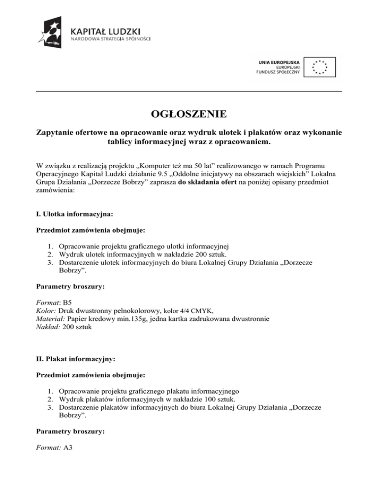 OGŁOSZENIE Zapytanie ofertowe na opracowanie oraz wydruk ulotek i plakatów oraz wykonanie tablicy informacyjnej wraz z opracowaniem. W związku z realizacją projektu „Komputer też ma 50 lat” realizowanego w ramach Programu Operacyjnego Kapitał Ludzki działanie 9.5 „Oddolne inicjatywy na obszarach wiejskich” Lokalna Grupa Działania „Dorzecze Bobrzy” zaprasza do składania ofert na poniżej opisany przedmiot zamówienia: I. Ulotka informacyjna: Przedmiot zamówienia obejmuje: 1. Opracowanie projektu graficznego ulotki informacyjnej 2. Wydruk ulotek informacyjnych w nakładzie 200 sztuk. 3. Dostarczenie ulotek informacyjnych do biura Lokalnej Grupy Działania „Dorzecze Bobrzy”. Parametry broszury: Format: B5 Kolor: Druk dwustronny pełnokolorowy, kolor 4/4 CMYK, Materiał: Papier kredowy min.135g, jedna kartka zadrukowana dwustronnie Nakład: 200 sztuk II. Plakat informacyjny: Przedmiot zamówienia obejmuje: 1. Opracowanie projektu graficznego plakatu informacyjnego 2. Wydruk plakatów informacyjnych w nakładzie 100 sztuk. 3. Dostarczenie plakatów informacyjnych do biura Lokalnej Grupy Działania „Dorzecze Bobrzy”. Parametry broszury: Format: A3 Kolor: Druk pełnokolorowy, lakier dyspersyjny, full color Materiał: Papier kredowy, gramatura min. 150g, jedna kartka zadrukowana jednostronnie Nakład: 100 sztuk III. Tablica informacyjna: Przedmiot zamówienia obejmuje: 1. Opracowanie projektu graficznego Tablicy informacyjnej (plansza na budynek) 2. Wykonanie tablicy informacyjnej – planszy na budynek. 3. Dostarczenie tablicy informacyjnej do biura Lokalnej Grupy Działania „Dorzecze Bobrzy”. Parametry tablicy informacyjnej: Format: 50 cm x 60 cm Materiał: Płyta PCV o grubości od 3 do 5 mm lub równoważna , na ozdobnych kółkach dystansowych do umieszczenia na ścianie budynku. Druk napisów i znaków: pełny kolor, wykonany na folii samoprzylepnej, zabezpieczenie druku z folii PCV bezbarwnej. Liczba sztuk : 1 sztuka. Termin realizacji zamówienia: do 25 stycznia 2012 r. Kryterium oceny ofert: 100% cena Inne istotne warunki zamówienia: Zamawiający przekaże Wykonawcy wszystkie materiały niezbędne do przygotowania ulotki, plakatów oraz tablicy; tekst oraz logo. Zamawiający zastrzega możliwość unieważnienie zapytania bez podania przyczyn. Ostateczny projekt zamówienia wymaga akceptacji Zamawiającego. Wykonawca dostarczy zamówienie do Biura Lokalnej Grupy Działania „Dorzecze Bobrzy” Kostomłoty II; ul. Kościelna 133 ; 26-085 Miedziana Góra. Ofertę prosimy przesłać pocztą na adres lub złożyć osobiście: Biuro Lokalnej Grupy Działania „Dorzecze Bobrzy” Kostomłoty II; ul. Kościelna 133 ; 26-085 Miedziana Góra. do dnia 11.01.2012 do godz. 10.00 O wynikach postępowania Zamawiający poinformuje na stronie internetowej www.dorzeczebobrz.eu Załącznik nr 1 Wykonawca: (pieczątka) Lokalna Grupa Działania „Dorzecze Bobrzy” Kostomłoty II; ul. Kościelna 133 26-085 Miedziana Góra OFERTA Wartość wykonania zamówienia, zgodnie z „opisem przedmiotu zamówienia” zamieszczonym w zapytaniu ofert wynosi: ………………………… pln brutto. Słownie: …………………………………………………………………………………….. ……………………………………………………………………………………………….. W tym : Nazwa Cena brutto Słownie cena brutto Cena brutto Słownie cena brutto za sztukę za sztukę ogółem ogółem I. Ulotka informacyjna II. Plakat informacyjny III. Tablica Nie informacyjna .........................., dnia .................... Miejscowość dotyczy Nie dotyczy ................................................................... Podpis osoby (osób) upoważnionej do występowania w imieniu Wykonawcy Załącznik nr 2 OŚWIADCZENIE Składając niniejszą ofertę na zapytanie ofertowe pn. „wykonanie materiałów promocyjnych” w postępowaniu konkursowym oświadczamy, że: 1. Posiadamy uprawnienia do wykonywania określonej działalności lub czynności, jeżeli ustawy nakładają obowiązek posiadania takich uprawnień. 2. Posiadamy niezbędną wiedzę, doświadczenie, a także potencjał ekonomiczny, sprzętowy i techniczny w zakresie prowadzenia usług poligraficznych oraz kadrą do wykonania danego zamówienia. 3. Znajdujemy się w sytuacji ekonomicznej i finansowej zapewniającej wykonanie zamówienia. 4. Nie podlegamy wykluczeniu z postępowania o udzielenie zamówienia 5. Zapoznaliśmy się i akceptujemy warunki oraz zapisy zawarte w treści „Umowy” z Zamawiającym .........................., dnia .................... Miejscowość ................................................................... Podpis osoby (osób) upoważnionej do występowania w imieniu Wykonawcy