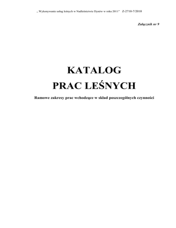 „ Wykonywanie usług leśnych w Nadleśnictwie Dynów w roku 2011” Z-2710-7/2010 Załącznik nr 9 KATALOG PRAC LEŚNYCH Ramowe zakresy prac wchodzące w skład poszczególnych czynności „ Wykonywanie usług leśnych w Nadleśnictwie Dynów w roku 2011” Z-2710-7/2010 1. POZYSKANIE DREWNA Grupy czynności: CP-P, PTP, PTW, TPN, TPP, TWN, TWP, IIA, IVD, IVDU, V, PR, PRZEST, UPRZPOZ - obejmują: przygotowanie stanowiska do ścinki, ścinka wraz z obalaniem, okrzesywanie, wyrzynka dłużyc lub kłód, wyrzynka grubizny wraz ze znoszeniem i układaniem, łupanie drewna stosowego . Do cięć przedrębnych zalicza się: CP-P, PTP, PTW, TPN, TPP, TWN, TWP Do cięć rębnych zalicza się :IIA, IVD, IVDU, V, PR,PRZEST, UPRZPOZ 2. ZRYWKA DREWNA Grupy czynności: ZM - obejmuje: Zrywkę drewna po wyznaczonych szlakach zrywkowych do składów autobiernych lub dróg dostępnych dla pojazdów wywozowych. Wykonawcę obowiązuje stosowanie zrywki nasiębiernej lub półpodwieszonej. 3. HODOWLA LASU Obejmuje czynności: melioracje agrotechniczne - prace związane z oczyszczeniem przyszłej powierzchni odnowieniowej z pozostałości pozrębowych i podszytów, poprzez wycinanie, wynoszenie i układanie w pryzmy. mechaniczne przygotowanie powierzchni na pasach - przygotowanie do sadzenie powierzchni odnowieniowej w formie pasów lub bruzd za pomocą specjalistycznych urządzeń agregowanych z ciągnikami rolniczymi, dostosowanymi do ich wymogów (frez leśny, pług LPŻ). Przygotowana powierzchnia musi spełniać wymóg zachowania więźby odpowiedniej dla poszczególnych gatunków (tzn. odpowiednią odległość pomiędzy rzędami). Obejmuje również dostarczenie urządzenia z miejsca postoju w leśnictwie (przy leśniczówce), w którym będą wykonywane prace do konkretnej powierzchni odnowieniowej jak również agregowanie maszyny z ciągnikiem. ręczne przygotowanie gleby (odnowienia i zalesienia) - zdarcie pokrywy, usunięcie chwastów na pow. 40cmx40cm i wytrząśnięcie próchnicy ze zdartej pokrywy, w miejscach przyszłego sadzenia (środek oczyszczonej powierzchni = miejsce sadzenia), jak również przekopanie gleby na powierzchni 30cmx30cm na głębokość 25 cm, w miejscach przyszłego sadzenia (środek przekopanej powierzchni = miejsce sadzenia).. poprawa talerzy (poprawki) - zdarcie pokrywy, usunięcie chwastów na pow. 40cmx40cm i przekopanie gleby na pow. 30cmx30cm, starych talerzy. sadzenie (odnowienia i poprawki) - załadunek sadzonek do pojemników, wraz z zabezpieczaniem korzeni przed wysychaniem, doniesienie sadzonek do miejsca sadzenia (kaset z sadzonkami z zakrytym systemem korzeniowym), wykonanie jamki, dołka (np. kostur rurowy) lub szpary, sadzenie oraz ubicie gleby wokół sadzonek. „ Wykonywanie usług leśnych w Nadleśnictwie Dynów w roku 2011” Z-2710-7/2010 wykonanie czyszczeń wczesnych - usunięcie drzewek chorych, wadliwych lub niepożądanych za pomocą siekiery, tasaka lub pilarki poprzez wycinane, ogławianie, obrączkowanie, przycinanie itp. wykonanie czyszczeń późnych - wycięcie lub ogłowienie wcześniej oznaczonych drzewek przy pomocy siekiery, tasaka lub pilarki i pozostawienie wyciętych drzewek w miejscu ścięcia (obalenie ich na ziemię). pielęgnowanie upraw - usuwanie chwastów (rośliny zielne, odrośli drzew i krzewów) wokół sadzonek na powierzchni talerza, na międzyrzędach lub na całej powierzchni (koszenie lub motyczenie). niezakordowane ręczne prace godzinowe z hodowli lasu - m.in. załadunek na szkółce i rozładunek do dołu przeznaczonego do przechowywania sadzonek w konkretnym leśnictwie, budowę czasowego i przygotowanie stałego dołu do przechowywania sadzonek, wyniesienie wyłamanych w wyniku działania czynników przyrodniczych (nie związanych z aktualnie prowadzonym pozyskaniem) konarów, gałęzi z powierzchni upraw, oraz inne prace nie wymienione w powyższych opisach. niezakordowane prace godzinowe z hodowli lasu użyciem pilarki spalinowej - m.in. usuwanie z powierzchni odnowień drzew, konarów i gałęzi przewróconych lub złamanych w wyniku działania czynników przyrodniczych (nie związanych z aktualnie prowadzonym pozyskaniem) oraz inne prace nie wymienione w powyższych opisach. Obejmują również doniesienie na powierzchnię wszystkich niezbędnych do prac narzędzi. niezakordowane prace godzinowe z hodowli lasu z użyciem ciągnika rolniczego - dowóz sadzonek z szkółki do dołu przeznaczonego do przechowywania materiału sadzeniowego konkretnego leśnictwa, dowóz maszyn np. frezu leśnego z miejsca jego ostatniego przetrzymywania (leśnictwa) do miejsca wykonywania nowych prac (leśniczówka), oraz inne prace nie wymienione w powyższych opisach. 4. GOSPODARKA SZKÓŁKARSKA Obejmuje czynności: deszczowanie szkółki - nawadnianie i ochrona przed przymrozkami wschodów i sadzonek zarówno w namiotach i inspektach jak i w szkółkach gruntowych. Obejmuje również transport montaż i demontaż elementów deszczowni. prace przy konstrukcjach - założenie i naciągnięcie folii na konstrukcje namiotów, rozłożenie konstrukcji i siatek cieniujących na wschody łącznie z transportem siatki i konstrukcji na miejsce. nawożenie (mineralne i organiczne) - dowóz i wysiew nawozów ręcznie (mineralnych) lub mechanicznie (organicznych). „ Wykonywanie usług leśnych w Nadleśnictwie Dynów w roku 2011” Z-2710-7/2010 pielęgnowanie sadzonek - ręczne pielenie wschodów i sadzonek zarówno w przypadku siewów częściowych jak i pełnych. Obejmuje również wyniesienie wypielonych chwastów poza powierzchnię w wyznaczone miejsce. przygotowanie substratu - przesianie wymieszanie i załadunek produktów substratu, jak również transport gotowego substratu w przeznaczone miejsce (inspekty). szkółkowanie - ułożenie uprzednio przesortowanych sadzonek w skrzynkach, formowanie korzeni i zabezpieczanie ich przed wysychaniem, doniesienie sadzonek na powierzchnię, wykonanie szpary, szkółkowanie wraz z ubic