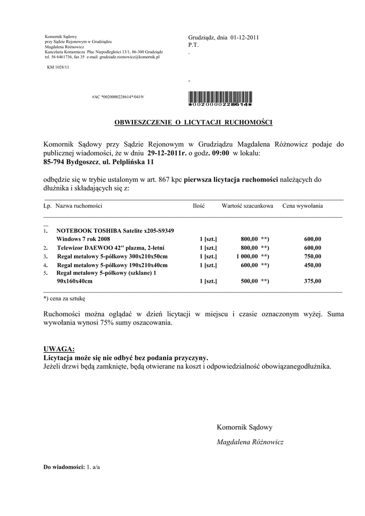 Komornik Sądowy przy Sądzie Rejonowym w Grudziądzu Magdalena Różnowicz Kancelaria Komornicza Plac Niepodległości 13/1, 86-300 Grudziądz tel. 56 6461736, fax 35 e-mail: [email protected] Grudziądz, dnia 01-12-2011 P.T. . KM 1028/11 #AC *0020000228614*/0419/ *0020000228614* OBWIESZCZENIE O LICYTACJI RUCHOMOŚCI Komornik Sądowy przy Sądzie Rejonowym w Grudziądzu Magdalena Różnowicz podaje do publicznej wiadomości, że w dniu 29-12-2011r. o godz. 09:00 w lokalu: 85-794 Bydgoszcz, ul. Pelplińska 11 odbędzie się w trybie ustalonym w art. 867 kpc pierwsza licytacja ruchomości należących do dłużnika i składających się z: _______________________________________________________________________________________________________________________ Lp. Nazwa ruchomości Ilość Wartość szacunkowa Cena wywołania _______________________________________________________________________________________________________________________ __ 1. 2. 3. 4. 5. NOTEBOOK TOSHIBA Satelite x205-S9349 Windows 7 rok 2008 Telewizor DAEWOO 42'' plazma, 2-letni Regał metalowy 5-półkowy 300x210x50cm Regał metalowy 5-półkowy 190x210x40cm Regał metalowy 5-półkowy (szklane) 1 90x160x40cm 1 [szt.] 1 [szt.] 1 [szt.] 1 [szt.] 1 [szt.] 800,00 800,00 1 000,00 600,00 **) **) **) **) 600,00 600,00 750,00 450,00 500,00 **) 375,00 _______________________________________________________________________________________________________________________ *) cena za sztukę Ruchomości można oglądać w dzień licytacji w miejscu i czasie oznaczonym wyżej. Suma wywołania wynosi 75% sumy oszacowania. UWAGA: Licytacja może się nie odbyć bez podania przyczyny. Jeżeli drzwi będą zamknięte, będą otwierane na koszt i odpowiedzialność obowiązanegodłużnika. Komornik Sądowy Magdalena Różnowicz Do wiadomości: 1. a/a