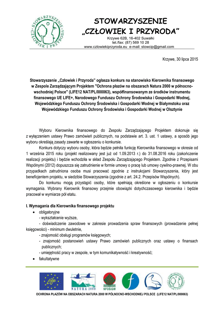 STOWARZYSZENIE „CZŁOWIEK I PRZYRODA” Krzywe 62B, 16-402 Suwałki tel./fax: (87) 569 10 28 www.czlowiekiprzyroda.eu e-mail: [email protected] Krzywe, 30 lipca 2015 Stowarzyszenie „Człowiek i Przyroda” ogłasza konkurs na stanowisko Kierownika finansowego w Zespole Zarządzającym Projektem "Ochrona płazów na obszarach Natura 2000 w północnowschodniej Polsce" (LIFE12 NAT/PL/000063), współfinansowanym ze środków instrumentu finansowego UE LIFE+, Narodowego Funduszu Ochrony Środowiska i Gospodarki Wodnej, Wojewódzkiego Funduszu Ochrony Środowiska i Gospodarki Wodnej w Białymstoku oraz Wojewódzkiego Funduszu Ochrony Środowiska i Gospodarki Wodnej w Olsztynie Wyboru Kierownika finansowego do Zespołu Zarządzającego Projektem dokonuje się z wyłączeniem ustawy Prawo zamówień publicznych, na podstawie art. 3. ust. 1 ustawy, a sposób jego wyboru określają zasady zawarte w ogłoszeniu o konkursie. Konkurs dotyczy wyboru osoby, która będzie pełniła funkcję Kierownika finansowego w okresie od 1 września 2015 roku (projekt realizowany jest już od 1.09.2013 r.) do 31.08.2016 roku (zakończenie realizacji projektu) i będzie wchodziła w skład Zespołu Zarządzającego Projektem. Zgodnie z Przepisami Wspólnymi (2012) dopuszcza się zatrudnienie w formie umowy o pracę lub umowy cywilno-prawnej. W obu przypadkach zatrudniona osoba musi pracować zgodnie z instrukcjami Stowarzyszenia, który jest beneficjentem projektu, w siedzibie Stowarzyszenia (zgodnie z art. 24.2. Przepisów Wspólnych). Do konkursu mogą przystąpić osoby, które spełniają określone w ogłoszeniu o konkursie wymagania. Wybrany Kierownik finansowy przejmie obowiązki dotychczasowego kierownika i będzie pracował w wymiarze pół etatu. I. Wymagania dla Kierownika finansowego projektu  obligatoryjne - wykształcenie wyższe, - doświadczenie zawodowe w zakresie prowadzenia spraw finansowych (prowadzenie pełnej księgowości) - minimum dwuletnie, - znajomość obsługi programów księgowych; - znajomość postanowień ustawy Prawo zamówień publicznych oraz ustawy o finansach publicznych; - umiejętność pracy w zespole, w tym komunikatywność i kreatywność;  fakultatywne OCHRONA PŁAZÓW NA OBSZARACH NATURA 2000 W PÓŁNOCNO-WSCHODNIEJ POLSCE (LIFE12 NAT/PL/000063) - wykształcenie wyższe ekonomiczne, - znajomość zasad i procedur właściwych dla realizacji projektów współfinansowanych ze środków Unii Europejskiej. II. Przedmiot świadczonej usługi Podstawowy zakres obowiązków Kierownika technicznego projektu - prowadzenie księgowości projektu, zgodnie z obowiązującymi zasadami rachunkowości (prowadzenie księgi rachunkowej, z zastosowaniem analitycznego systemu księgowości),, - opisywanie dokumentów finansowych związanych z projektem, - sprawdzanie poprawności dokumentów księgowych pod względem rachunkowym i zgodności z zawartymi umowami, - przechowanie i archiwizacja dokumentacji finansowej (m.in. faktur, zamówień, dowodów płatności) oraz wszelkich innych dokumentów stosowanych do kalkulacji i prezentacji kosztów, - przygotowanie raportów z realizacji budżetu (w aspekcie kosztowym i czasowym), - bieżące monitorowanie płynności finansowej projektu na podstawie sporządzonych prognoz realizacji budżetu, - aktualizacja planów płatności i harmonogramu rzeczowo-finansowego w ścisłej współpracy z Koordynatorem projektu, - przygotowanie sprawozdania z realizacji budżetu (na potrzeby zewnętrzne) - zgodnie z umowami o dofinansowanie, - udział w spotkaniach Zespołu Zarządzającego Projektem, - zgłaszanie Koordynatorowi projektu wszystkich nieprawidłowości i trudności finansowych w wykonywaniu poszczególnych zadań, a zwłaszcza zagrożenia płynności finansowej projektu, - udział w przygotowywaniu umów z podwykonawcami oraz pracownikami projektu, - opiniowanie dokumentacji przetargowej (w części finansowej), - prowadzenie bieżącej kontroli realizacji budżetu w aspekcie: kwalifikowalności kosztów, zgodności z budżetem, realizacji płatności z punktu widzenia płynności, - przygotowywanie wniosków o płatność (kolejne transze) - zgodnie z umowami o dofinansowanie, - udział w sporządzaniu wszelkich raportów wymaganych postanowieniami organów dotujących, - przygotowywanie korespondencji w sprawach finansowych dotyczących wniosku, - udział w spotkaniach z audytem zewnętrznym. III. Wykaz dokumentów potwierdzających spełnianie warunków konkursowych 1. CV – zawierające dane personalne Kandydata, miejsce zamieszkania w tym adres do korespondenci, wykształcenie, przebieg pracy zawodowej. 2. Dokument potwierdzający wykształcenie wyższe. 3. Dokument potwierdzający doświadczenie w zakresie prowadzenia spraw finansowych potwierdzenie pracy na stanowisku kierowniczym przy pełnej księgowości przez minimum dwa lata. IV. Opis procedury wyłaniania Kandydata Kandydat spełniający wymagania przedstawione w pkt I (min. w części obligatoryjnej) i w pkt III, zaproszony zostanie do drugiego etapu konkursu. Drugim etapem konkursu jest rozmowa kwalifikacyjna z Kandydatem, na podstawie której Komisja Konkursowa sprawdzi wiedzę i predyspozycje Kandydata OCHRONA PŁAZÓW NA OBSZARACH NATURA 2000 W PÓŁNOCNO-WSCHODNIEJ POLSCE (LIFE12 NAT/PL/000063) w związku z potencjalnym świadczeniem przez niego usługi będącej przedmiotem Konkursu. Pytania bezpośrednio dotyczyć będą przedmiotu świadczonej usługi określonej w pkt II. Rozmowa kwalifikacyjna ma charakter indywidualny, tj. bierze w niej jednorazowo udział tylko jeden Kandydat. W dalszym postępowaniu komisja wyłoni zwycięzcę konkursu. Przed podjęciem decyzji o wyborze kandydata członkowie komisji ocenią dokumenty złożone przez Kandydata w pierwszym etapie konkursu oraz przebieg rozmowy z drugiego etapu. V. Pozostałe informacje dotyczące konkursu Oferty, które wpłyną do siedziby Stowarzyszenia po terminie lub będą niekompletne zostaną zwróco