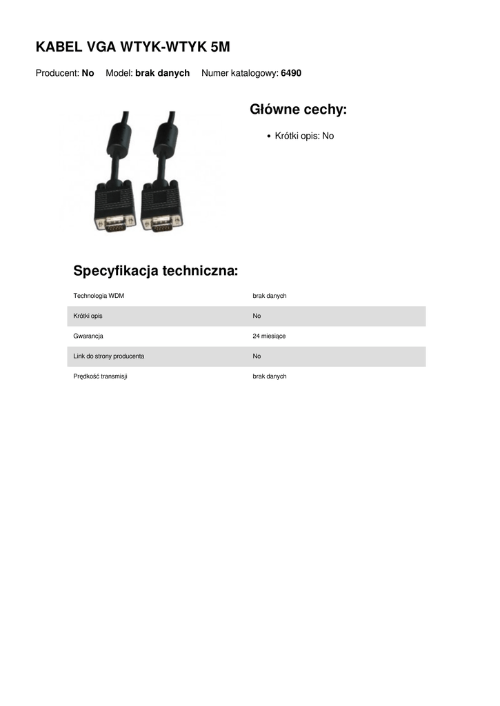KABEL VGA WTYK-WTYK 5M Producent: No Model: brak danych Numer katalogowy: 6490 Główne cechy: Krótki opis: No Specyfikacja techniczna: Technologia WDM brak danych Krótki opis No Gwarancja 24 miesiące Link do strony producenta No Prędkość transmisji brak danych