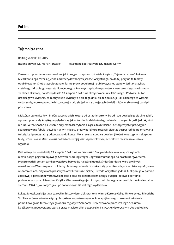 Pol-Int Tajemnicza rana Beitrag vom: 05.08.2015 Rezension von Dr. Marcin Jarząbek Redaktionell betreut von Dr. Justyna Górny Zarówno o powstaniu warszawskim, jak i czołgach napisano już wiele książek. „Tajemnicza rana" Łukasza Mieszkowskiego różni się jednak od zdecydowanej większości wszystkiego, co do tej pory na te tematy opublikowano. Choć przyobleczona w formę pracy popularnej i publicystycznej, stanowi jednak przykład rzetelnego i drobiazgowego studium jednego z krwawych epizodów powstania warszawskiego: tragicznej w skutkach eksplozji, do której doszło 13 sierpnia 1944 r. na skrzyżowaniu ulic Kilińskiego i Podwale. Autor drobiazgowo wyjaśnia, co rzeczywiście wydarzyło o się tego dnia, ale też pokazuje, jak i dlaczego to właśnie wydarzenie, wbrew prawdzie historycznej, stało się jednym z trwających do dziś mitów w zbiorowej pamięci powstania. Niektórzy czytelnicy kryminałów zaczynają ich lekturę od ostatniej strony, by od razu dowiedzieć się „kto zabił", a potem przez całą książkę przyglądać się, jak autor dochodzi do takiego właśnie rozwiązania. Jeśli jednak, ktoś nie lubi w ten sposób psuć sobie przyjemności czytania książek, także książek historycznych z precyzyjnie skonstruowaną fabułą, powinien w tym miejscu przerwać lekturę recenzji, sięgnąć bezpośrednio po omawianą tu książkę i przeczytać ją od początku do końca. Moja recenzja podaje bowiem (i to już w następnym akapicie) fakty, które Łukasz Mieszkowski na kartach swojej książki pieczołowicie, acz celowo niespiesznie ustala i wyjaśnia. Dziś wiemy, że w niedzielę 13 sierpnia 1944 r. na warszawskim Starym Mieście miał miejsce wybuch niemieckiego pojazdu bojowego Schwerer Ladungsträger Bogward IV (zwanego po prostu borgwardem). Przyprowadzili go tam sami powstańcy z barykady, na której utknął. Śmierć poniosło wielu cywilnych mieszkańców Warszawy oraz żołnierzy. Samo wydarzenie doczekało się pomnika, miejsca w historiografii, wielu wspomnieniach, artykułach prasowych oraz literaturze pięknej. Przede wszystkim jednak funkcjonuje w pamięci zbiorowej o powstaniu warszawskim, jako opowieść o niemieckim czołgu-pułapce, celowo i perfidnie podrzuconym przez Niemców. Książka Mieszkowskiego jest i o tym, co i dlaczego rzeczywiście mogło się stać w sierpniu 1944 r., jak i o tym, jak i po co formował się mit tego wydarzenia. Łukasz Mieszkowski jest warszawskim historykiem, doktorantem w Imre-Kertész-Kolleg Uniwersytetu Friedricha Schillera w Jenie, a także artystą plastykiem, współtwórcą m.in. koncepcji nowego muzeum i założenia pomnikowego na terenie byłego obozu zagłady w Sobiborze. Recenzowana praca jest jego debiutem książkowym, przetworzoną wersją pracy magisterskiej powstałej w Instytucie Historycznym UW pod opieką prof. Włodzimierza Borodzieja. Różni się jednak od większości polskich prac magisterskich z historii oraz historycznych książek. W „Tajemniczej ranie" narracja budowana jest jak w powieści detektywistycznej, krótkimi zdaniami, z dygresjami i erudycyjnymi wtrętami, czasem za pomocą plastycznych lub zabarwionych emocjami opisów. Zamiast wstępu z kwestionariuszem badawczym, omówieniem literatury etc. autor zaczyna „jak u Hitchcocka": najpierw wybuch, a potem napięcie stale rośnie. Na pierwszych stronach książki opisuje więc samą eksplozję, potem krok po kroku pokazuje przeinaczenia i zafałszowania w kolejnych relacjach i opisach. Później rysuje najbardziej prawdopodobny scenariusz wydarzeń z 13 sierpnia, by na koniec przejść do analizy mitu „czołgu-pułapki" oraz pokazać je z perspektywy niemieckiej. Taki niekonwencjonalny sposób pisania (widoczny nawet w tytułach rozdziałów) wciąga i rzeczywiście pobudza zainteresowanie czytelnika. Tylko momentami, gdy budowanie napięcia zahacza o przerost formy nad treścią, zwroty typu „detale, o których później" (s. 41) czy pytanie „Czy jednak rzeczywiście zachował zimną krew?" (s. 100) mogą trochę razić i przypominać manierę pewnego popularnego programu telewizyjnego o historii XX wieku. Piszę tu o stylu książki (a to raczej nietypowe, by od kwestii językowych zaczynać recenzję pracy historycznej), bo jest on pierwszą rzeczą, jaka rzuca się czytelnikowi w oczy. Oprócz erudycji i zdolności pisarskich jest ona też, jak sądzę, wyrazem pasji i głębokiego zaangażowania autora w temat, który opisuje. Z równie dużym zaangażowaniem Mieszkowski intepretuje źródła, ze szczegółowością właściwą miłośnikom militariów opisuje różne rodzaje niemieckiego uzbrojenia, widać też, że z dużą znajomością rzeczy porusza się w strukturach i pseudonimach walczących w powstaniu warszawskim oddziałów polskich i niemieckich (raz tylko Witold Piasecki „Wiktor" staje się „Witoldem" – s. 134–135). W książce zestawia i analizuje wiele – rozproszonych, często niełatwo dostępnych – relacji o wydarzeniach ze Starego Miasta: od meldunków powstałych w tym samym dniu aż po oficjalne przemówienia z 2013 r. Ponieważ relacje te różnią się w wielu istotnych szczegółach, Mieszkowski konfrontuje je ze sobą, poddaje krytycznej analizie i – zgodnie z klasycznym kanonem historycznego rzemiosła – wskazuje czytelnikowi, jaki obraz przeszłej rzeczywistości wyłania się z takiej krytycznej, krzyżowej analizy. Odnotujmy zatem rezultaty: autorowi udało się odtworzyć najbardziej prawdopodobny scenariusz wydarzeń z 13 sierpnia 1944 r.; oszacować liczbę ofiar wybuchu; wskazać trzech oficerów Armii Krajowej, z których jeden podjął najprawdopodobniej decyzję o wprowadzeniu borgwarda na Stare Miasto Ponadto Mieszkowski wytłumaczył skąd w ogóle tego typu pojazd znalazł się na ulicach powstańczej Warszawy. Już samo to wystarczyłoby, by uznać jego książkę za wartościową pracę historyczną. Autor idzie jednak dalej i pisze o funkcjonowan