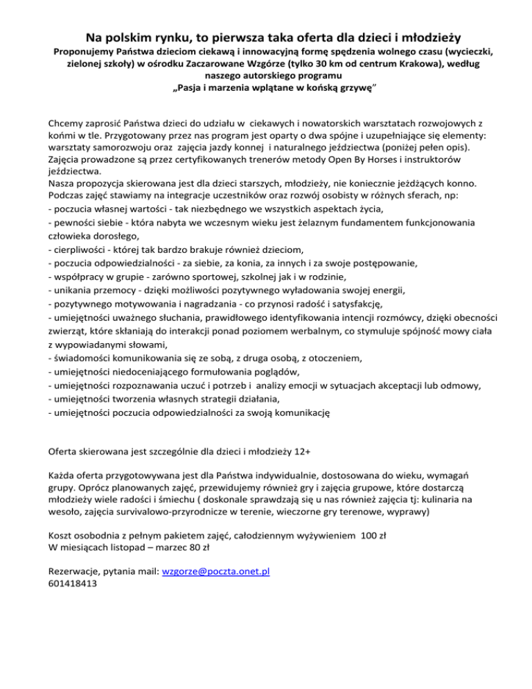 Na polskim rynku, to pierwsza taka oferta dla dzieci i młodzieży Proponujemy Państwa dzieciom ciekawą i innowacyjną formę spędzenia wolnego czasu (wycieczki, zielonej szkoły) w ośrodku Zaczarowane Wzgórze (tylko 30 km od centrum Krakowa), według naszego autorskiego programu „Pasja i marzenia wplątane w końską grzywę” Chcemy zaprosić Państwa dzieci do udziału w ciekawych i nowatorskich warsztatach rozwojowych z końmi w tle. Przygotowany przez nas program jest oparty o dwa spójne i uzupełniające się elementy: warsztaty samorozwoju oraz zajęcia jazdy konnej i naturalnego jeździectwa (poniżej pełen opis). Zajęcia prowadzone są przez certyfikowanych trenerów metody Open By Horses i instruktorów jeździectwa. Nasza propozycja skierowana jest dla dzieci starszych, młodzieży, nie koniecznie jeżdżących konno. Podczas zajęć stawiamy na integracje uczestników oraz rozwój osobisty w różnych sferach, np: - poczucia własnej wartości - tak niezbędnego we wszystkich aspektach życia, - pewności siebie - która nabyta we wczesnym wieku jest żelaznym fundamentem funkcjonowania człowieka dorosłego, - cierpliwości - której tak bardzo brakuje również dzieciom, - poczucia odpowiedzialności - za siebie, za konia, za innych i za swoje postępowanie, - współpracy w grupie - zarówno sportowej, szkolnej jak i w rodzinie, - unikania przemocy - dzięki możliwości pozytywnego wyładowania swojej energii, - pozytywnego motywowania i nagradzania - co przynosi radość i satysfakcję, - umiejętności uważnego słuchania, prawidłowego identyfikowania intencji rozmówcy, dzięki obecności zwierząt, które skłaniają do interakcji ponad poziomem werbalnym, co stymuluje spójność mowy ciała z wypowiadanymi słowami, - świadomości komunikowania się ze sobą, z druga osobą, z otoczeniem, - umiejętności niedoceniającego formułowania poglądów, - umiejętności rozpoznawania uczuć i potrzeb i analizy emocji w sytuacjach akceptacji lub odmowy, - umiejętności tworzenia własnych strategii działania, - umiejętności poczucia odpowiedzialności za swoją komunikację Oferta skierowana jest szczególnie dla dzieci i młodzieży 12+ Każda oferta przygotowywana jest dla Państwa indywidualnie, dostosowana do wieku, wymagań grupy. Oprócz planowanych zajęć, przewidujemy również gry i zajęcia grupowe, które dostarczą młodzieży wiele radości i śmiechu ( doskonale sprawdzają się u nas również zajęcia tj: kulinaria na wesoło, zajęcia survivalowo-przyrodnicze w terenie, wieczorne gry terenowe, wyprawy) Koszt osobodnia z pełnym pakietem zajęć, całodziennym wyżywieniem 100 zł W miesiącach listopad – marzec 80 zł Rezerwacje, pytania mail: [email protected] 601418413 Opis metody 1) Warsztaty samorozwoju (HAE) Horse Assisted Education (HAE) to innowacyjna metoda rozwojowa, w której konie wspomagają rozwój kompetencji osobistych i zawodowych. Jest wykorzystywane z sukcesem w warsztatach rozwoju osobistego w zakresie podnoszenia umiejętności interpersonalnych. Początkowo była wykorzystywana w USA w szkoleniu zespołów zarządzających. Z czasem, jako bardzo skuteczna forma warsztatowa, została włączona w programy rozwojowe dla osób pracujących w działach sprzedaży, negocjatorów, pracowników działów obsługi klienta czy nauczycieli, trenerów jak również młodzieży, osób niepełnosprawnych. Obecnie skutecznie wykorzystuje się ja przede wszystkim w warsztatach samorozwojowych. Dlaczego warsztaty rozwojowe prowadzone metodą HAE Kontakt z końmi integruje nasze myśli, emocje, zmysły i intuicję. Pozwalają w przyjaznych i bezpiecznych warunkach wychodzić uczestnikowi ze swojej „strefy komfortu” i doświadczać siebie samego w „komunikacji bez maski” . Pomagają uczestnikowi znaleźć odpowiedź na elementarne pytania Kim jestem? Kim chciałbym być? Co chcę w życiu osiągnąć? Co tak naprawdę jest dla mnie ważne? I szukać na nie odpowiedzi w sobie i świecie. Podczas warsztatów uczestnicy doświadczają zupełnie nowych sytuacji, które wiele mogą im pokazać i wiele ich nauczyć o nich samych. Dlaczego konie Konie z natury są zwierzętami niewarunkowanymi, z racji wyjątkowej wrażliwości na dostarczane im bodźce pozawerbalne są doskonałym papierkiem lakmusowym ludzkich cech osobowości, a tym samym skutecznym psychoedukacyjnym narzędziem diagnostycznym. Wykorzystanie w procesie szkolenia mechanizmu interakcji KOŃ-CZŁOWIEK ma na celu uzewnętrznienie naszych mocnych i słabszych stron, uzewnętrznienie naszego prawdziwego „JA” w komunikacji bez maski. To jest szkolenie o TOBIE, TWOICH UMIEJĘTNOŚCIACH, KOMPETENCJACH , SPOSOBIE BUDOWANIA RELACJI z innymi Zawartość merytoryczna Każdy warsztat jest przygotowany na miarę potrzeb uczestników. Proponowane ćwiczenia mają na celu rozwój umiejętności psychospołecznych uczestników, a kontakt z końmi ku temu prowadzi. Te warsztaty nie są o koniach, ale o ludziach i obejmują między innymi takie tematy jak: Celem projektu jest diagnoza konkretnych problemów, następnie odpowiednie dopasowanie zajęć, które mają nas zbliżyć do jego rozwiązania. Celem proponowanego programu warsztatów jest wzmocnienie u uczestników poniższych obszarów : świadomości własnych kompetencji komunikacyjnych i przywódczych w relacjach społecznych. umiejętności budowania relacji z innymi komunikacja i świadome przywództwo świadomości swojego własnego „JA” wykraczania poza sferę komfortu. zarządzanie zmianą Uczestnicy wykonują ćwiczenia w asyście koni indywidualnie, w parach, bądź małych grupach. Aktywności dobierane są w zależności od tematyki warsztatów. Po każdym ćwiczeniu z końmi następują: Udzielanie informacji zwrotnej Moderowane dyskusje grupowe Analiza materiału video Transfer doświadczeń z ćwiczenia na życie Warsztaty prowadzone są przez dwóch licencjonowanych trenerów. 2) Zajęcia jazdy konne