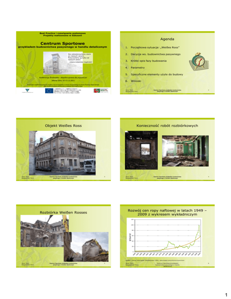 Best Practice i rozwiązania systemowe Projekty realizowane w Saksonii Agenda Centrum Sportowe przykładem budownictwa pasywnego w handlu detalicznym Nie odziedziczyliśmy ziemi po naszych ojcach. Pożyczyliśmy ją tylko od naszych dzieci. (stara indiańska mądrość) 1. Początkowa sytuacja: „Weißes Ross” 2. Decyzja ws. budownictwa pasywnego 3. Krótki opis fazy budowania 4. Parametry 5. Specyficzne elementy użyte do budowy 6. Wnioski Konferencja Środowisko - Wspólna sprawa dla pogranicza! Jelenia Góra, 12-13.12.2011 Projekt jest współfinansowany ze środków Unii Europejskiej w ramach Europejskiego Funduszu Rozwoju Regionalnego oraz środków budżetu państwa przy wsparciu Euroregionu Nysa Jerzy Timm Baugeschäft Timm Objekt Weißes Ross Jerzy Timm Baugeschäft Timm Centrum Sportowe przykładem budownictwa pasywnego w handlu detalicznym Centrum Sportowe przykładem budownictwa pasywnego w handlu detalicznym 2 Konieczność robót rozbiórkowych 3 Jerzy Timm Baugeschäft Timm Centrum Sportowe przykładem budownictwa pasywnego w handlu detalicznym 4 Rozwój cen ropy naftowej w latach 1949 – 2009 z wykresem wykładniczym Rozbiórka Weißen Rosses 120 100 $/barrel 80 60 40 20 0 Quellen: Energy Information Administration (EIA), www.toodoc.com/oil-price-excel.html Jerzy Timm Baugeschäft Timm Centrum Sportowe przykładem budownictwa pasywnego w handlu detalicznym 5 Jerzy Timm Baugeschäft Timm Centrum Sportowe przykładem budownictwa pasywnego w handlu detalicznym 6 1 Gebäudekosten während des Lebenszyklus von 80 Jahren Porównanie opłat za ogrzewanie procentowe koszty całkowite 90% 80% 80% Energiekosten (Energie-, Betriebs- u. Wartungskosten der energietechnischen Anlagen) 70% 60% 50% sonstige Kosten (z.B. Reinigung, Instandhaltung/-setzung und ggf. Finanzierung) 40% 30% 15% 20% 10% 0% Planung Źródło: Dena, pierwszyzna dena-Infopaket dla konsumenta: efektywne budowanie i restaurowanie od a do zet, 2007 Jerzy Timm Baugeschäft Timm 3% 2% Errichtung Folgekosten Abbruch & Entsorgung Quelle: Djahanschah, DBU: FM-Symposium industrieBAU 2008 Centrum Sportowe przykładem budownictwa pasywnego w handlu detalicznym 7 Ważne cechy budownictwa pasywnego Jerzy Timm Baugeschäft Timm Centrum Sportowe przykładem budownictwa pasywnego w handlu detalicznym 8 Położenie kamienia węgielnego 20.07.2007 1. Konstrukcja zewnętrzna bez mostków cieplnych mit U 0,15 W/(m²K) 2. Wbudowane okno mit U 0,85 W/(m²K) 3. Instalacja wentylacyjna z odzyskiwaniem ciepła 75% „Trzeci uderzenie młotem poświęcam idei domu pasywnego i życzę, żeby dzięki tej budowli powstanie wiele domów pasywnych z korzyścia dla środowiska. " 4. Szczelność powietrzna powłoki zewnętrznej przy podciśnieniu i nadcisnienia dochodzącym do 50 Pascali 5. Zapotrzebowanie na energie grzewczą 0,6 h-1 Stanislaw Tillich, saksoński Minister Środowiska und Rolnictwa 15 kWh/(m²a) 6. Zapotrzebowanie na energię pierwotną (m.in. ciepła woda i dom-prąd) 120 kWh/(m²a) Quelle: Passivhausinstitut Darmstadt Jerzy Timm Baugeschäft Timm Centrum Sportowe przykładem budownictwa pasywnego w handlu detalicznym 9 Jerzy Timm Baugeschäft Timm Izolacja budynku Jerzy Timm Baugeschäft Timm Centrum Sportowe przykładem budownictwa pasywnego w handlu detalicznym Centrum Sportowe przykładem budownictwa pasywnego w handlu detalicznym 10 Stan surowy – 1. OG 11 Jerzy Timm Baugeschäft Timm Centrum Sportowe przykładem budownictwa pasywnego w handlu detalicznym 12 2 Roboty ciesielskie: dach spadzisty Jerzy Timm Baugeschäft Timm Attyka-budowa 13 Centrum Sportowe przykładem budownictwa pasywnego w handlu detalicznym WLG Wskaźnik (zasięg) podłoga 24 cm WLG 035 Ub = 0,139 W/(m²K) ściana 22 cm WLG 032 Uw = 0,135 W/(m²K) Ø 33 cm WLG 035 Ud = 0,104 W/(m²K) dach Blower-Door-Test Jerzy Timm Baugeschäft Timm 14 0,12 h-1 Centrum Sportowe przykładem budownictwa pasywnego w handlu detalicznym 15 Jerzy Timm Baugeschäft Timm Okno i system elewacyjny REHAU Polytec 50 PHZ REHAU Clima-Design Futryna okienna Rama 120 mm Uf = 0,71 W/(m²K) Szerokość = 54 / 27 mm Uf = 0,76/0,74 W/(m²K) Jerzy Timm Baugeschäft Timm Centrum Sportowe przykładem budownictwa pasywnego w handlu detalicznym Budowla: Budynek pasywny Intersport Timm Termiczne etui Aspekt budowlany testy Jerzy Timm Baugeschäft Timm Centrum Sportowe przykładem budownictwa pasywnego w handlu detalicznym 16 Oświetlenie • Ruco-Licht-Lampy • Jarzeniówka Osram POWERBALL HCI oświetlenie sklepowe • Oświetlenie z bardzo dużą wydajnością i dobry Lichtbrillianz • Zewnętrzne częściowe oświetlenie LED 3 Scheiben Us = 0,6 W/(m²K) Centrum Sportowe przykładem budownictwa pasywnego w handlu detalicznym 17 Jerzy Timm Baugeschäft Timm Centrum Sportowe przykładem budownictwa pasywnego w handlu detalicznym 18 3 Wnętrze źródeł ciepła Aktywacja rdzenia betonowego Decke über 1.OG Oświetlenie 24 W Sprzęt elektryczny 3W osoby 3W pozostałe 2W Decke über EG und Fußboden OG Betonestrich Dämmung Betondecke PE-Rohre mit Wasser • Roczne zużycie ciepła na chłodzenie około 5.000 kWh • ca. 250 dni w roku jest niezbędne działanie chłodzenia, tylko w kilku dniach w roku jest potrzeba dogrzewania. • Temperatura pomieszczeń w okresie letnim maksymalnie 25 °C, w okresie zimowym przynajmniej 20 °C (w pomieszczeniach biurowych około 23 °C) Jerzy Timm Baugeschäft Timm Centrum Sportowe przykładem budownictwa pasywnego w handlu detalicznym 19 Jerzy Timm Baugeschäft Timm Montaż instalacji do aktywowania rdzenie betonowego Jerzy Timm Baugeschäft Timm Centrum Sportowe przykładem budownictwa pasywnego w handlu detalicznym Centrum Sportowe przykładem budownictwa pasywnego w handlu detalicznym 20 Schemat budynku 21 Jerzy Timm Baugeschäft Timm Prace wiertnicze Centrum Sportowe przykładem budownictwa pasywnego w handlu detalicznym 22 Położenie sond ziemnych • Rozłożenie sond ziemnych w ramach chłodzenia • 10 sond ziemnych zostało wyborowane w w grani