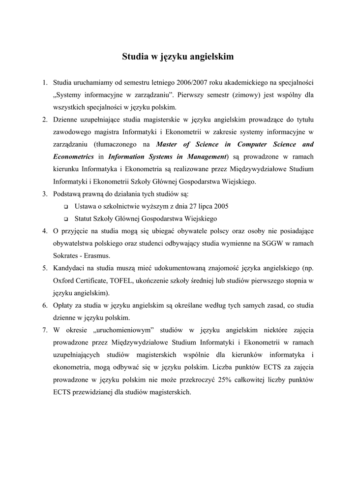 Studia w języku angielskim 1. Studia uruchamiamy od semestru letniego 2006/2007 roku akademickiego na specjalności „Systemy informacyjne w zarządzaniu”. Pierwszy semestr (zimowy) jest wspólny dla wszystkich specjalności w języku polskim. 2. Dzienne uzupełniające studia magisterskie w języku angielskim prowadzące do tytułu zawodowego magistra Informatyki i Ekonometrii w zakresie systemy informacyjne w zarządzaniu (tłumaczonego na Master of Science in Computer Science and Econometrics in Information Systems in Management) są prowadzone w ramach kierunku Informatyka i Ekonometria są realizowane przez Międzywydziałowe Studium Informatyki i Ekonometrii Szkoły Głównej Gospodarstwa Wiejskiego. 3. Podstawą prawną do działania tych studiów są: Ustawa o szkolnictwie wyższym z dnia 27 lipca 2005 Statut Szkoły Głównej Gospodarstwa Wiejskiego 4. O przyjęcie na studia mogą się ubiegać obywatele polscy oraz osoby nie posiadające obywatelstwa polskiego oraz studenci odbywający studia wymienne na SGGW w ramach Sokrates - Erasmus. 5. Kandydaci na studia muszą mieć udokumentowaną znajomość języka angielskiego (np. Oxford Certificate, TOFEL, ukończenie szkoły średniej lub studiów pierwszego stopnia w języku angielskim). 6. Opłaty za studia w języku angielskim są określane według tych samych zasad, co studia dzienne w języku polskim. 7. W okresie „uruchomieniowym” studiów w języku angielskim niektóre zajęcia prowadzone przez Międzywydziałowe Studium Informatyki i Ekonometrii w ramach uzupełniających studiów magisterskich wspólnie dla kierunków informatyka i ekonometria, mogą odbywać się w języku polskim. Liczba punktów ECTS za zajęcia prowadzone w języku polskim nie może przekroczyć 25% całkowitej liczby punktów ECTS przewidzianej dla studiów magisterskich.