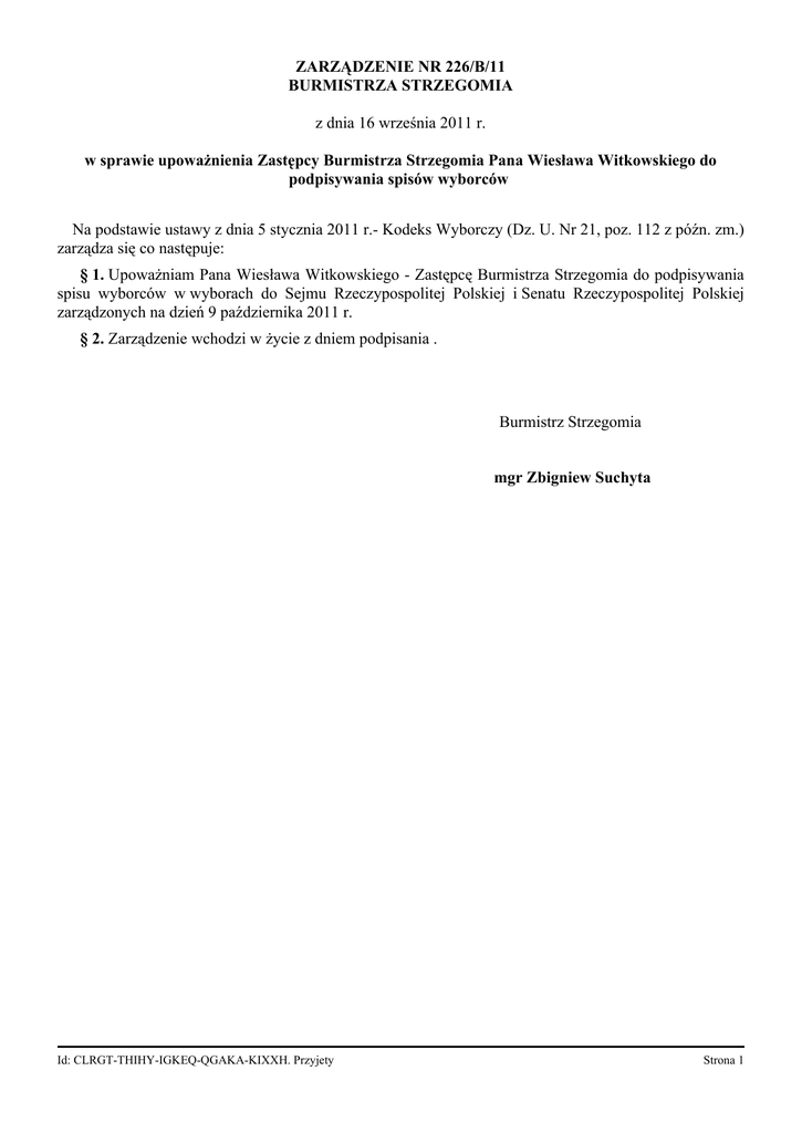 ZARZĄDZENIE NR 226/B/11 BURMISTRZA STRZEGOMIA z dnia 16 września 2011 r. w sprawie upoważnienia Zastępcy Burmistrza Strzegomia Pana Wiesława Witkowskiego do podpisywania spisów wyborców Na podstawie ustawy z dnia 5 stycznia 2011 r. Kodeks Wyborczy (Dz. U. Nr 21, poz. 112 z późn. zm.) zarządza się co następuje: § 1. Upoważniam Pana Wiesława Witkowskiego Zastępcę Burmistrza Strzegomia do podpisywania spisu wyborców w wyborach do Sejmu Rzeczypospolitej Polskiej i Senatu Rzeczypospolitej Polskiej zarządzonych na dzień 9 października 2011 r. § 2. Zarządzenie wchodzi w życie z dniem podpisania . Burmistrz Strzegomia mgr Zbigniew Suchyta Id: CLRGTTHIHYIGKEQQGAKAKIXXH. Przyjety Strona 1 Uzasadnienie do Zarządzenia Nr 226/B/11 Burmistrza Strzegomia zgodnie z ustawą z dnia 5 stycznia 2011 r. Kodeks Wyborczy ( Dz.U. Nr 21, poz.112 z późn. zm. ) Burmistrz może upoważnić Zastępcę Burmistrza lub innego pracownika do podpisywania spisów wyborców w wyborach do Sejmu Rzeczypospolitej Polskiej i Senatu Rzeczypospolitej Polskiej zarządzonych na dzień 9 października 2011 r. Id: CLRGTTHIHYIGKEQQGAKAKIXXH. Przyjety Strona 1