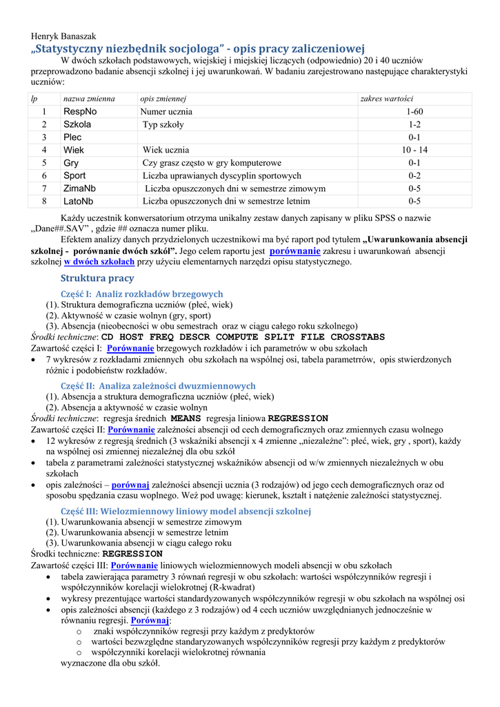 Henryk Banaszak „Statystyczny niezbędnik socjologa” - opis pracy zaliczeniowej W dwóch szkołach podstawowych, wiejskiej i miejskiej liczących (odpowiednio) 20 i 40 uczniów przeprowadzono badanie absencji szkolnej i jej uwarunkowań. W badaniu zarejestrowano następujące charakterystyki uczniów: lp 1 2 3 4 5 6 7 8 nazwa zmienna opis zmiennej RespNo Szkola Plec Wiek Gry Sport ZimaNb LatoNb Numer ucznia Typ szkoły Wiek ucznia Czy grasz często w gry komputerowe Liczba uprawianych dyscyplin sportowych Liczba opuszczonych dni w semestrze zimowym Liczba opuszczonych dni w semestrze letnim zakres wartości 1-60 1-2 0-1 10 - 14 0-1 0-2 0-5 0-5 Każdy uczestnik konwersatorium otrzyma unikalny zestaw danych zapisany w pliku SPSS o nazwie „Dane##.SAV” , gdzie ## oznacza numer pliku. Efektem analizy danych przydzielonych uczestnikowi ma być raport pod tytułem „Uwarunkowania absencji szkolnej - porównanie dwóch szkół”. Jego celem raportu jest porównanie zakresu i uwarunkowań absencji szkolnej w dwóch szkołach przy użyciu elementarnych narzędzi opisu statystycznego. Struktura pracy Część I: Analiz rozkładów brzegowych (1). Struktura demograficzna uczniów (płeć, wiek) (2). Aktywność w czasie wolnyn (gry, sport) (3). Absencja (nieobecności w obu semestrach oraz w ciągu całego roku szkolnego) Środki techniczne: CD HOST FREQ DESCR COMPUTE SPLIT FILE CROSSTABS Zawartość części I: Porównanie brzegowych rozkładów i ich parametrów w obu szkołach • 7 wykresów z rozkładami zmiennych obu szkołach na wspólnej osi, tabela parametrrów, opis stwierdzonych różnic i podobieństw rozkładów. Część II: Analiza zależności dwuzmiennowych (1). Absencja a struktura demograficzna uczniów (płeć, wiek) (2). Absencja a aktywność w czasie wolnyn Środki techniczne: regresja średnich MEANS regresja liniowa REGRESSION Zawartość części II: Porównanie zależności absencji od cech demograficznych oraz zmiennych czasu wolnego • 12 wykresów z regresją średnich (3 wskaźniki absencji x 4 zmienne „niezależne”: płeć, wiek, gry , sport), każdy na wspólnej osi zmiennej niezależnej dla obu szkół • tabela z parametrami zależności statystycznej wskaźników absencji od w/w zmiennych niezależnych w obu szkołach • opis zależności – porównaj zależności absencji ucznia (3 rodzajów) od jego cech demograficznych oraz od sposobu spędzania czasu woplnego. Weź pod uwagę: kierunek, kształt i natężenie zależności statystycznej. Część III: Wielozmiennowy liniowy model absencji szkolnej (1). Uwarunkowania absencji w semestrze zimowym (2). Uwarunkowania absencji w semestrze letnim (3). Uwarunkowania absencji w ciągu całego roku Środki techniczne: REGRESSION Zawartość części III: Porównanie liniowych wielozmiennowych modeli absencji w obu szkołach • tabela zawierająca parametry 3 równań regresji w obu szkołach: wartości współczynników regresji i współczynników korelacji wielokrotnej (R-kwadrat) • wykresy prezentujące wartości standardyzowanych współczynników regresji w obu szkołach na wspólnej osi • opis zależności absencji (każdego z 3 rodzajów) od 4 cech uczniów uwzględnianych jednocześnie w równaniu regresji. Porównaj: o znaki współczynników regresji przy każdym z predyktorów o wartości bezwzględne standaryzowanych współczynników regresji przy każdym z predyktorów o współczynniki korelacji wielokrotnej równania wyznaczone dla obu szkół.