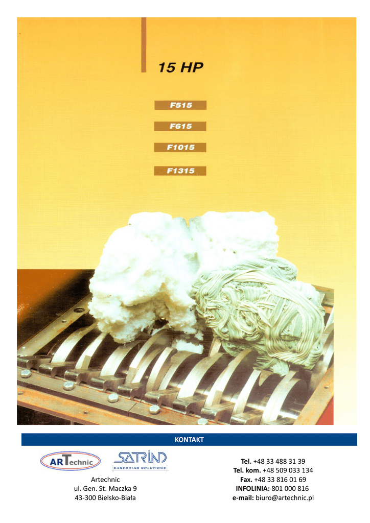 KONTAKT Artechnic ul. Gen. St. Maczka 9 43-300 Bielsko-Biała Tel. +48 33 488 31 39 Tel. kom. +48 509 033 134 Fax. +48 33 816 01 69 INFOLINIA: 801 000 816 e-mail: [email protected] F 515 – F 615 Rozdrabniacze z napędem elektrycznym wyposażone w silnik o mocy 11 kW (15HP). Maszyny te są przewidziane do rozdrabniania materiałów w celu ich odzysku, lub gdy odpady lub śmieci muszą być zniszczone. F 1015 – F 1315 Maszyny te charakteryzują się dużymi komorami niszczącymi, które pozwalają rozdrabniać drewniane i plastikowe palety oraz inne objętościowe odpady i śmieci. Nasze młyny wyposażone są w mechaniczne uszczelnienia wałów, które są bardzo skuteczne przy materiałach szorstkich lub płynach. Dodatkowe uszczelnienia z podwójnymi ściankami i komorą bezpieczeństwa przewidziano w celu zapewnienia jeszcze większej niezawodności systemu uszczelniającego. Plastik: 200 do 500 kg/godz Guma (odpady przemysłowe): 200 do 400 kg/godz Guma (opony samochodowe): 80 do 150 sztuk/godz Metal: 300 do 600 kg/godz Odpady gastronomiczne: 300 do 600 kg/godz Dokumenty poufne: 250 do 350 kg/godz Odpady przemysłowe: 200 do 400 kg/godz F515 F615 F1015 F1315 A 2403 2403 2403 2403 B 1232 1232 1680 1920 C 865 865 865 865 D 1000 1000 1000 1000 E 320 320 320 320 F 1083 1083 1083 1083 G 852 852 1040 1284 H 1800 1800 1800 1800 L 1270 1270 1270 1270 M 1330 1330 1330 1330 N 1380 1380 1568 1812 SPECYFIKACJA TECHNICZNA F515 F615 F1015 F1315 Pojemność zasypu [m3] 0,6 0,7 0,9 1 Otwór komory rozdrabniania [mm] 488 x 620 578 x 620 1028 x 620 1268 x 620 Ilość wałów [szt] 2 2 2 2 Prędkość obrotowa wałów [obr./min] 19/10-15/8 Ostrza 30 mm [szt.] 16 19 34 42 Ostrza 15 mm [szt.] 32 38 68 84 1800 2100 Moc silnika [kW] 11 Napięcie zasilania [V] 220/380/440 Prąd znamionowy [A] 39,3/23/19,9 Waga [kg] 1350 1430 Dane techniczne są poglądowe, producent zastrzega prawo do zmian Gwarancja 12 miesięcy Wszystkie modele mogą być wyposażone w noże o różnej grubości i kształcie KONTAKT Artechnic ul. Gen. St. Maczka 9 43-300 Bielsko-Biała Tel. +48 33 488 31 39 Tel. kom. +48 509 033 134 Fax. +48 33 816 01 69 INFOLINIA: 801 000 816 e-mail: [email protected]