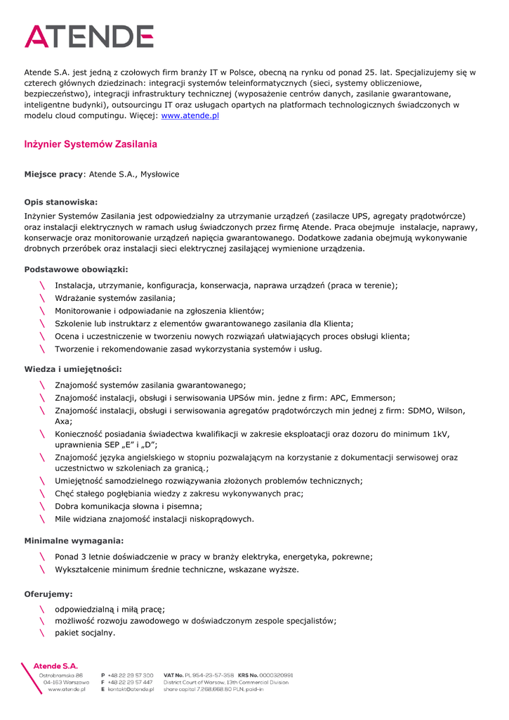 Atende S.A. jest jedną z czołowych firm branży IT w Polsce, obecną na rynku od ponad 25. lat. Specjalizujemy się w czterech głównych dziedzinach: integracji systemów teleinformatycznych (sieci, systemy obliczeniowe, bezpieczeństwo), integracji infrastruktury technicznej (wyposażenie centrów danych, zasilanie gwarantowane, inteligentne budynki), outsourcingu IT oraz usługach opartych na platformach technologicznych świadczonych w modelu cloud computingu. Więcej: www.atende.pl Inżynier Systemów Zasilania Miejsce pracy: Atende S.A., Mysłowice Opis stanowiska: Inżynier Systemów Zasilania jest odpowiedzialny za utrzymanie urządzeń (zasilacze UPS, agregaty prądotwórcze) oraz instalacji elektrycznych w ramach usług świadczonych przez firmę Atende. Praca obejmuje instalacje, naprawy, konserwacje oraz monitorowanie urządzeń napięcia gwarantowanego. Dodatkowe zadania obejmują wykonywanie drobnych przeróbek oraz instalacji sieci elektrycznej zasilającej wymienione urządzenia. Podstawowe obowiązki: \ \ \ \ \ \ Instalacja, utrzymanie, konfiguracja, konserwacja, naprawa urządzeń (praca w terenie); Wdrażanie systemów zasilania; Monitorowanie i odpowiadanie na zgłoszenia klientów; Szkolenie lub instruktarz z elementów gwarantowanego zasilania dla Klienta; Ocena i uczestniczenie w tworzeniu nowych rozwiązań ułatwiających proces obsługi klienta; Tworzenie i rekomendowanie zasad wykorzystania systemów i usług. Wiedza i umiejętności: \ \ \ Znajomość systemów zasilania gwarantowanego; \ Konieczność posiadania świadectwa kwalifikacji w zakresie eksploatacji oraz dozoru do minimum 1kV, uprawnienia SEP „E” i „D”; \ Znajomość języka angielskiego w stopniu pozwalającym na korzystanie z dokumentacji serwisowej oraz uczestnictwo w szkoleniach za granicą.; \ \ \ \ Umiejętność samodzielnego rozwiązywania złożonych problemów technicznych; Znajomość instalacji, obsługi i serwisowania UPSów min. jedne z firm: APC, Emmerson; Znajomość instalacji, obsługi i serwisowania agregatów prądotwórczych min jednej z firm: SDMO, Wilson, Axa; Chęć stałego pogłębiania wiedzy z zakresu wykonywanych prac; Dobra komunikacja słowna i pisemna; Mile widziana znajomość instalacji niskoprądowych. Minimalne wymagania: \ \ Ponad 3 letnie doświadczenie w pracy w branży elektryka, energetyka, pokrewne; Wykształcenie minimum średnie techniczne, wskazane wyższe. Oferujemy: \ odpowiedzialną i miłą pracę; \ możliwość rozwoju zawodowego w doświadczonym zespole specjalistów; \ pakiet socjalny. Prosimy o wysłanie CV oraz listu motywacyjnego z podaniem stanowiska pracy w tytule na adres e-mail: [email protected] Do oferty prosimy dołączyć oświadczenie: "Wyrażam zgodę na przetwarzanie danych osobowych dla potrzeb niezbędnych do realizacji procesu rekrutacji, zgodnie z Ustawą z dnia 29 sierpnia 1997 roku o ochronie danych osobowych (Dz. U. z 1997 r., nr 133, poz. 883)." Uprzejmie informujemy, że kontaktujemy się z wybranymi kandydatami.