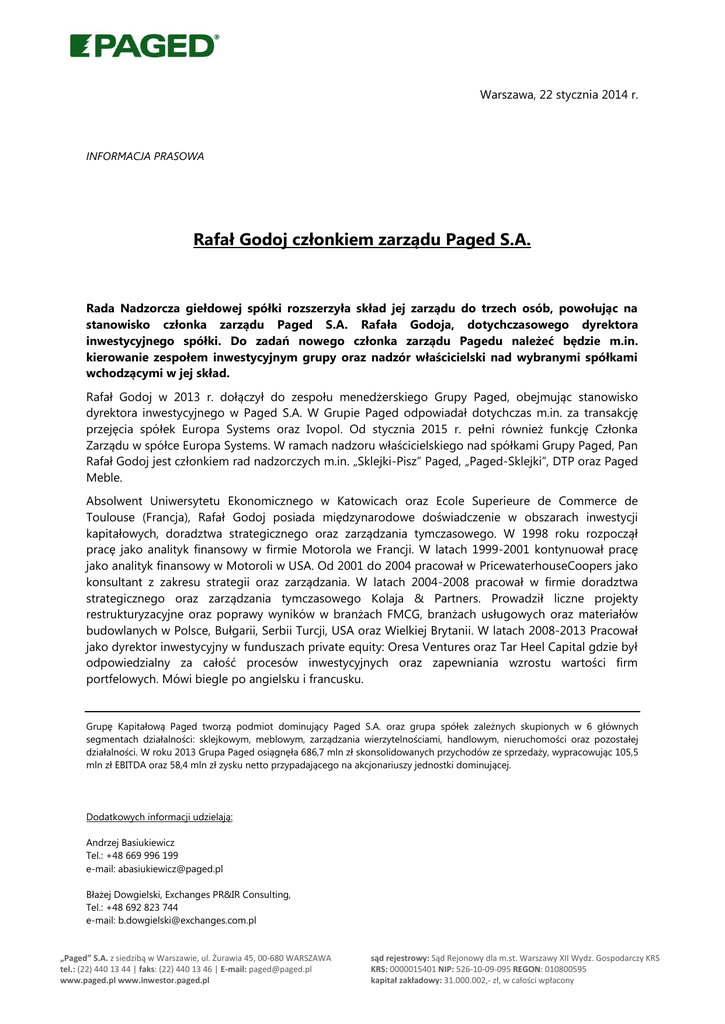 Warszawa, 22 stycznia 2014 r. INFORMACJA PRASOWA Rafał Godoj członkiem zarządu Paged S.A. Rada Nadzorcza giełdowej spółki rozszerzyła skład jej zarządu do trzech osób, powołując na stanowisko członka zarządu Paged S.A. Rafała Godoja, dotychczasowego dyrektora inwestycyjnego spółki. Do zadań nowego członka zarządu Pagedu należeć będzie m.in. kierowanie zespołem inwestycyjnym grupy oraz nadzór właścicielski nad wybranymi spółkami wchodzącymi w jej skład. Rafał Godoj w 2013 r. dołączył do zespołu menedżerskiego Grupy Paged, obejmując stanowisko dyrektora inwestycyjnego w Paged S.A. W Grupie Paged odpowiadał dotychczas m.in. za transakcję przejęcia spółek Europa Systems oraz Ivopol. Od stycznia 2015 r. pełni również funkcję Członka Zarządu w spółce Europa Systems. W ramach nadzoru właścicielskiego nad spółkami Grupy Paged, Pan Rafał Godoj jest członkiem rad nadzorczych m.in. „Sklejki-Pisz” Paged, „Paged-Sklejki”, DTP oraz Paged Meble. Absolwent Uniwersytetu Ekonomicznego w Katowicach oraz Ecole Superieure de Commerce de Toulouse (Francja), Rafał Godoj posiada międzynarodowe doświadczenie w obszarach inwestycji kapitałowych, doradztwa strategicznego oraz zarządzania tymczasowego. W 1998 roku rozpoczął pracę jako analityk finansowy w firmie Motorola we Francji. W latach 1999-2001 kontynuował pracę jako analityk finansowy w Motoroli w USA. Od 2001 do 2004 pracował w PricewaterhouseCoopers jako konsultant z zakresu strategii oraz zarządzania. W latach 2004-2008 pracował w firmie doradztwa strategicznego oraz zarządzania tymczasowego Kolaja & Partners. Prowadził liczne projekty restrukturyzacyjne oraz poprawy wyników w branżach FMCG, branżach usługowych oraz materiałów budowlanych w Polsce, Bułgarii, Serbii Turcji, USA oraz Wielkiej Brytanii. W latach 2008-2013 Pracował jako dyrektor inwestycyjny w funduszach private equity: Oresa Ventures oraz Tar Heel Capital gdzie był odpowiedzialny za całość procesów inwestycyjnych oraz zapewniania wzrostu wartości firm portfelowych. Mówi biegle po angielsku i francusku. Grupę Kapitałową Paged tworzą podmiot dominujący Paged S.A. oraz grupa spółek zależnych skupionych w 6 głównych segmentach działalności: sklejkowym, meblowym, zarządzania wierzytelnościami, handlowym, nieruchomości oraz pozostałej działalności. W roku 2013 Grupa Paged osiągnęła 686,7 mln zł skonsolidowanych przychodów ze sprzedaży, wypracowując 105,5 mln zł EBITDA oraz 58,4 mln zł zysku netto przypadającego na akcjonariuszy jednostki dominującej. Dodatkowych informacji udzielają: Andrzej Basiukiewicz Tel.: +48 669 996 199 e-mail: [email protected] Błażej Dowgielski, Exchanges PR&IR Consulting, Tel.: +48 692 823 744 e-mail: [email protected] „Paged” S.A. z siedzibą w Warszawie, ul. Żurawia 45, 00-680 WARSZAWA tel.: (22) 440 13 44 | faks: (22) 440 13 46 | E-mail: [email protected] www.paged.pl www.inwestor.paged.pl sąd rejestrowy: Sąd Rejonowy dla m.st. Warszawy XII Wydz. Gospodarczy KRS KRS: 0000015401 NIP: 526-10-09-095 REGON: 010800595 kapitał zakładowy: 31.000.002,- zł, w całości wpłacony