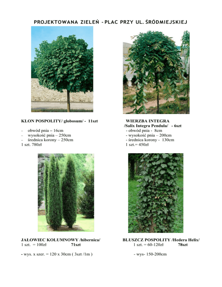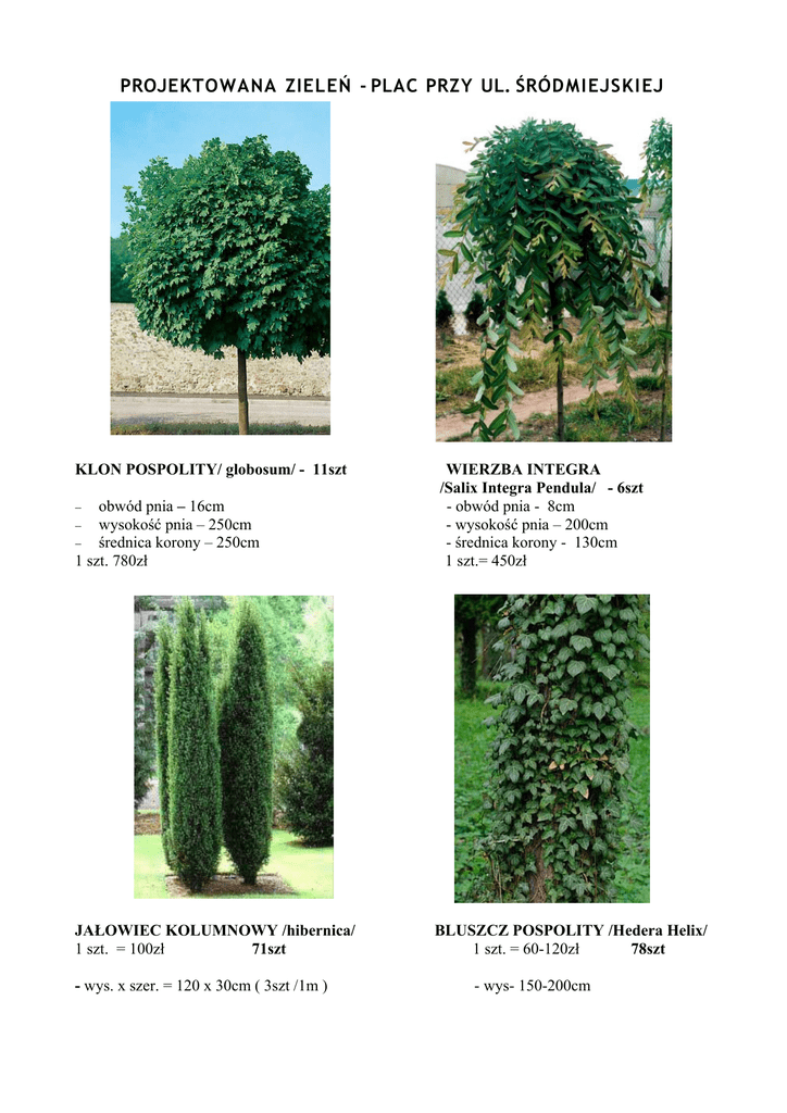 PROJEKTOWANA ZIELEŃ - PLAC PRZY UL. ŚRÓDMIEJSKIEJ KLON POSPOLITY/ globosum/ - 11szt obwód pnia – 16cm − wysokość pnia – 250cm − średnica korony – 250cm 1 szt. 780zł − JAŁOWIEC KOLUMNOWY /hibernica/ 1 szt. = 100zł 71szt - wys. x szer. = 120 x 30cm ( 3szt /1m ) WIERZBA INTEGRA /Salix Integra Pendula/ - 6szt - obwód pnia - 8cm - wysokość pnia – 200cm - średnica korony - 130cm 1 szt.= 450zł BLUSZCZ POSPOLITY /Hedera Helix/ 1 szt. = 60-120zł 78szt - wys- 150-200cm JAŁOWIEC PŁOŻĄCY /wiltonii/ 1 szt. = 17zł 48szt - wys x szer 20 x 30cm TRAWA ROLOWANA 1 szt. cena/m² = 15,50 – 12,00zł ... m² Projektowana zieleń będzie dostarczona na plac budowy w plastikowych kontenerach, które przed nasadzeniem poszczególnych drzew i krzewów zostaną usunięte. PROJEKTOWANA ZIELEŃ OZDOBNA - PRZY POMNIKU POWSTAŃCÓW: − TAWUŁA JAPOŃSKA “GOLDMOUND” - 2 szt. wys. do 80cm , szer. 60cm − BERBERYS THUNBERGA “ATROPURPUREA NANA” - 4 szt. wys do.70cm, szer. 90cm.
