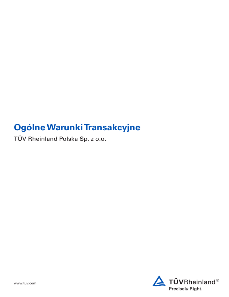 Ogólne Warunki Transakcyjne TÜV Rheinland Polska Sp. z o.o. www.tuv.com 1. Zakres stosowania 1.1 Niniejsze Ogólne Warunki Transakcyjne mają zastosowanie do wszystkich usług świadczonych przez TÜV Rheinland Polska Sp. z o. o. (TRP) w ramach realizacji zleceń oraz innych zobowiązań przewidzianych w umowie, jak również do usług pomocniczych i innych zobowiązań wykonywanych w ramach realizacji umowy, a także regulują zasady współpracy, wzajemne prawa i obowiązki TRP i Klienta. 1.2 Ogólne warunki transakcyjne lub wzorce umowne stosowane przez Klienta, nie wiążą TRP i Klienta we wzajemnych stosunkach handlowych i nie stanowią części umowy, nawet w przypadku gdy Strony wyraźnie nie wyłączą ich stosowania. Strony mogą postanowić, iż ogólne warunki obowiązujące u Klienta lub stosowane przez Klienta, które pozostają w sprzeczności z niniejszymi Ogólnymi Warunkami Transakcyjnymi znajdą zastosowanie we wzajemnych relacjach handlowych między Stronami. 2. Ceny Jeżeli po zawarciu umowy, dojdzie do zmiany okoliczności mających wpływ na wysokość uzgodnionych przez Strony cen usług, TRP będzie uprawniona do zmiany ich wysokości. W takim przypadku, w terminie 7 dni kalendarzowych od otrzymania propozycji zmian, Klient jest uprawniony do przedstawienia na piśmie swoich zastrzeżeń i podjęcia stosownych negocjacji. W razie braku porozumienia, umowa ulega rozwiązaniu, a Strony zobowiązane są do dokonania wzajemnych rozliczeń wynikających z umowy, stosownie do dotychczasowego nakładu pracy. Rozwiązanie umowy z powyższego powodu i niedokończenie usługi nie stanowi podstawy do dochodzenia od TRP jakichkolwiek roszczeń, w tym roszczeń odszkodowawczych. 3. Wejście w życie i czas trwania umowy Umowa wchodzi w życie na czas uzgodniony przez Strony z chwilą udzielenia TRP zlecenia przez Klienta. Zlecenie powinno być udzielone w formie pisemnej. Podstawą zlecenia jest oferta przedstawiona Klientowi przez TRP. Do zawarcia umowy dochodzi również w momencie podpisania przez obie Strony umowy będącej odrębnym dokumentem. 4. Zakres usług 4.1 O zakresie usług decyduje treść zgodnych oświadczeń woli Stron w postaci pisemnej umowy, a w przypadku jej braku, zlecenie udzielone przez Klienta na podstawie oferty TRP. 4.2 Usługi realizowane są zgodnie z ogólnie przyjętymi rozwiązaniami technicznymi i w oparciu o przepisy prawa i postanowienia norm krajowych i międzynarodowych lub specyfikacji TRP, obowiązujących w momencie zawarcia umowy. Usługi mogą być realizowane w oparciu o posiadane przez TRP akredytacje. 2 4.3 TRP jest uprawniona do określenia metod świadczenia usług, chyba, że co innego uzgodniono w formie pisemnej lub gdy bezwzględnie obowiązujące przepisy wymagają szczególnej procedury, której należy przestrzegać. 5. Miejsce i termin realizacji usług 5.1 Miejsce i termin realizacji usług zostaną ustalone na podstawie indywidualnych uzgodnień Stron z uwzględnieniem wymagań co do dokumentów odniesienia będących podstawą realizacji usług oraz w oparciu o szacunkową ocenę prac koniecznych do przeprowadzenia, dokonaną na podstawie danych dostarczonych przez Klienta. 5.2 Jeśli zostały uzgodnione terminy realizacji usług, terminy te rozpoczną się od chwili doręczenia TRP przez Klienta wszystkich wymaganych dokumentów oraz udzielenia niezbędnych informacji lub spełnienia przez Klienta innych czynności potrzebnych do świadczenia usług przez TRP. Terminy i zakresy wykonania usług zostaną przedłużone, względnie odpowiednio zmodyfikowane lub uzgodnione od nowa, jeżeli usługi TRP nie mogą być świadczone z przyczyn niezależnych od którejkolwiek ze Stron. Jeżeli do przedłużenia czasu świadczenia usługi dojdzie z przyczyn zawinionych wyłącznie przez TRP, Strony uzgodnią odpowiedni dodatkowy termin na wykonanie usługi. Jeśli z przyczyn zawinionych wyłącznie przez TRP nie dojdzie do wykonania usługi również w tym terminie, Klient będzie uprawniony do rozwiązania umowy w trybie natychmiastowym. Strony zobowiązane są wówczas do dokonania wzajemnych rozliczeń za wykonane już usługi. 5.3 Jeżeli z przyczyn, za które odpowiedzialność ponosi Klient - w tym także z powodu nieterminowego, nierzetelnego lub niepełnego przekazania materiałów, danych i informacji, konieczna będzie powtórna realizacja prac lub niemożliwa będzie terminowa realizacja usługi (tzw. czas przestoju), TRP uprawniona jest do żądania dodatkowego wynagrodzenia, w wysokości adekwatnej do czasu dodatkowo poświęconego na wykonanie usługi, obejmującego również czas gotowości do realizacji zadań. Obciążenie Klienta dodatkowymi kosztami w sytuacji, o której mowa w poprzednim zdaniu, jest możliwe pomimo uzgodnienia ceny końcowej lub maksymalnej zlecenia. 6. Współdziałanie 6.1 Klient gwarantuje, że wszelka współpraca wymagana z jego strony, ze strony jego przedstawicieli, w tym pracowników lub osób trzecich, będzie udzielana w odpowiednim czasie i bez ponoszenia żadnych kosztów przez TRP. 6.2 Dokumentacja projektowa, materiały, personel pomocniczy itd., niezbędne do realizacji usług zostaną udostępnione TRP przez Klienta nieodpłatnie. Ponadto, Klient jest zobowiązany zapewnić współpracę wymaganą przepisami prawa, normami, przepisami bezpieczeństwa i instrukcjami zapobiegania wypadkom. Aktualizacja: 06.02.2014 r 6.3 Klient będzie ponosić wszelkie dodatkowe koszty wynikłe z konieczności ponownego wykonania prac lub ich opóźnienia w wyniku nieterminowego udzielenia informacji, udzielenia informacji nieprawidłowych lub niekompletnych oraz braku zapewnienia właściwej współpracy. Klient będzie zobowiązany do uiszczenia wszelkich dodatkowych kosztów powstałych z powyższych przyczyn, również w przypadku ustalenia stałego lub maksymalnego wynagrodzenia z tytułu świadczenia usług. 6.4 TRP wykona usługi będące przedmiotem umowy przy pomocy swoich pracownik