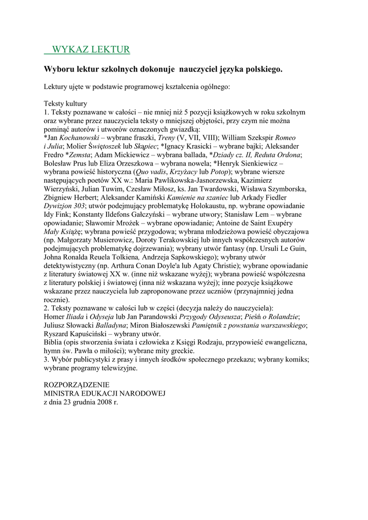 WYKAZ LEKTUR Wyboru lektur szkolnych dokonuje nauczyciel języka polskiego. Lektury ujęte w podstawie programowej kształcenia ogólnego: Teksty kultury 1. Teksty poznawane w całości – nie mniej niż 5 pozycji książkowych w roku szkolnym oraz wybrane przez nauczyciela teksty o mniejszej objętości, przy czym nie można pominąć autorów i utworów oznaczonych gwiazdką: *Jan Kochanowski – wybrane fraszki, Treny (V, VII, VIII); William Szekspir Romeo i Julia; Molier Świętoszek lub Skąpiec; *Ignacy Krasicki – wybrane bajki; Aleksander Fredro *Zemsta; Adam Mickiewicz – wybrana ballada, *Dziady cz. II, Reduta Ordona; Bolesław Prus lub Eliza Orzeszkowa – wybrana nowela; *Henryk Sienkiewicz – wybrana powieść historyczna (Quo vadis, Krzyżacy lub Potop); wybrane wiersze następujących poetów XX w.: Maria Pawlikowska-Jasnorzewska, Kazimierz Wierzyński, Julian Tuwim, Czesław Miłosz, ks. Jan Twardowski, Wisława Szymborska, Zbigniew Herbert; Aleksander Kamiński Kamienie na szaniec lub Arkady Fiedler Dywizjon 303; utwór podejmujący problematykę Holokaustu, np. wybrane opowiadanie Idy Fink; Konstanty Ildefons Gałczyński – wybrane utwory; Stanisław Lem – wybrane opowiadanie; Sławomir Mrożek – wybrane opowiadanie; Antoine de Saint Exupéry Mały Książę; wybrana powieść przygodowa; wybrana młodzieżowa powieść obyczajowa (np. Małgorzaty Musierowicz, Doroty Terakowskiej lub innych współczesnych autorów podejmujących problematykę dojrzewania); wybrany utwór fantasy (np. Ursuli Le Guin, Johna Ronalda Reuela Tolkiena, Andrzeja Sapkowskiego); wybrany utwór detektywistyczny (np. Arthura Conan Doyle'a lub Agaty Christie); wybrane opowiadanie z literatury światowej XX w. (inne niż wskazane wyżej); wybrana powieść współczesna z literatury polskiej i światowej (inna niż wskazana wyżej); inne pozycje książkowe wskazane przez nauczyciela lub zaproponowane przez uczniów (przynajmniej jedna rocznie). 2. Teksty poznawane w całości lub w części (decyzja należy do nauczyciela): Homer Iliada i Odyseja lub Jan Parandowski Przygody Odyseusza; Pieśń o Rolandzie; Juliusz Słowacki Balladyna; Miron Białoszewski Pamiętnik z powstania warszawskiego; Ryszard Kapuściński – wybrany utwór. Biblia (opis stworzenia świata i człowieka z Księgi Rodzaju, przypowieść ewangeliczna, hymn św. Pawła o miłości); wybrane mity greckie. 3. Wybór publicystyki z prasy i innych środków społecznego przekazu; wybrany komiks; wybrane programy telewizyjne. ROZPORZĄDZENIE MINISTRA EDUKACJI NARODOWEJ z dnia 23 grudnia 2008 r.