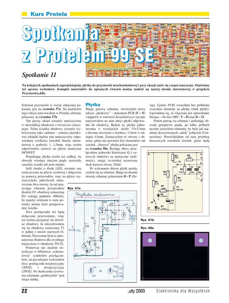 Kurs Protela Spotkania z Protelem 99 SE Spotkanie 11 Na kolejnych spotkaniach zaprojektujemy płytkę do przystawki uruchomieniowej i przy okazji znów się czegoś nauczymy. Omówimy też sprawę wydruków. Komplet materiałów do opisanych ćwiczeń można znaleźć na naszej stronie internetowej w projekcie Przystawka.ddb. Schemat przystawki w wersji odręcznej po− kazany jest na rysunku 57a. Na podstawie tego szkicu narysowałem w Protelu schemat, pokazany na rysunku 57b. Ten prosty układ zostanie umieszczony w niewielkiej obudowie z tworzywa sztucz− nego. Tylna ścianka obudowy zostanie wy− korzystana jako radiator − zamiast plastiko− wej wkładki będzie tam umieszczony odpo− wiedniej wielkości kawałek blachy alumi− niowej o grubości 1...1,5mm, więc trzeba odpowiednio ustawić na płytce tranzystor MOSFET. Projektując płytkę trzeba też zadbać, by obwody wiodące znaczne prądy zawierały szerokie ścieżki lub pola miedzi. Jeśli chodzi o diodę LED, zostanie ona umieszczona na płycie czołowej i dołączona za pomocą przewodów, więc na płytce wy− starczyłyby jakkolwiek umie− szczone dwa otwory. Ja od razu, rysując schemat, przypisałem Rys. 57a diodzie D1 obudowę oznaczoną D4 (odstęp punktów 400mil), by między nóżkami w razie po− trzeby można było przeprowa− dzić ścieżki. Dwa przełączniki też będą dołączone przewodami, więc też można przypisać im dowol− ne obudowy. Ja zdecydowałem się na obudowę oznaczoną T2 w jednej z moich starszych bi− bliotek. Pierwotnie była to alter− natywna obudowa dla zwykłego tranzystora w obudowie TO−92. Ponieważ nie miałem do− tychczas w bibliotece „schema− towej” symbolów przełączni− ków, na poczekaniu wykonałem dwa: przełącznik trzypozycyjny (3POZ) i dwupozycyjny (2POZ). Po skończeniu rysowa− nia schematu „podłożyłem” pod niego ramkę. 22 Płytka Mając gotowy schemat, stworzyłem nowy arkusz „płytkowy” – dokument PCB (F – N) i najpierw w warstwie KeepOutLayer ręcznie narysowałem na nim obrys płytki odpowie− dni do obudowy. Będzie to, płytka jedno− stronna o wymiarach około 53x37mm z dwoma otworami o średnicy 3,2mm w od− stępie 41mm. Zaznaczyłem te otwory i ob− szary, gdzie nie powinno być elementów ani ścieżek. „Surowa” płytka pokazana jest na rysunku 58a. Rysując obrys, prze− łączałem jednostki klawiszem Q z ca− lowych (milsów) na metryczne (mili− metry), mając wcześniej ustawiony skok kursora równy 25mil. Po wykonaniu obrysu płytki przełą− czyłem się na schemat. Mając na ekranie otwarty schemat, poleceniem D − P (De− sign, Update PCB) wrzuciłem bez problemu wszystkie elementy na płytkę (obok płytki). Upewniłem się, że włączone jest sprawdzanie bieżące − On−line DRC: T – D oraz D – O. Potem patrząc na schemat i analizując ob− wody przepływu prądu, po kilku próbach ręcznie ustawiłem elementy, by było jak naj− mniej skrzyżowanych „nitek” połączeń (Con− nections). Przewidziałem od razu przebieg kluczowych szerokich ścieżek, gdzie będą Rys. 57b Rys. 58a Elektronika dla Wszystkich Kurs Protela płynąć znaczne prądy i od razu zdecydowa− łem, że na płytce będzie jedna krótka zwora ze źródła tranzystora do kondensatora C3. Tranzystor mocy umieściłem przy tej krawę− dzi płytki, obok której umieszczony będzie radiator. Wstępny układ elementów pokaza− ny jest na rysunku 58b. Rys. 58b Przed poprowadzeniem ścieżek trzeba wprowadzić szereg zmian. Przede wszystkim trzeba powiększyć punkty lutownicze, do których przewodami zostaną dołączone prze− łączniki J1 i J2. Punkty i punkciki Przy tego typu operacjach będziemy korzy− stać z selekcji, czyli wybiórczego zaznacza− nia niektórych elementów. W dalszej części kursu będę wymiennie używał określeń za− znaczenie i selekcja. Elementy można zazna− Rys. 59 Rys. 60 Elektronika dla Wszystkich czyć (wybrać, podświetlić, wyselekcjono− wać), klikając na nie z wciśniętym klawi− szem Shift (Shift + kliknięcie). Jeśli elementy są rozmieszczone luźno, można też kliknąć i trzymając klawisz myszy przeciągnąć kur− sor, zaznaczając prostokąt – objęte nim ele− menty zostaną wybrane i zaznaczone. Można też zaznaczyć naciskając klawisze E – S lub krócej po prostu S i wybrać opcję (np. Inside Area). Polecam dwa pierwsze sposo− by: Shift+kliknięcie oraz przeciąga− nie myszą. Zaznacz więc prze− łączniki J1 i J2, jak po− kazuje rysunek 59 i podwójnie kliknij na dowolnym z zaznaczonych punktów, by otwo− rzyć okno z właściwościami tego punktu. Ponieważ chcemy zmienić właściwości nie tylko tego punktu, więc koniecznie kliknij przycisk Global, by rozwinąć szersze okno. Okno to wręcz przeraża wielu po− czątkujących, ale Ty jak zwykle zachowaj spokój. Okno wcale nie jest straszne, a za to oka− zuje się niezmiernie pożyteczne, oferując nie− samowite możliwości, z których zresztą bę− dziesz wykorzystywać tylko malutką część. Najpierw zastanów się, co chcemy zmie− nić: średnice i otwory we wszystkich punk− tach obu zaznaczonych elementów. Wpisz (dwukrotnie) średnicę punktu np. 120mil i (raz) średnicę otworu, np. 40mil w odpowie− dnie okienka. Na rysunku 60 odpowiednie okienka zaznaczyłem kolorem niebieskim. Zwróć uwagę, że automatycznie zostały za− znaczone odpowiednie okienka z prawej stro− ny − co ja zaznaczyłem kolorem żółtym. Zna− czy to, że do wszystkich zmienianych punk− tów skopiowane zostaną te zaznaczone atry− buty: zmienione zostaną rozmiary punktów i średnice otworów. Tym sposobem poznałeś przeznaczenie okienek z prawej strony ramki – określasz tu, co będzie zmieniane. Na razie jeszcze nie ustaliłeś, jakich obiektów (punktów lutowni− czych) dotyczyć będą zmia− ny. Czy wszystkich punktów na płytce? Nie, w tym prz