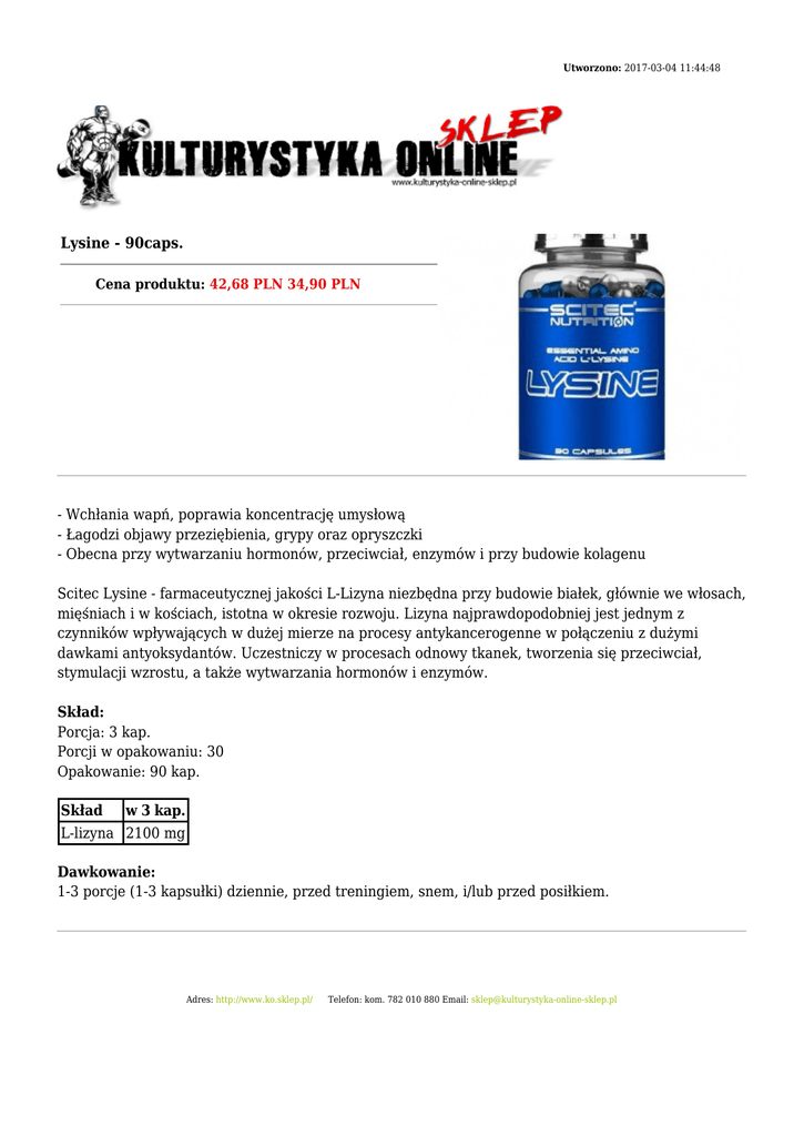 Utworzono: 2017-03-04 11:44:48 Lysine - 90caps. Cena produktu: 42,68 PLN 34,90 PLN - Wchłania wapń, poprawia koncentrację umysłową - Łagodzi objawy przeziębienia, grypy oraz opryszczki - Obecna przy wytwarzaniu hormonów, przeciwciał, enzymów i przy budowie kolagenu Scitec Lysine - farmaceutycznej jakości L-Lizyna niezbędna przy budowie białek, głównie we włosach, mięśniach i w kościach, istotna w okresie rozwoju. Lizyna najprawdopodobniej jest jednym z czynników wpływających w dużej mierze na procesy antykancerogenne w połączeniu z dużymi dawkami antyoksydantów. Uczestniczy w procesach odnowy tkanek, tworzenia się przeciwciał, stymulacji wzrostu, a także wytwarzania hormonów i enzymów. Skład: Porcja: 3 kap. Porcji w opakowaniu: 30 Opakowanie: 90 kap. Skład w 3 kap. L-lizyna 2100 mg Dawkowanie: 1-3 porcje (1-3 kapsułki) dziennie, przed treningiem, snem, i/lub przed posiłkiem. Adres: http://www.ko.sklep.pl/ Telefon: kom. 782 010 880 Email: [email protected]