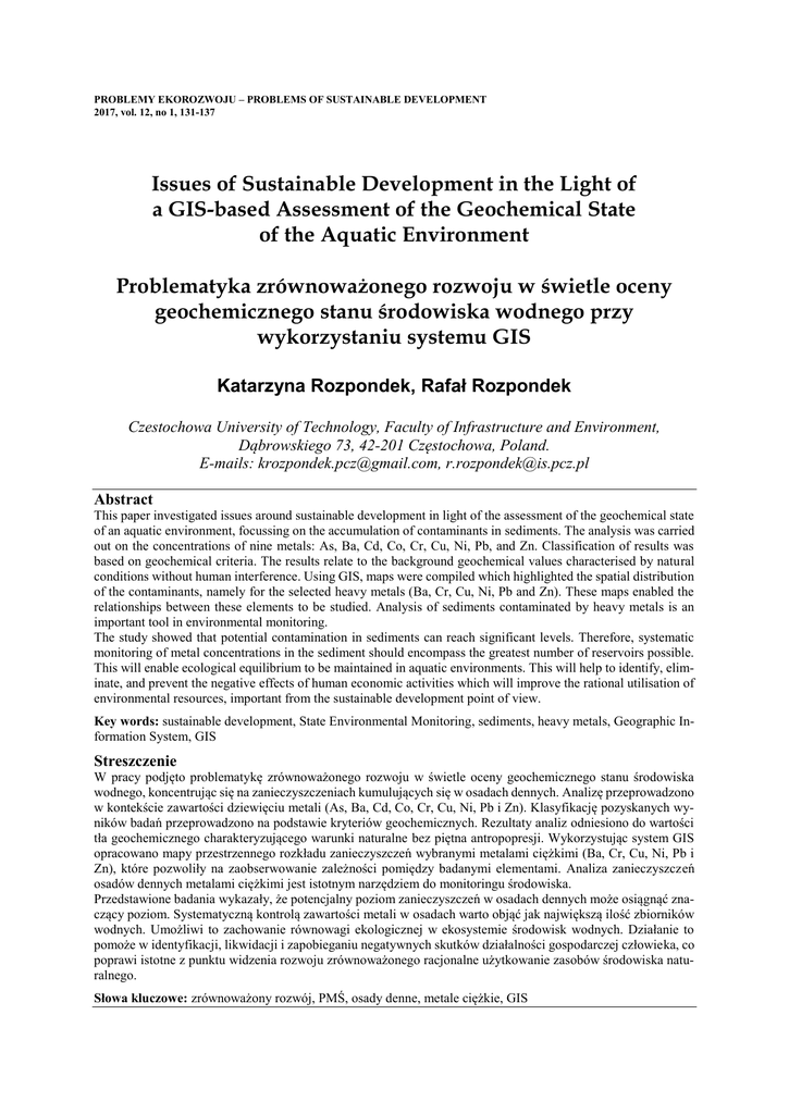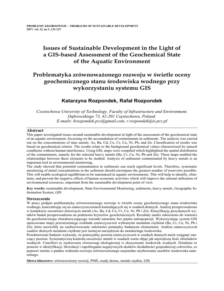 PROBLEMY EKOROZWOJU – PROBLEMS OF SUSTAINABLE DEVELOPMENT 2017, vol. 12, no 1, 131-137 Issues of Sustainable Development in the Light of a GIS-based Assessment of the Geochemical State of the Aquatic Environment Problematyka zrównoważonego rozwoju w świetle oceny geochemicznego stanu środowiska wodnego przy wykorzystaniu systemu GIS Katarzyna Rozpondek, Rafał Rozpondek Czestochowa University of Technology, Faculty of Infrastructure and Environment, Dąbrowskiego 73, 42-201 Częstochowa, Poland. E-mails: [email protected], [email protected] Abstract This paper investigated issues around sustainable development in light of the assessment of the geochemical state of an aquatic environment, focussing on the accumulation of contaminants in sediments. The analysis was carried out on the concentrations of nine metals: As, Ba, Cd, Co, Cr, Cu, Ni, Pb, and Zn. Classification of results was based on geochemical criteria. The results relate to the background geochemical values characterised by natural conditions without human interference. Using GIS, maps were compiled which highlighted the spatial distribution of the contaminants, namely for the selected heavy metals (Ba, Cr, Cu, Ni, Pb and Zn). These maps enabled the relationships between these elements to be studied. Analysis of sediments contaminated by heavy metals is an important tool in environmental monitoring. The study showed that potential contamination in sediments can reach significant levels. Therefore, systematic monitoring of metal concentrations in the sediment should encompass the greatest number of reservoirs possible. This will enable ecological equilibrium to be maintained in aquatic environments. This will help to identify, eliminate, and prevent the negative effects of human economic activities which will improve the rational utilisation of environmental resources, important from the sustainable development point of view. Key words: sustainable development, State Environmental Monitoring, sediments, heavy metals, Geographic Information System, GIS Streszczenie W pracy podjęto problematykę zrównoważonego rozwoju w świetle oceny geochemicznego stanu środowiska wodnego, koncentrując się na zanieczyszczeniach kumulujących się w osadach dennych. Analizę przeprowadzono w kontekście zawartości dziewięciu metali (As, Ba, Cd, Co, Cr, Cu, Ni, Pb i Zn). Klasyfikację pozyskanych wyników badań przeprowadzono na podstawie kryteriów geochemicznych. Rezultaty analiz odniesiono do wartości tła geochemicznego charakteryzującego warunki naturalne bez piętna antropopresji. Wykorzystując system GIS opracowano mapy przestrzennego rozkładu zanieczyszczeń wybranymi metalami ciężkimi (Ba, Cr, Cu, Ni, Pb i Zn), które pozwoliły na zaobserwowanie zależności pomiędzy badanymi elementami. Analiza zanieczyszczeń osadów dennych metalami ciężkimi jest istotnym narzędziem do monitoringu środowiska. Przedstawione badania wykazały, że potencjalny poziom zanieczyszczeń w osadach dennych może osiągnąć znaczący poziom. Systematyczną kontrolą zawartości metali w osadach warto objąć jak największą ilość zbiorników wodnych. Umożliwi to zachowanie równowagi ekologicznej w ekosystemie środowisk wodnych. Działanie to pomoże w identyfikacji, likwidacji i zapobieganiu negatywnych skutków działalności gospodarczej człowieka, co poprawi istotne z punktu widzenia rozwoju zrównoważonego racjonalne użytkowanie zasobów środowiska naturalnego. Słowa kluczowe: zrównoważony rozwój, PMŚ, osady denne, metale ciężkie, GIS A 132 Rozpondek & Rozpondek /Problemy Ekorozwoju/Problems of Sustainable Development 1/2017, 131-137 Introduction The current commonly used definition of sustainable development was introduced in the 1987 report Our Common Future by the United Nations World Commission on Environment and Development. It was defined as development that meets the needs of current generations without compromising the ability of future generations to meet their own needs (WCED, 1987). Sustainable development is considered on three levels: economic, social and environmental. The interactions between these aspects should be harmonious and non-invasive in relation to the remaining spheres (Miksch, 2015). Unfortunately, civilisation’s dynamic progress, based on continuous growth in the consumption of goods and services, fossil fuels, the development of the automotive industry, mass production of single-use products, and accumulation of waste is often done without respecting the values and resources of the natural environment (Pawłowski, 2009; Sobczyk et al., 2012). As a result of these activities many pollutants are produced. Among them, heavy metals play a specific role, not only because of their potential toxicity, but also because once they enter into the environment they are practically impossible to remove. They remain in the natural environment circulating between its various components. This has a particularly important significance in relation to aquatic ecosystems. Rising heavy metal concentrations in oceans and seas could undermine the proper functioning of trophic chains. An example might be the inhibition of plankton growth which may result in a reduction in fish populations. Pollution associated with coal combustion, such as mercury emissions, also applies to water. In the United States, approximately 50,000 lakes, streams and ponds contain water unfit for human consumption due to their high mercury content (Berdo, 2006; Pawłowski, 2011). Elevated concentrations of heavy metals in the natural environment can cause serious health consequences, not only for current generations, but also for future ones. This paper highlights the risks associated with the accumulation of contaminants in sediments. They provide sensitive pollution monitoring indicators (Vandecasteel, 2004). The majority of potentially harmful metals and organic compounds are retained in sediments which find their way to the surfac