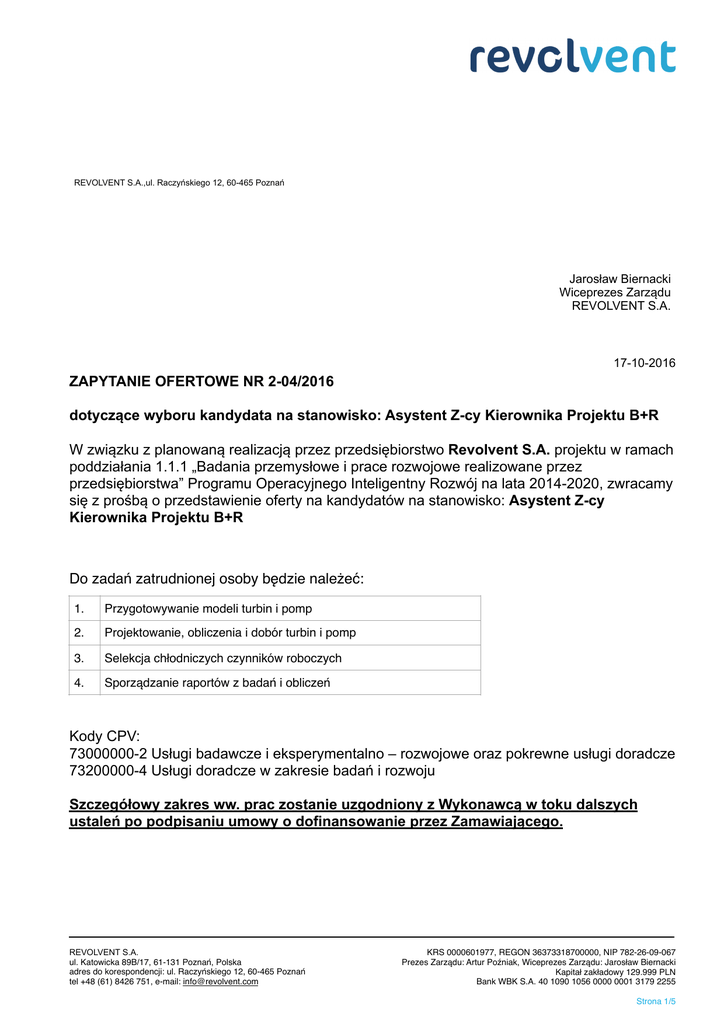 REVOLVENT S.A.,ul. Raczyńskiego 12, 60-465 Poznań Jarosław Biernacki Wiceprezes Zarządu REVOLVENT S.A. 17-10-2016 ZAPYTANIE OFERTOWE NR 2-04/2016 dotyczące wyboru kandydata na stanowisko: Asystent Z-cy Kierownika Projektu B+R W związku z planowaną realizacją przez przedsiębiorstwo Revolvent S.A. projektu w ramach poddziałania 1.1.1 „Badania przemysłowe i prace rozwojowe realizowane przez przedsiębiorstwa” Programu Operacyjnego Inteligentny Rozwój na lata 2014-2020, zwracamy się z prośbą o przedstawienie oferty na kandydatów na stanowisko: Asystent Z-cy Kierownika Projektu B+R Do zadań zatrudnionej osoby będzie należeć: 1. Przygotowywanie modeli turbin i pomp 2. Projektowanie, obliczenia i dobór turbin i pomp 3. Selekcja chłodniczych czynników roboczych 4. Sporządzanie raportów z badań i obliczeń Kody CPV: 73000000-2 Usługi badawcze i eksperymentalno – rozwojowe oraz pokrewne usługi doradcze 73200000-4 Usługi doradcze w zakresie badań i rozwoju Szczegółowy zakres ww. prac zostanie uzgodniony z Wykonawcą w toku dalszych ustaleń po podpisaniu umowy o dofinansowanie przez Zamawiającego. REVOLVENT S.A. ul. Katowicka 89B/17, 61-131 Poznań, Polska adres do korespondencji: ul. Raczyńskiego 12, 60-465 Poznań tel +48 (61) 8426 751, e-mail: [email protected] KRS 0000601977, REGON 36373318700000, NIP 782-26-09-067 Prezes Zarządu: Artur Poźniak, Wiceprezes Zarządu: Jarosław Biernacki Kapitał zakładowy 129.999 PLN Bank WBK S.A. 40 1090 1056 0000 0001 3179 2255 Strona 1/5 Zamawiający Revolvent SA ul. Katowicka 89B/17 61-131 Poznań Data ogłoszenia zapytania ofertowego 17.10.2016 Data złożenia oferty Oferty można składać do dnia 27.10.2016dogodziny15:00. Okres realizacji umowy 24-36 miesięcy. Zostanie dokładnie określony wraz z podpisaniem właściwej umowy zlecenie po podpisaniu przez Zamawiającego umowy o dofinansowanie projektu. Rodzaj umowy Umowa - zlecenie, rozliczenie miesięczne. Zamawiający przewidział, iż realizacja zlecenia będzie trwała 40godzin miesięcznie. Umowa zlecenie będzie miała charakter odnawialny w okresie trwania projektu. Miejsce pracy Zostanie dokładnie określony wraz z podpisaniem właściwej umowy zlecenie po podpisaniu przez Zamawiającego umowy o dofinansowanie projektu. Warunki udziału w postępowaniu: O udzielenie zamówienia może ubiegać się Wykonawca, który: 1) Posiada następujące doświadczenie: projektowanie i badanie turbin oraz innych silników cieplnych w szczególności w układach ORC 2) Posiada minimum wykształcenie: wyższe 3) Posiada doświadczenie w publikacjach naukowych związanych z tematem projektu: wymagane 4) Posiada doświadczenie w realizacji projektów naukowo-badawczych: minimum 2 w ostatnich 5 latach REVOLVENT S.A. ul. Katowicka 89B/17, 61-131 Poznań, Polska adres do korespondencji: ul. Raczyńskiego 12, 60-465 Poznań tel +48 (61) 8426 751, e-mail: [email protected] KRS 0000601977, REGON 36373318700000, NIP 782-26-09-067 Prezes Zarządu: Artur Poźniak, Wiceprezes Zarządu: Jarosław Biernacki Kapitał zakładowy 129.999 PLN Bank WBK S.A. 40 1090 1056 0000 0001 3179 2255 Strona 2/5 Kryteria wyboru oferty Zamawiający po dokonaniu oceny nadesłanych ofert zaproponuje oferentowi, który przedstawił najkorzystniejszą ofertę, podpisanie umowy zlecenia. Opis sposobu przyznania punktacji za spełnienie danego kryterium oceny: Ad.1.Liczbapunktówwkryterium„CenawynagrodzenianeAoza1 godzinę pracy (w odniesieniu do ilości godzin w miesiącu przewidzianych przez Zlecającego na wykonanie zadania)” będzie przyznawana według przedstawionego poniżej wzoru: Pi=Cmin/Ci x 100% x 100. Podane wartości oznaczają: Pi - liczba punktów dla oferty nr „i’ w kryterium „Cena wynagrodzenia netto za 1 godzinę pracy (w odniesieniu do ilości godzin w miesiącu przewidzianych przez Zlecającego na wykonanie zadania)”. Cmin – najmniejsza cena wynagrodzenia netto za 1 godzinę pracy (w odniesieniu do ilości godzin w miesiącu przewidzianych przez Zlecającego na wykonanie zadania) ze wszystkich cen zaproponowanych przez wszystkich oferentów. Ci– cena wynagrodzenia netto za 1 godzinę pracy (w odniesieniu do ilości godzin w miesiącu przewidzianych przez Zlecającego na wykonanie zadania) oferty nr „i”. Oferta powinna zawierać wszystkiewymienioneelementy • Datę sporządzenia oferty • Adres i siedzibę oferenta, numer telefonu, numer NIP • Cenę wynagrodzenia netto za 1 godzinę pracy (w odniesieniu do ilości godzin w miesiącu przewidzianych przez Zlecającego na wykonanie zadania) • Podpis wykonawcy • CV dokumentujące spełnienie wymagań stawianych Kandydatom, określonych w części „Warunki udziału w postępowaniu” • W dokumencie CV powinna znaleźć się klauzula Wyrażam zgodę na przetwarzanie moich danych osobowych dla potrzeb niezbędnych do realizacji procesu rekrutacji (zgodnie z Ustawą z dnia 29.08.1997 roku o Ochronie Danych Osobowych; tekst jednolity: Dz.U. z 2014r.,poz.1182zezm.). Nie dopuszcza się składania ofert częściowych i wariantowych. REVOLVENT S.A. ul. Katowicka 89B/17, 61-131 Poznań, Polska adres do korespondencji: ul. Raczyńskiego 12, 60-465 Poznań tel +48 (61) 8426 751, e-mail: [email protected] KRS 0000601977, REGON 36373318700000, NIP 782-26-09-067 Prezes Zarządu: Artur Poźniak, Wiceprezes Zarządu: Jarosław Biernacki Kapitał zakładowy 129.999 PLN Bank WBK S.A. 40 1090 1056 0000 0001 3179 2255 Strona 3/5 Odrzucenie oferty: Z postępowania zostanie odrzucona oferta Wykonawcy: 1. Jeżeli Wykonawca nie spełnia warunków udziału w postępowaniu określonych przez Zamawiającego w niniejszym ZapytaniuOfertowym 2. Jeżeli Wykonawca nie złożył lub mimo wezwania nie uzupełnił w wymaganym terminie dokumentów na zasadach określonych w Zapytaniu Ofertowym. 3. Jeżeli oferta nie jest zgodna z treścią Zapytania Ofertowego 4. Oferta została złożona poterminie Sposób składania oferty Oferta powinna być z