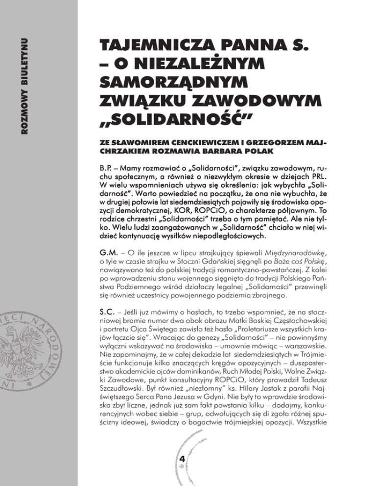 ROZMOWY BIULETYNU TAJEMNICZA PANNA S. – O NIEZALEŻNYM SAMORZĄDNYM ZWIĄZKU ZAWODOWYM „SOLIDARNOŚĆ” ZE SŁAWOMIREM CENCKIEWICZEM I GRZEGORZEM MAJCHRZAKIEM ROZMAWIA BARBARA POLAK B.P amy rozmawiać o „Solidarności”, związku zawodowym, ru.P.. – M Mamy chu społecznym, a również o niezwykłym okresie w dziejach PRL PRL.. W wielu wspomnieniach używa się określenia: jak wybychła „Solidarność”. Warto powiedzieć na początku, że ona nie wybuchła, że w drugiej połowie lat siedemdziesiątych pojawiły się środowiska opo opo-zycji demokratycznej, K OR, ROPCiO o KOR, ROPCiO,, o charakterze półjawnym. TTo rodzice chrzestni „Solidarności” trzeba o tym pamiętać. Ale nie tylko. Wielu ludzi zaangażowanych w „Solidarność” chciało w niej widzieć kontynuację wysiłków niepodległościowych. G.M. – O ile jeszcze w lipcu strajkujący śpiewali Międzynarodówkę, o tyle w czasie strajku w Stoczni Gdańskiej sięgnęli po Boże coś Polskę, nawiązywano też do polskiej tradycji romantyczno-powstańczej. Z kolei po wprowadzeniu stanu wojennego sięgnięto do tradycji Polskiego Państwa Podziemnego wśród działaczy legalnej „Solidarności” przewinęli się również uczestnicy powojennego podziemia zbrojnego. S .C .C.. – Jeśli już mówimy o hasłach, to trzeba wspomnieć, że na stoczniowej bramie numer dwa obok obrazu Matki Boskiej Częstochowskiej i portretu Ojca Świętego zawisło też hasło „Proletariusze wszystkich krajów łączcie się”. Wracając do genezy „Solidarności” – nie powinnyśmy wyłączni wskazywać na środowiska – umownie mówiąc – warszawskie. Nie zapominajmy, że w całej dekadzie lat siedemdziesiątych w Trójmieście funkcjonuje kilka znaczących kręgów opozycyjnych – duszpasterstwo akademickie ojców dominikanów, Ruch Młodej Polski, Wolne Związki Zawodowe, punkt konsultacyjny ROPCiO, który prowadził Tadeusz Szczudłowski. Był również „niezłomny” ks. Hilary Jastak z parafii Najświętszego Serca Pana Jezusa w Gdyni. Nie były to wprawdzie środowiska zbyt liczne, jednak już sam fakt powstania kilku – dodajmy, konkurencyjnych wobec siebie – grup, odwołujących się di zgoła różnej spuścizny ideowej, świadczy o bogactwie trójmiejskiej opozycji. Wszystkie 4 G.M. – Zgoda, w przypadku Wybrzeża na pewno najważniejszy był grudzień 1970 r., ale z kolei w Wielkopolsce ważniejszy był chyba jednak czerwiec 1956 r. Inna sprawa, że pamięć o wydarzeniach z grudnia 1970 r. wpłynęła na postawę zarówno strajkujących, jak też władz i Kościoła katolickiego. Z kolei marzec 1968 i grudzień 1970 r. nauczyły, że robotnicy i intelektualiści walczący osobno nie mają żadnych szans w starciu z władzą. Ważne jest też to, o czym w ogóle nie mówiliśmy, czyli dojście do władzy Edwarda Gierka. W tym momencie opozycja zyskała większa swobodę działania. Oczywiście nie wynikało to z dobrej woli I sekretarza, a z uwarunkowań międzynarodowych (w epoce otwarcia na świat władze nie mogły sobie pozwolić na zbyt drastyczne działania wobec opozycji). Druga połowa lat siedemdziesiątych to wręcz rozkwit opozycji w PRL. Choć oczywiście z drugiej strony nie było to tak, że w latach pięćdziesiątych i sześćdziesiątych nic się nie działo. Otóż działały niewielkie grupy opozycyjne (głównie młodzieżowe), choć na znacznie mniejszą skalę. B.P. – Żeby przypieczętować fakt narodzin „Solidarności”, warto po po-wiedzieć o lecie 1980 rr.. W iele kolejnych wydarzeń, zrazu nie powią zaWiele powiąza- 5 ROZMOWY BIULETYNU te środowiska miały wobec Sierpnia’80 różne oczekiwania – jedni proponowali program większych praw robotniczych, ideę wolnych związków zawodowych, inni hasło budowy przyczółków niepodległości. Wracając natomiast do pytania o korzenie opozycji – tej przedsierpniowej – to nie upatrywałbym ich na przykład w działalności podziemia zbrojnego po 1945 r. Uważam, że akurat w tej kwestii mamy ostatnio do czynienia ze swego rodzaju mitologizacją dziejów. Przynajmniej w Trójmieście – a podejrzewam, że nie jest to zjawisko odosobnione – środowiska opozycyjne odwoływały się raczej do tradycji robotniczych, specjalistycznych, czasem również syndykalistycznych i antyklerykalnych. Opozycja młodszego pokolenia – duszpasterstwo akademickie czy Ruch Młodej Polski – w pewnym stopniu fascynowała się myślą narodową, endecką, w jej „starym”, jeszcze przedwojennym (chodzi o pierwszą wojnę światową) sensie politycznym i narodowym. Na mapie trójmiejskiej opozycji jest może jeden wątek – Tadeusz Szczudłowski, który od zawsze widział w sobie spadkobiercę Polski Walczącej i Szarych Szeregów. W dyskusji o postawach społecznych mieszkańców Wybrzeża musimy wziąć również pod uwagę pewną pomorską specyfikę. Poza epizodem żołnierzy majora „Łupaszki” z lat czterdziestych praktycznie do 1968 r., a powiedziałbym, że nawet do grudnia 1970 roku, Gdańsk nie był jakąś „zbuntowaną prowincją”. Są wprawdzie środowiska poakowskie, kresowe, są Ukraińcy i Ormianie, przeciwko którym prowadzi się działania operacyjne, lecz nie stanowią oni jednej siły, o wspólnych celach i ideach. Cezurą w tym względzie jest niewątpliwie grudzień 1970 r., przede wszystkim dlatego, że wywołał na Wybrzeżu wielki wstrząs i stał się z miejsca elementem zbiorowej pamięci mieszkańców Pomorza Gdańskiego. ROZMOWY BIULETYNU nych ze sobą, w końcu owocuje powstaniem wielkiego narodowego frontu skierowanego przeciwko władzy władzy.. Zwróciłabym jeszcze uwagę na czerwiec 1976 rr., ., który – wydawałoby się – powinien być nauczką dla władzy władzy.. Nie można ludziom, którzy już mają kłopoty bytowe i jakieś punkty porównawcze z innymi krajami, bezkarnie podnosić cen mięsa. Co spowodowało tę decyzję o podwyżce cen od 1 lipca – czy był to rodzaj p