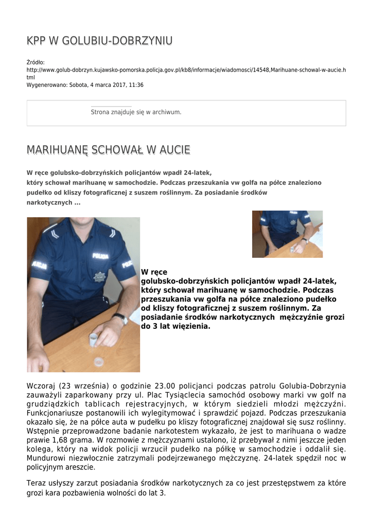KPP W GOLUBIU-DOBRZYNIU Źródło: http://www.golub-dobrzyn.kujawsko-pomorska.policja.gov.pl/kb8/informacje/wiadomosci/14548,Marihuane-schowal-w-aucie.h tml Wygenerowano: Sobota, 4 marca 2017, 11:36 Strona znajduje się w archiwum. MARIHUANĘ SCHOWAŁ W AUCIE W ręce golubsko-dobrzyńskich policjantów wpadł 24-latek, który schował marihuanę w samochodzie. Podczas przeszukania vw golfa na półce znaleziono pudełko od kliszy fotograficznej z suszem roślinnym. Za posiadanie środków narkotycznych ... W ręce golubsko-dobrzyńskich policjantów wpadł 24-latek, który schował marihuanę w samochodzie. Podczas przeszukania vw golfa na półce znaleziono pudełko od kliszy fotograficznej z suszem roślinnym. Za posiadanie środków narkotycznych mężczyźnie grozi do 3 lat więzienia. Wczoraj (23 września) o godzinie 23.00 policjanci podczas patrolu Golubia-Dobrzynia zauważyli zaparkowany przy ul. Plac Tysiąclecia samochód osobowy marki vw golf na grudziądzkich tablicach rejestracyjnych, w którym siedzieli młodzi mężczyźni. Funkcjonariusze postanowili ich wylegitymować i sprawdzić pojazd. Podczas przeszukania okazało się, że na półce auta w pudełku po kliszy fotograficznej znajdował się susz roślinny. Wstępnie przeprowadzone badanie narkotestem wykazało, że jest to marihuana o wadze prawie 1,68 grama. W rozmowie z mężczyznami ustalono, iż przebywał z nimi jeszcze jeden kolega, który na widok policji wrzucił pudełko na półkę w samochodzie i oddalił się. Mundurowi niezwłocznie zatrzymali podejrzewanego mężczyznę. 24-latek spędził noc w policyjnym areszcie. Teraz usłyszy zarzut posiadania środków narkotycznych za co jest przestępstwem za które grozi kara pozbawienia wolności do lat 3. Mł asp. Jolanta Zapaśnik-Wysocka Autor: golub-dobrzyn Publikacja: golub-dobrzyn Ocena: 0/5 (0) Tweetnij