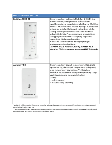 MULTIFUN SHHS SYSTEM Multifun SHHS-B1 Bezprzewodowy odbiornik Multifun SHHS B1 jest nowoczesnym, inteligentnym odbiornikiem współpracującym z regulatorem kotłowym Multifun. Montaż Multifun SHHS -B1 nie wymaga kucia ścian i układania instalacji kablowej, co jest jego wielką zaletą. W obrębie budynku centralka działa na odległość do 30 m*, na przestrzeni otwartej jego zasięg wynosi do 300m. Stan pracy regulatora sygnalizują diody na odbiorniku. Centralka Multifun SHHS-B1 współpracuje z następującymi nadajnikami: Auraton 200 R, Auraton 2025 R, Auraton T1 R, Auraton T2 R -termometr, Auraton H1XX R- klamka Auraton T2-R Bezprzewodowy czujnik temperatury. Doskonale sprawdza się jako czujnik temperatury pokojowej. oraz temperatury zewnętrznej**. Regulator Multifun na podstawie odczytu temperatury z tego czujnika dostosuje sterowanie kotłem Zalety: - szybki montaż - brak instalacji kablowej *zależnie od konstrukcji ścian oraz stropów w budynku mieszkalnym, przeszkód na drodze sygnału w postaci mebli, drzwi, zabudowy itp **do poprawnej pracy na zewnątrz wymagane jest zastosowanie dodatkowych peszli chroniącej czujnik przed niekorzystnym wpływem warunków atmosferycznych Auraton T1R Bezprzewodowy czujnik temperatury pokojowej. Służy również do regulacji temperatury w pomieszczeniu. Sterownik Multifun dostosuje krzywą grzewczą do nastawianej temperatury. Zalety: - szybki montaż - brak instalacji kablowej - 20 lat pracy na fabrycznie zamontowanej baterii litowej - umożliwia zmianę ustawionej temperatury ogrzewania na regulatorze Multifun Auraton 2025R Bezprzewodowy regulator temperatury, stanowiący nowe wcielenie docenianego modelu AURATON 2005 TX Plus. Unowocześniona konstrukcja ułatwia programowanie, a nowy, trzykolorowy, podświetlany wyświetlacz użytkowanie. W wyposażeniu dodatkowo licznik czasu pracy urządzenia grzewczego, Auraton 200R Zalety: - brak instalacji kablowej - szybki montaż - funkcja czujnika pokojowego w sterowniku Multifun lub termostatu - umożliwia zmianę ustawionej temperatury ogrzewania na regulatorze Multifun - 10 niezależnych programów - Rozbudowany tryb urlopowy Najmniejszy na rynku termostat z dużym wyświetlaczem LCD Zalety: - brak instalacji kablowej - szybki montaż - funkcja czujnika pokojowego w sterowniku Multifun - umożliwia zmianę ustawionej temperatury ogrzewania na regulatorze Multifun Auraton H1XXR Klamka okienna wyposażona jest w nadajnik oraz czujniki jej położenia. Dzięki temu zamontowana klamka przekazuje informację o otwarciu, rozszczelnieniu, uchyleniu okna do sterownika Multifun. Regulator podejmuje działanie w zależności od pozycji okna. W AURATON H-1 fabrycznie zamontowano najwyższej jakości litową baterię zapewniającą nieprzerwany czas pracy urządzenia do 20 lat. - brak instalacji kablowej - automatyczna aktywacja funkcji wietrzenia w sterowniku Multifun Auraton RPT 230 Repeater AURATON RPT 230, zasilany napięciem 230VAC służy do powielania sygnału z nadajnika do odbiornika bez żadnej modyfikacji tego sygnału w celu przedłużenia zasięgu transmisji radiowej nadajnika. Znajdują zastosowanie w miejscach takich jak duże hale produkcyjne, gdzie nadajnik jest poza zasięgiem odbiornika lub kilkupiętrowym budynku, w którym grube, zbrojone stropy i ściany utrudniają komunikację pomiędzy nadajnikiem i odbiornikiem.