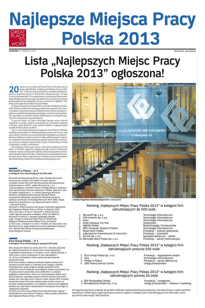 Najlepsze Miejsca Pracy Polska 2013 Czwartek 21 marca 2013 Dodatek specjalny Lista „Najlepszych Miejsc Pracy Polska 2013” ogłoszona! marca 2013 r. Instytut Great Place to Work® po raz piąty ogłosił Listę „Najlepszych Miejsc Pracy w Polsce”. Podczas uroczystej Gali w siedzibie Giełdy Papierów Wartościowych w Warszawie uhonorowano 16 firm w trzech kategoriach. Po raz pierwszy wyróżniono firmy małe, zatrudniające poniżej 50 pracowników. W tym roku przyznano jedną nagrodę specjalną dla „Firmy z wiatrem w żaglach”. Odbiorcą tej nagrody jest Elica Group Polska. W tegorocznej edycji Great Place to Work® Institute przebadał w Polsce 50 firm zatrudniających łącznie ponad 57 tys. pracowników. Lista honoruje przedsiębiorstwa, które stosują wyjątkowe praktyki i programy, promujące wartości wiarygodności, szacunku, uczciwości, dumy i koleżeństwa w relacjach między kierownictwem i pracownikami. O pozycji firmy na liście decyduje łączna ocena dwóch aspektów: wyniku ankiety pracowniczej (wskaźnik zaufania w firmie, Trust Index©) oraz audytu kultury organizacyjnej i praktyk HR (Culture Audit©). Tym, co wyróżnia Listę tworzoną przez Great Place to Work® Institute jest przekaz, że dobrego miejsca pracy nie tworzy sam pracodawca. Konieczna jest partnerska współpraca z pracownikami. Najlepsze miejsce pracy to takie, gdzie panuje wzajemne zaufanie: pracodawca jest wiarygodny, pracownik szanowany, a wszyscy mają poczucie dumy z tego co sami robią, co robią ich koledzy i z tego co robi firma. Rozwiązania stosowane przez laureatów konkursu Great Place to Work® mogą być inspiracją, jak tworzyć efektywne systemy wsparcia dla pracowników, a stosowana paleta rozwiązań i świadczeń jest szeroka. O niektórych rozwiązaniach stosowanych przez firmy nagrodzone w Polsce można dowiedzieć się odwiedzając stronę www.najlepszemiejscapracy.pl. ∑ 20 Microsoft w Polsce – nr 1 w kategorii firm zatrudniających do 500 osób Microsoft zatrudnia ponad 90 tys. osób. Siedziby Microsoftu mieszczą się w ponad 125 krajach na całym świecie. W polskim biurze Microsoft zatrudnia ponad 350 pracowników. Zarejestrowana w 1992 r. spółka Microsoft sp. z o.o. była początkowo niewielkim biurem, którego głównym zadaniem była reprezentacja interesów korporacji w Polsce. Obecnie w ofercie spółki znajdują się m. in.: system operacyjny Microsoft Windows, oprogramowanie biurowe Microsoft Office, rozwiązania wspierające zarządzanie Microsoft Dynamics, aplikacje serwerowe, technologia Microsoft. NET, XBOX, Skype, akcesoria komputerowe, oraz zaprezentowany w 2012 r. – Microsoft Surface. Microsoft w Polsce został już do tej pory trzykrotnie nagrodzony jako Najlepsze Miejsce Pracy w Polsce: w edycjach 2010, 2011 oraz 2012. W 2011 r. Microsoft w Polsce otrzymał także nagrodę specjalną w kategorii „Work-Life Balance”. Microsoft na świecie, z udziałem polskiego oddziału, zajął I miejsce w konkursie Great Place to Work® jako Najlepsze Międzynarodowe Miejsce Pracy na Świecie w 2011 roku, a miejsce II w 2012 r. Ponadto 16 marca 2012 roku Microsoft po raz drugi znalazł się na liście najbardziej etycznych firm: World's Most Ethical Companies publikowanej przez Etisphere Institute. Elica Group Polska – nr 1 ≥Giełda Papierów Wartościowych SA w Warszawie Ranking „Najlepszych Miejsc Pracy Polska 2013” w kategorii firm zatrudniających do 500 osób 1. Microsoft Sp. z o.o. 2. SAS Institute Sp. z o.o. 3. Astor 4. Hotel Zdrojowy Pro-Vita 5. AbbVie Polska 6. EMC Computer Systems Poland 7. Royal Canin Polska 8. Laboratorium Kosmetyczne Dr Irena Eris 9. Ochnik Sp. z o.o. 10. Mercedes-Benz Polska Sp. z o.o. w kategorii firm zatrudniających powyżej 500 osób Elica Group jest obecna na rynku od lat 70. i zatrudnia aktualnie ok. 3000 pracowników. W ramach Elica Group funkcjonuje 9 zakładów produkcyjnych w 6 krajach, w tym zakład powstały w 2005 roku w Jelczu-Laskowicach w woj. dolnośląskim, ok. 25 km od Wrocławia. Polski zakład zatrudnia obecnie ponad 500 osób. Elica Group działa w sektorze produkcji okapów kuchennych i wytwarza rocznie około 17 milionów sztuk okapów i silników. Przywiązywanie dużej uwagi do designu pozwoliło firmie całkowicie zmienić tradycyjne postrzeganie okapów kuchennych, już nie jako prostych akcesoriów, ale przedmiotów o unikalnym wyglądzie i parametrach, które są w stanie poprawić jakość życia. Elica produkuje i sprzedaje okapy kuchenne zarówno pod marką własną, jak i pod logo innych znanych marek sprzętu AGD. Produkty wytworzone przez firmę pod własną marką zostały uznane na szczeblu międzynarodowym za unikatowe, zarówno pod względem kształtu, jak i pod kątem zastosowania innowacyjnej technologii na najwyższym poziomie. W 2012 roku Elica Group Polska otrzymała prestiżowe nagrody: Gazelę Biznesu oraz Diament Forbesa, a także została wyróżniona jako Najlepsze Miejsce Pracy w Polsce. Technologie informatyczne Technologie informatyczne Technologie informatyczne Hotelarstwo Biotechnologia i farmaceutyka Technologie informatyczne Produkcja – artykuły spożywcze Produkcja – kosmetyki Sprzedaż detaliczna – odzież Produkcja – sprzęt motoryzacyjny Ranking „Najlepszych Miejsc Pracy Polska 2013” w kategorii firm zatrudniających powyżej 500 osób 1. 2. 3. 4. Elica Group Polska Sp. z o.o. Atos Philips w Polsce UBS Poland Service Centre Produkcja – wyposażenie wnętrz Technologie informatyczne Produkcja – sprzęt elektryczny Usługi profesjonalne Ranking „Najlepszych Miejsc Pracy Polska 2013” w kategorii firm zatrudniających poniżej 50 osób 1. EDP Renewables Polska 2. Mundipharma Polska Sp. z o.o. Produkcja – energetyka Usługi profesjonalne – reklama i marketing Na tegorocznej liście znalazły się polskie oddziały międzynarodowych korporacji, ale także firmy o czysto polskich korzeniach. Polski Astor zajął zaszczytne trzecie miej