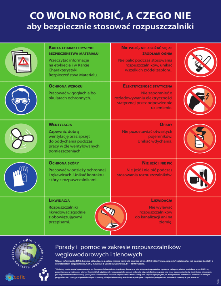 CO WOLNO ROBIĆ, A CZEGO NIE aby bezpiecznie stosować rozpuszczalniki KARTA CHARAKTERYSTYKI NIE PALIĆ, NIE ZBLIŻAĆ SIĘ ZE BEZPIECZEŃSTWA MATERIAŁU ŹRÓDŁAMI OGNIA Przeczytać informacje na etykiecie i w Karcie Charakterystyki Bezpieczeństwa Materiału. Nie palić podczas stosowania rozpuszczalników, unikać wszelkich źródeł zapłonu. OCHRONA WZROKU Pracować w goglach albo okularach ochronnych. WENTYLACJA Zapewnić dobrą wentylację oraz sprzęt do oddychania podczas pracy w źle wentylowanych pomieszczeniach. OCHRONA SKÓRY Pracować w odzieży ochronnej i rękawicach. Unikać kontaktu skóry z rozpuszczalnikami. LIKWIDACJA Rozpuszczalniki likwidować zgodnie z obowiązującymi przepisami. ELEKTRYCZNOŚĆ STATYCZNA Nie zapomnieć o rozładowywaniu elektryczności statycznej przez odpowiednie uziemienie. OPARY Nie pozostawiać otwartych pojemników. Unikać wdychania. NIE JEŚĆ I NIE PIĆ Nie jeść i nie pić podczas stosowania rozpuszczalników. LIKWIDACJA Nie wylewać rozpuszczalników do kanalizacji ani na ziemię. Porady i pomoc w zakresie rozpuszczalników węglowodorowych i tlenowych Więcej informacji o EISG, kolejne aktualizacje posteru można zamówić poprzez stronę EISG http://www.esig.info/register.php lub poprzez kontakt z sekretariatem esig@cefic.be, Cefic, 4 Avenue E Van Nieuwenhuyse, B - 1160 Brussels. Polish "Niniejszy poster został opracowany przez European Solvents Industry Group. Zawarte w nim informacje są rzetelne, zgodne z najlepszą wiedzą posiadaną przez EISG i są przedstawiane w najlepszej wierze. Czytelnik lub użytkownik rozpuszczalnika ponosi całkowitą odpowiedzialność, przez cały czas, za upewnienie się, że niniejsza informacja jest odpowiednia do konkretnej sytuacji lub zastosowania. EISG nie odpowiada na żadne skargi lub z tytułu rękojmi jako, że kompletność, dokładność oraz wola w żadnym przypadku nie czynią go odpowiedzialnym za szkody jakiejkolwiek natury absolutnie wynikające z użycia lub polegania na informacji zawartej w tym posterze."