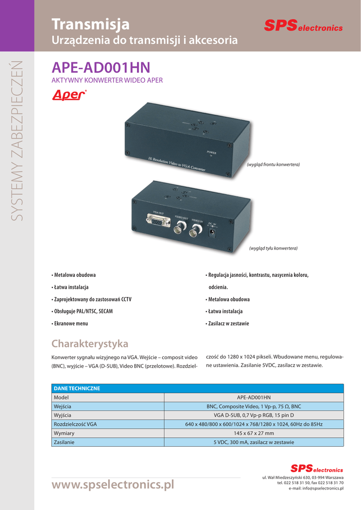 Transmisja SYSTEMY ZABEZPIECZEŃ Urządzenia do transmisji i akcesoria APE-AD001HN AKTYWNY KONWERTER WIDEO APER (wygląd frontu konwertera) (wygląd tyłu konwertera) • Metalowa obudowa • Regulacja jasności, kontrastu, nasycenia koloru, • Łatwa instalacja odcienia. • Zaprojektowany do zastosowań CCTV • Metalowa obudowa • Obsługuje PAL/NTSC, SECAM • Łatwa instalacja • Ekranowe menu • Zasilacz w zestawie Charakterystyka Konwerter sygnału wizyjnego na VGA. Wejście – composit video czość do 1280 x 1024 pikseli. Wbudowane menu, regulowa- (BNC), wyjście – VGA (D-SUB), Video BNC (przelotowe). Rozdziel- ne ustawienia. Zasilanie 5VDC, zasilacz w zestawie. DANE TECHNICZNE Model APE-AD001HN Wejścia BNC, Composite Video, 1 Vp-p, 75 Ω, BNC Wyjścia Rozdzielczość VGA VGA D-SUB, 0,7 Vp-p RGB, 15 pin D 640 x 480/800 x 600/1024 x 768/1280 x 1024, 60Hz do 85Hz Wymiary 145 x 67 x 27 mm Zasilanie 5 VDC, 300 mA, zasilacz w zestawie www.spselectronics.pl ul. Wał Miedzeszyński 630, 03-994 Warszawa tel. 022 518 31 50, fax 022 518 31 70 e-mail: [email protected]