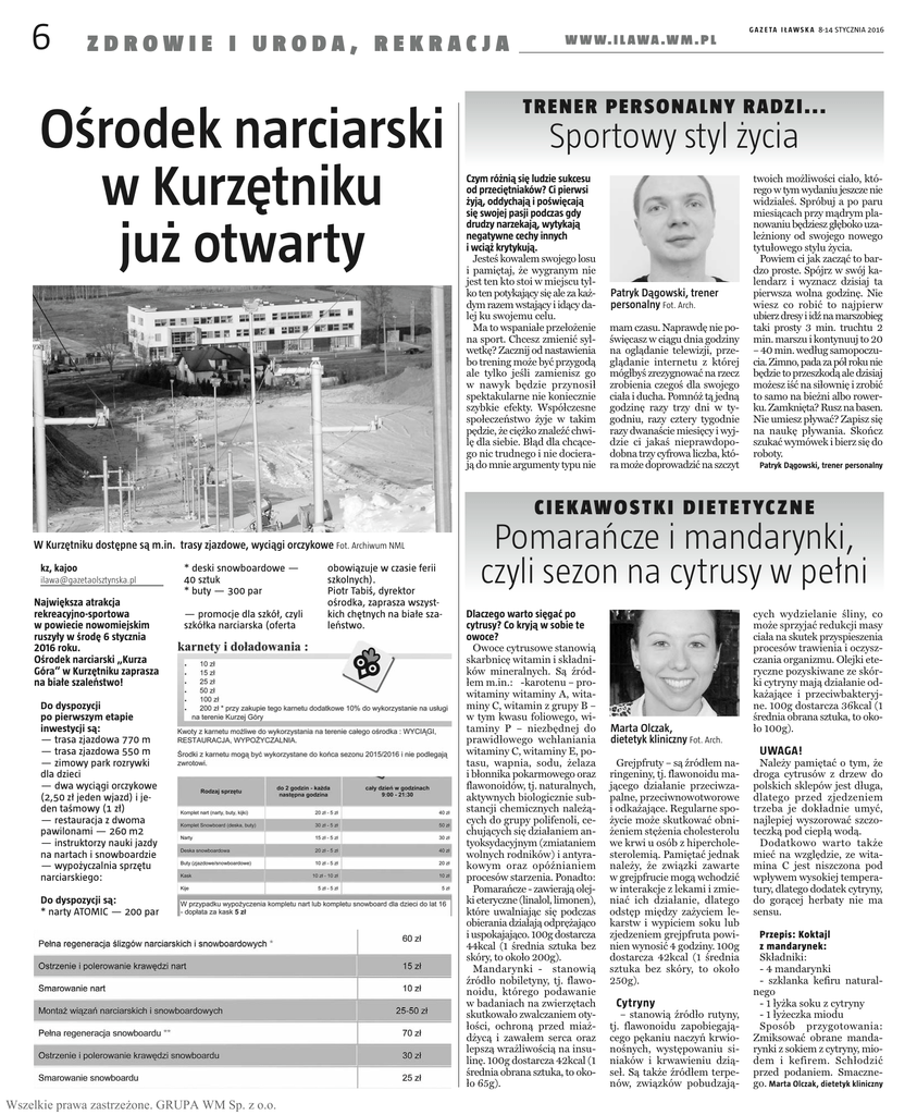 6 ZDROWIE I URODA, REKRACJA Ośrodek narciarski w Kurzętniku już otwarty W W W. I L A W A . W M . P L G A Z E T A I Ł A W S K A 8-14 STYCZNIA 2016 TRENER PERSONALNY RA DZI... Sportowy styl życia Czym różnią się ludzie sukcesu od przeciętniaków? Ci pierwsi żyją, oddychają i poświęcają się swojej pasji podczas gdy drudzy narzekają, wytykają negatywne cechy innych i wciąż krytykują. Jesteś kowalem swojego losu i pamiętaj, że wygranym nie jest ten kto stoi w miejscu tylko ten potykający się ale za każdym razem wstający i idący dalej ku swojemu celu. Ma to wspaniałe przełożenie na sport. Chcesz zmienić sylwetkę? Zacznij od nastawienia bo trening może być przygodą ale tylko jeśli zamienisz go w nawyk będzie przynosił spektakularne nie koniecznie szybkie efekty. Współczesne społeczeństwo żyje w takim pędzie, że ciężko znaleźć chwilę dla siebie. Błąd dla chcącego nic trudnego i nie docierają do mnie argumenty typu nie Patryk Dągowski, trener personalny Fot. Arch. mam czasu. Naprawdę nie poświęcasz w ciągu dnia godziny na oglądanie telewizji, przeglądanie internetu z której mógłbyś zrezygnować na rzecz zrobienia czegoś dla swojego ciała i ducha. Pomnóż tą jedną godzinę razy trzy dni w tygodniu, razy cztery tygodnie razy dwanaście miesięcy i wyjdzie ci jakaś nieprawdopodobna trzy cyfrowa liczba, która może doprowadzić na szczyt twoich możliwości ciało, którego w tym wydaniu jeszcze nie widziałeś. Spróbuj a po paru miesiącach przy mądrym planowaniu będziesz głęboko uzależniony od swojego nowego tytułowego stylu życia. Powiem ci jak zacząć to bardzo proste. Spójrz w swój kalendarz i wyznacz dzisiaj ta pierwsza wolna godzinę. Nie wiesz co robić to najpierw ubierz dresy i idź na marszobieg taki prosty 3 min. truchtu 2 min. marszu i kontynuuj to 20 – 40 min. według samopoczucia. Zimno, pada za pół roku nie będzie to przeszkodą ale dzisiaj możesz iść na siłownię i zrobić to samo na bieżni albo rowerku. Zamknięta? Rusz na basen. Nie umiesz pływać? Zapisz się na naukę pływania. Skończ szukać wymówek i bierz się do roboty. Patryk Dągowski, trener personalny C I E K AW O S T K I D I E T E T YC Z N E W Kurzętniku dostępne są m.in. trasy zjazdowe, wyciągi orczykowe Fot. Archiwum NML kz, kajoo [email protected] Największa atrakcja rekreacyjno-sportowa w powiecie nowomiejskim ruszyły w środę 6 stycznia 2016 roku. Ośrodek narciarski „Kurza Góra“ w Kurzętniku zaprasza na białe szaleństwo! * deski snowboardowe — 40 sztuk * buty — 300 par — promocje dla szkół, czyli szkółka narciarska (oferta Do dyspozycji po pierwszym etapie inwestycji są: — trasa zjazdowa 770 m — trasa zjazdowa 550 m — zimowy park rozrywki dla dzieci — dwa wyciągi orczykowe (2,50 zł jeden wjazd) i jeden taśmowy (1 zł) — restauracja z dwoma pawilonami — 260 m2 — instruktorzy nauki jazdy na nartach i snowboardzie — wypożyczalnia sprzętu narciarskiego: Do dyspozycji są: * narty ATOMIC — 200 par Wszelkie prawa zastrzeżone. GRUPA WM Sp. z o.o. obowiązuje w czasie ferii szkolnych). Piotr Tabiś, dyrektor ośrodka, zaprasza wszystkich chętnych na białe szaleństwo. Pomarańcze i mandarynki, czyli sezon na cytrusy w pełni Dlaczego warto sięgać po cytrusy? Co kryją w sobie te owoce? Owoce cytrusowe stanowią skarbnicę witamin i składników mineralnych. Są źródłem m.in.: -karotenu – prowitaminy witaminy A, witaminy C, witamin z grupy B – w tym kwasu foliowego, witaminy P – niezbędnej do prawidłowego wchłaniania witaminy C, witaminy E, potasu, wapnia, sodu, żelaza i błonnika pokarmowego oraz flawonoidów, tj. naturalnych, aktywnych biologicznie substancji chemicznych należących do grupy polifenoli, cechujących się działaniem antyoksydacyjnym (zmiataniem wolnych rodników) i antyrakowym oraz opóźnianiem procesów starzenia. Ponadto: Pomarańcze - zawierają olejki eteryczne (linalol, limonen), które uwalniając się podczas obierania działają odprężająco i uspokajająco. 100g dostarcza 44kcal (1 średnia sztuka bez skóry, to około 200g). Mandarynki - stanowią źródło nobiletyny, tj. flawonoidu, którego podawanie w badaniach na zwierzętach skutkowało zwalczaniem otyłości, ochroną przed miażdżycą i zawałem serca oraz lepszą wrażliwością na insulinę. 100g dostarcza 42kcal (1 średnia obrana sztuka, to około 65g). Marta Olczak, dietetyk kliniczny Fot. Arch. Grejpfruty – są źródłem naringeniny, tj. flawonoidu mającego działanie przeciwzapalne, przeciwnowotworowe i odkażające. Regularne spożycie może skutkować obniżeniem stężenia cholesterolu we krwi u osób z hipercholesterolemią. Pamiętać jednak należy, że związki zawarte w grejpfrucie mogą wchodzić w interakcje z lekami i zmieniać ich działanie, dlatego odstęp między zażyciem lekarstw i wypiciem soku lub zjedzeniem grejpfruta powinien wynosić 4 godziny. 100g dostarcza 42kcal (1 średnia sztuka bez skóry, to około 250g). Cytryny – stanowią źródło rutyny, tj. flawonoidu zapobiegającego pękaniu naczyń krwionośnych, występowaniu siniaków i krwawieniu dziąseł. Są także źródłem terpenów, związków pobudzają- cych wydzielanie śliny, co może sprzyjać redukcji masy ciała na skutek przyspieszenia procesów trawienia i oczyszczania organizmu. Olejki eteryczne pozyskiwane ze skórki cytryny mają działanie odkażające i przeciwbakteryjne. 100g dostarcza 36kcal (1 średnia obrana sztuka, to około 100g). UWAGA! Należy pamiętać o tym, że droga cytrusów z drzew do polskich sklepów jest długa, dlatego przed zjedzeniem trzeba je dokładnie umyć, najlepiej wyszorować szczoteczką pod ciepłą wodą. Dodatkowo warto także mieć na względzie, ze witamina C jest niszczona pod wpływem wysokiej temperatury, dlatego dodatek cytryny, do gorącej herbaty nie ma sensu. Przepis: Koktajl z mandarynek: Składniki: - 4 mandarynki - sz