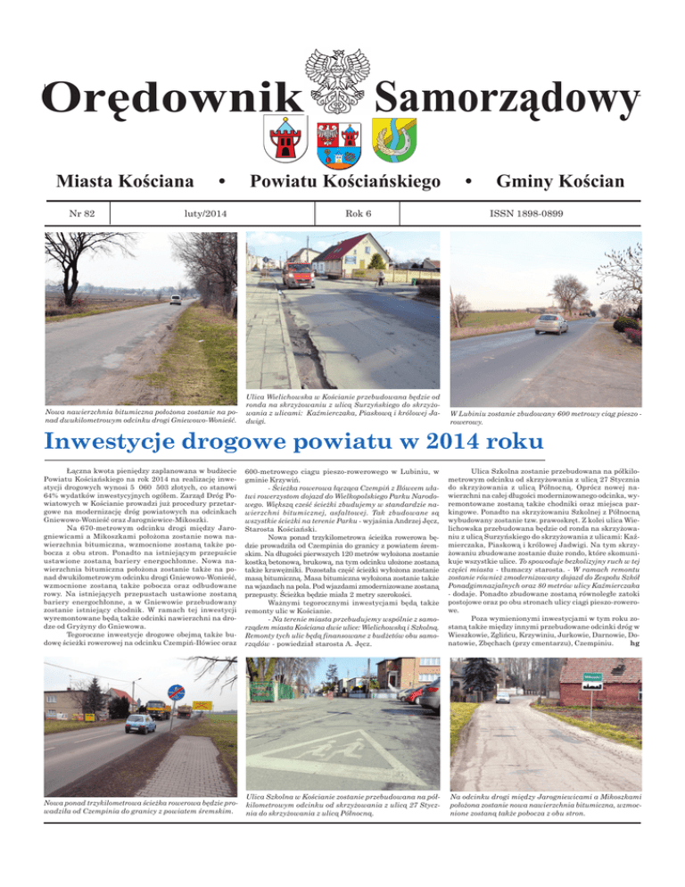 Samorz¹dowy Orêdownik luty 2014 Miasta Koœciana Nr 82 • luty/2014 Nowa nawierzchnia bitumiczna położona zostanie na ponad dwukilometrowym odcinku drogi Gniewowo-Wonieść. strona Powiatu Koœciañskiego Rok 6 Ulica Wielichowska w Kościanie przebudowana będzie od ronda na skrzyżowaniu z ulicą Surzyńskiego do skrzyżowania z ulicami: Kaźmierczaka, Piaskową i królowej Jadwigi. • 1 Gminy Koœcian ISSN 1898-0899 W Lubiniu zostanie zbudowany 600 metrowy ciąg pieszo rowerowy. Inwestycje drogowe powiatu w 2014 roku Łączna kwota pieniędzy zaplanowana w budżecie Powiatu Kościańskiego na rok 2014 na realizację inwestycji drogowych wynosi 5 060 503 złotych, co stanowi 64% wydatków inwestycyjnych ogółem. Zarząd Dróg Powiatowych w Kościanie prowadzi już procedury przetargowe na modernizację dróg powiatowych na odcinkach Gniewowo-Wonieść oraz Jarogniewice-Mikoszki. Na 670-metrowym odcinku drogi między Jarogniewicami a Mikoszkami położona zostanie nowa nawierzchnia bitumiczna, wzmocnione zostaną także pobocza z obu stron. Ponadto na istniejącym przepuście ustawione zostaną bariery energochłonne. Nowa nawierzchnia bitumiczna położona zostanie także na ponad dwukilometrowym odcinku drogi Gniewowo-Wonieść, wzmocnione zostaną także pobocza oraz odbudowane rowy. Na istniejących przepustach ustawione zostaną bariery energochłonne, a w Gniewowie przebudowany zostanie istniejący chodnik. W ramach tej inwestycji wyremontowane będą także odcinki nawierzchni na drodze od Gryżyny do Gniewowa. Tegoroczne inwestycje drogowe obejmą także budowę ścieżki rowerowej na odcinku Czempiń-Iłówiec oraz 600-metrowego ciągu pieszo-rowerowego w Lubiniu, w gminie Krzywiń. - Ścieżka rowerowa łącząca Czempiń z Iłówcem ułatwi rowerzystom dojazd do Wielkopolskiego Parku Narodowego. Większą cześć ścieżki zbudujemy w standardzie nawierzchni bitumicznej, asfaltowej. Tak zbudowane są wszystkie ścieżki na terenie Parku - wyjaśnia Andrzej Jęcz, Starosta Kościański. Nowa ponad trzykilometrowa ścieżka rowerowa będzie prowadziła od Czempinia do granicy z powiatem śremskim. Na długości pierwszych 120 metrów wyłożona zostanie kostką betonową, brukową, na tym odcinku ułożone zostaną także krawężniki. Pozostała część ścieżki wyłożona zostanie masą bitumiczną. Masa bitumiczna wyłożona zostanie także na wjazdach na pola. Pod wjazdami zmodernizowane zostaną przepusty. Ścieżka będzie miała 2 metry szerokości. Ważnymi tegorocznymi inwestycjami będą także remonty ulic w Kościanie. - Na terenie miasta przebudujemy wspólnie z samorządem miasta Kościana dwie ulice: Wielichowską i Szkolną. Remonty tych ulic będą finansowane z budżetów obu samorządów - powiedział starosta A. Jęcz. Ulica Szkolna zostanie przebudowana na półkilometrowym odcinku od skrzyżowania z ulicą 27 Stycznia do skrzyżowania z ulicą Północną. Oprócz nowej nawierzchni na całej długości modernizowanego odcinka, wyremontowane zostaną także chodniki oraz miejsca parkingowe. Ponadto na skrzyżowaniu Szkolnej z Północną wybudowany zostanie tzw. prawoskręt. Z kolei ulica Wielichowska przebudowana będzie od ronda na skrzyżowaniu z ulicą Surzyńskiego do skrzyżowania z ulicami: Kaźmierczaka, Piaskową i królowej Jadwigi. Na tym skrzyżowaniu zbudowane zostanie duże rondo, które skomunikuje wszystkie ulice. To spowoduje bezkolizyjny ruch w tej części miasta - tłumaczy starosta. - W ramach remontu zostanie również zmodernizowany dojazd do Zespołu Szkół Ponadgimnazjalnych oraz 80 metrów ulicy Kaźmierczaka - dodaje. Ponadto zbudowane zostaną równoległe zatoki postojowe oraz po obu stronach ulicy ciągi pieszo-rowerowe. Poza wymienionymi inwestycjami w tym roku zostaną także między innymi przebudowane odcinki dróg w Wieszkowie, Zglińcu, Krzywiniu, Jurkowie, Darnowie, Donatowie, Zbęchach (przy cmentarzu), Czempiniu. hg Nowa ponad trzykilometrowa ścieżka rowerowa będzie prowadziła od Czempinia do granicy z powiatem śremskim. Ulica Szkolna w Kościanie zostanie przebudowana na półkilometrowym odcinku od skrzyżowania z ulicą 27 Stycznia do skrzyżowania z ulicą Północną. Na odcinku drogi między Jarogniewicami a Mikoszkami położona zostanie nowa nawierzchnia bitumiczna, wzmocnione zostaną także pobocza z obu stron. miasto Koœcian strona 2 luty 2014 Apteki odbiorą stare lekarstwa Wieża Ciśnień zaprasza W czwartek 30 stycznia 2014 r. odbyło się uroczyste otwarcie Wieży Ciśnień. Burmistrz Miasta Kościana Michał Jurga podsumował inwestycję realizowaną w ramach projektu pn. „Kościański Trakt Rekreacyjny” z WRPO i wraz z Przewodniczącym Rady Miejskiej Kościana Piotrem Ruszkiewiczem oraz wykonawcą inwestycji symbolicznie przecięli wstęgę, zapraszając pierwszych gości do obejrzenia odnowionego wnętrza. Następnie Ks. Dziekan Czesław Bartoszewski poświęcił obiekt. Od weekendu 31 stycznia nową kościańską inwestycję mogli zwiedzać wszyscy zainteresowani. W obiekcie na odwiedzających czekają ściany wspinaczkowe ponad osiemnastometrowej wysokości, obserwatorium astronomiczne, punkt widokowy na panoramę miasta, jak i wystawy. Wszystkich, którzy chcą spróbować swoich sił we wspinaczce serdecznie zapraszamy. Więcej informacji na stronie internetowej Burmistrz Miasta Kościana Michał Jurga prezentuje nowe funkcje www.wieza.koscian.pl lub pod nr tel. 609 690 170. wyremontowanego obiektu zabytkowego Uprzejmie informujemy, że od lutego 2014 roku we wszystkich aptekach na terenie miasta Kościana, prowadzona jest bezpłatna zbiórka przeterminowanych leków. Leki należy wrzucać do specjalnych, oznakowanych pojemników umieszczonych wewnątrz aptek. Kierownik Miejskiego Zakładu Gospodarki Mieszkaniowej i Dróg w Kościanie informuje, że w dniu 20 marca 2014 r. odbędzie się ofertowy przetarg pisemny nieograniczony na wydzierżawienie lokalu użytkowego znajdujące