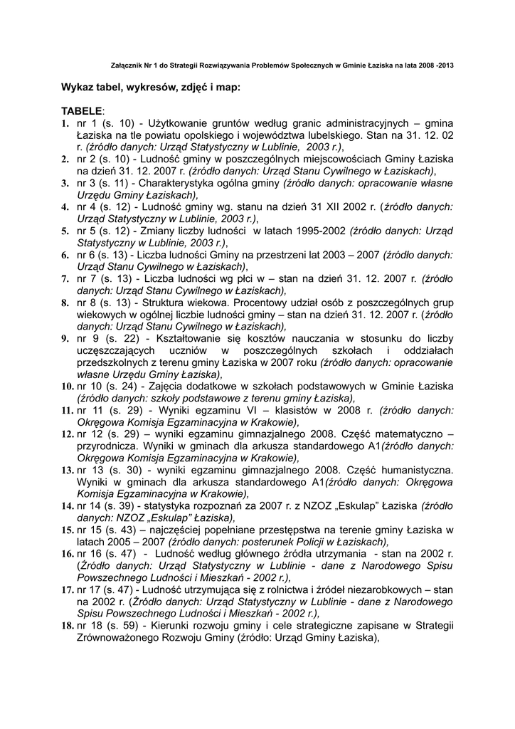Załącznik Nr 1 do Strategii Rozwiązywania Problemów Społecznych w Gminie Łaziska na lata 2008 -2013 Wykaz tabel, wykresów, zdjęć i map: TABELE: 1. nr 1 (s. 10) - Użytkowanie gruntów według granic administracyjnych – gmina Łaziska na tle powiatu opolskiego i województwa lubelskiego. Stan na 31. 12. 02 r. (źródło danych: Urząd Statystyczny w Lublinie, 2003 r.), 2. nr 2 (s. 10) - Ludność gminy w poszczególnych miejscowościach Gminy Łaziska na dzień 31. 12. 2007 r. (źródło danych: Urząd Stanu Cywilnego w Łaziskach), 3. nr 3 (s. 11) - Charakterystyka ogólna gminy (źródło danych: opracowanie własne Urzędu Gminy Łaziskach), 4. nr 4 (s. 12) - Ludność gminy wg. stanu na dzień 31 XII 2002 r. (źródło danych: Urząd Statystyczny w Lublinie, 2003 r.), 5. nr 5 (s. 12) - Zmiany liczby ludności w latach 1995-2002 (źródło danych: Urząd Statystyczny w Lublinie, 2003 r.), 6. nr 6 (s. 13) - Liczba ludności Gminy na przestrzeni lat 2003 – 2007 (źródło danych: Urząd Stanu Cywilnego w Łaziskach), 7. nr 7 (s. 13) - Liczba ludności wg płci w – stan na dzień 31. 12. 2007 r. (źródło danych: Urząd Stanu Cywilnego w Łaziskach), 8. nr 8 (s. 13) - Struktura wiekowa. Procentowy udział osób z poszczególnych grup wiekowych w ogólnej liczbie ludności gminy – stan na dzień 31. 12. 2007 r. (źródło danych: Urząd Stanu Cywilnego w Łaziskach), 9. nr 9 (s. 22) - Kształtowanie się kosztów nauczania w stosunku do liczby uczęszczających uczniów w poszczególnych szkołach i oddziałach przedszkolnych z terenu gminy Łaziska w 2007 roku (źródło danych: opracowanie własne Urzędu Gminy Łaziska), 10. nr 10 (s. 24) - Zajęcia dodatkowe w szkołach podstawowych w Gminie Łaziska (źródło danych: szkoły podstawowe z terenu gminy Łaziska), 11. nr 11 (s. 29) - Wyniki egzaminu VI – klasistów w 2008 r. (źródło danych: Okręgowa Komisja Egzaminacyjna w Krakowie), 12. nr 12 (s. 29) – wyniki egzaminu gimnazjalnego 2008. Część matematyczno – przyrodnicza. Wyniki w gminach dla arkusza standardowego A1(źródło danych: Okręgowa Komisja Egzaminacyjna w Krakowie), 13. nr 13 (s. 30) - wyniki egzaminu gimnazjalnego 2008. Część humanistyczna. Wyniki w gminach dla arkusza standardowego A1(źródło danych: Okręgowa Komisja Egzaminacyjna w Krakowie), 14. nr 14 (s. 39) - statystyka rozpoznań za 2007 r. z NZOZ „Eskulap” Łaziska (źródło danych: NZOZ „Eskulap” Łaziska), 15. nr 15 (s. 43) – najczęściej popełniane przestępstwa na terenie gminy Łaziska w latach 2005 – 2007 (źródło danych: posterunek Policji w Łaziskach), 16. nr 16 (s. 47) - Ludność według głównego źródła utrzymania - stan na 2002 r. (Źródło danych: Urząd Statystyczny w Lublinie - dane z Narodowego Spisu Powszechnego Ludności i Mieszkań - 2002 r.), 17. nr 17 (s. 47) - Ludność utrzymująca się z rolnictwa i źródeł niezarobkowych – stan na 2002 r. (Źródło danych: Urząd Statystyczny w Lublinie - dane z Narodowego Spisu Powszechnego Ludności i Mieszkań - 2002 r.), 18. nr 18 (s. 59) - Kierunki rozwoju gminy i cele strategiczne zapisane w Strategii Zrównoważonego Rozwoju Gminy (źródło: Urząd Gminy Łaziska), 19. nr 19 (s. 62) - Liczba osób i rodzin korzystających z pomocy społecznej w poszczególnych latach (źródło danych: Ośrodek Pomocy Społecznej w Łaziskach), 20. nr 20 (s. 64) - Powody przyznania świadczeń z pomocy społecznej w latach 2002 – 2007 (źródło danych Ośrodek Pomocy Społecznej w Łaziskach), 21. nr 21 (s. 68) - Bezrobocie na terenie Gminy Łaziska w latach 2003 – 2007 (źródło danych: Powiatowy Urząd Pracy w Opolu Lubelskim), 22. nr 22 (s. 68) - Bezrobocie w Gminie Łaziska - struktura(źródło danych: Powiatowy Urząd Pracy w Opolu Lubelskim), 23. nr 23 (s. 69) - Bezrobocie w Powiecie Opolskim - struktura. (źródło danych: Powiatowy Urząd Pracy w Opolu Lubelskim), 24. nr 24 (s. 73) - struktura osób niepełnosprawnych z terenu gminy Łaziska – stan na 2002 r. (źródło danych: Narodowy Spis Powszechny Ludności i Mieszkań z 2002 r. – „Podstawowe informacje ze spisów powszechnych dla Gminy Łaziska” – Urząd Statystyczny w Lublinie; Lublin 2003, s. 12 i 32, tab. 6) 25. nr 25 (s. 76) - typy rodzin objęte pomocą społeczną w latach 2003 – 2007 (źródło danych: Ośrodek Pomocy Społecznej w Łaziskach). 26. nr 26 (s. 80) - Liczba osób zgłoszonych do Gminnej Komisji Profilaktyki i rozwiązywania Problemów Alkoholowych w latach 2001-2005 (Źródło danych: Gminna Komisja Rozwiązywania Problemów Alkoholowych w Łaziskach), 27. nr 27 (s. 83) - Udzielone przez OPS Łaziska świadczenia na zadania własne gminy – w latach 2003 – 2007 (źródło danych: Ośrodek Pomocy Społecznej w Łaziskach), 28. nr 28 (s. 84) - Udzielone przez OPS Łaziska świadczenia na zadania zlecone gminy – w latach 2003 – 2007 (źródło danych: Ośrodek Pomocy Społecznej w Łaziskach), 29. nr 29 (s. 89) – zidentyfikowane problemy społeczne w Gminie Łaziska dla obszaru RODZINY I WYKLUCZENIE SPOŁECZNE (źródło: opracowane podczas warsztatów w sprawie aktualizacji Strategii Rozwiązywania Problemów Społecznych w Gminie Łaziska), 30. nr 30 (s. 90) – zidentyfikowane problemy społeczne w Gminie Łaziska dla obszaru DZIECI I MŁODZIEŻ (źródło: opracowane podczas warsztatów w sprawie aktualizacji Strategii Rozwiązywania Problemów Społecznych w Gminie Łaziska), 31. nr 31 (s. 91) – zidentyfikowane problemy społeczne w Gminie Łaziska dla obszaru SENIORZY I NIEPEŁNOSPRAWNOŚĆ (źródło: opracowane podczas warsztatów w sprawie aktualizacji Strategii Rozwiązywania Problemów Społecznych w Gminie Łaziska), 32. nr 32 (s. 91) – zidentyfikowane problemy społeczne w Gminie Łaziska dla obszaru SPOŁECZNOŚĆ, ORGANIZACJE POZARZĄDOWE I LIDERZY LOKALNI (źródło: opracowane podczas warsztatów w sprawie aktualizacji Strategii Rozwiązywania Problemów Społecznych w Gmi