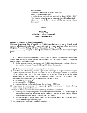 Załącznik nr 4 do ogłoszenia Burmistrza Miasta Szczecinek z dnia 25 października 2012r. o konkursie na realizację na realizację w latach 2013 – 2017 roku zadania polegającego na organizacji opieki nad dziećmi w wieku od 1 do 3 lat w formie Ŝłobka na terenie Miasta Szczecinek (wzór) UMOWA dzierŜawy nieruchomości i rzeczy ruchomych zawarta w dniu ...... w Szczecinku pomiędzy: Miastem Szczecinek, Plac Wolności 13, 78-400 Szczecinek , zwanym w dalszej treści umowy „PoddzierŜawiającym”, reprezentowanym przez pełnomocnika dyrektora Miejskiej Jednostki Obsługi Oświaty w Szczecinku Joannę Powałkę ……………………, zwanym w dalszej treści umowy „DzierŜawcą”, reprezentowanym przez …………….. § 1. 1. Podpisujący niniejszą umowę oświadczają, Ŝe zgodnie z przepisami regulującymi zasady funkcjonowania Stron Umowy, są uprawnieni do ich reprezentowania i podpisania umowy o treści w niej określonej. 2. Osoba upowaŜnioną do reprezentowania PoddzierŜawiającego przy realizacji Umowy jest dyrektor Miejskiej Jednostki Obsługi Oświaty w Szczecinku. § 2. 1. WydzierŜawiający oświadcza, Ŝe jest właścicielem: 1) nieruchomości zabudowanej lokalem uŜytkowym, połoŜonym w budynku wielorodzinnym usytuowanym Szczecinku przy ul. Koszalińskiej 66, nr ewidencyjny działki 20 w obrębie 07, o powierzchni 203,55 m2 dla którego w Wydziale Ksiąg Wieczystych Sądu Rejonowego w Szczecinku jest prowadzona księga wieczysta o numerze KW KO1I/00053087/1 składającego się z następujących powierzchni: a) sali maluchów – 58,49 m2; b) sali starszaków – 50,22 m2; c) pozostałej części ogólno-administracyjno-socjalnej – 94,84 m2; 2) wyposaŜenia przeznaczonego do organizacji opieki sprawowanej w formie Ŝłobka, stanowiącego załącznik do umowy - zwanych w dalszej treści umowy zbiorczą nazwą „przedmiotu dzierŜawy”. 2. Aktualny wypis z rejestru gruntów stanowić będzie Załącznik nr 1 do Umowy, wypis z powołanej wyŜej księgi wieczystej będzie stanowić Załącznik nr 2 do Umowy, wykaz wyposaŜenia stanowić będzie Załącznik Nr 3 do Umowy. 3. WydzierŜawiający, mając świadomość, Ŝe DzierŜawca polega na złoŜonych przez niego zapewnieniach, oświadcza, Ŝe: 1) jest wyłącznym właścicielem przedmiotu dzierŜawy; 2 2) nie istnieją Ŝadne roszczenia osób trzecich, które mogłyby uniemoŜliwić lub utrudnić zawarcie lub wykonywanie Umowy; 3) zawarcie przez niego Umowy jest zgodne z przepisami prawa, zaś przez jej zawarcie DzierŜawca nabędzie skutecznie wszystkie uprawnienia przewidziane Umową. § 3. 1. Strony Umowy zgodnie oświadczają, Ŝe przedmiot dzierŜawy znajduje się w stanie umoŜliwiającym jego uŜytkowanie zgodnie z celem, dla którego został oddany w dzierŜawę określonym w § 5 ust. 1 poniŜej. 2. DzierŜawca potwierdza przejęcie przedmiotu dzierŜawy w stanie przydatnym do umówionego uŜytku. Szczegółowy opis przedmiotu poddzierŜawy zawierać będzie protokół zdawczoodbiorczy będący załącznikiem Nr 4 do Umowy i stanowiący jej integralną cześć. Protokół moŜe zostać sporządzony w formie dokumentacji fotograficznej i utrwalony na nośniku CD. 3. Opis przedmiotu dzierŜawy zawarty w załączniku nr 3 będzie stanowić wyłączną podstawę do określenia stanu zmian w przedmiocie dzierŜawy w chwili jego zwrotu WydzierŜawiającemu oraz zakresu nakładów poczynionych na niego przez DzierŜawcę. § 4. 1. Na podstawie Umowy, WydzierŜawiający oddaje DzierŜawcy przedmiot dzierŜawy do uŜywania zgodnie z przeznaczeniem określonym w Umowie oraz do pobierania poŜytków, a DzierŜawca przedmiot dzierŜawy przyjmuje w dzierŜawę. 2. Przedmiot dzierŜawy zostaje oddany DzierŜawcy w dzierŜawę w celu określonym w § 5 poniŜej. 3. WydzierŜawiający zapewnia, Ŝe przedmiot dzierŜawy nie jest obciąŜony prawami na rzecz osób trzecich ani nie toczy się postępowanie sądowe lub egzekucyjne, którego byłby przedmiotem. 4. WydzierŜawiający przez czas trwania Umowy zobowiązuje się: 1) nie obciąŜać przedmiotu dzierŜawy prawami na rzecz osób trzecich; 2) w przypadku wytoczenia powództwa lub wszczęcia egzekucji dotyczących przedmiotu dzierŜawy, niezwłocznie powiadomić o tym DzierŜawcę. § 5. 1. Przedmiot dzierŜawy będzie wykorzystywany przez DzierŜawcę wyłącznie na cele związane z organizacją opieki sprawowanej w formie Ŝłobka, zgodnie ze zleceniem WydzierŜawiającemu przez Burmistrza Miasta Szczecinek na podstawie umowy zawartej w dniu ………………………. o udzielenie dotacji celowej, w wyniku ogłoszonego przez Burmistrza Miasta Szczecinek konkursu na realizację na realizację w latach 2013 – 2017 roku zadania polegającego na organizacji opieki nad dziećmi w wieku od 1 do 3 lat w formie Ŝłobka na terenie Miasta Szczecinek. 2. Cel wykorzystania przedmiotu dzierŜawy opisany w ust. 1 zostanie w całości osiągnięty nie później niŜ dnia 1 lutego 2013r. 3. Do dnia 31 stycznia 2013r. DzierŜawca będzie przygotowywał się do realizacji celu wymienionego w ust. 1 powyŜej. PowyŜszy przepis nie stoi w sprzeczności z zapisem § 3 ust. 1 i 2 powyŜej potwierdzającym wydanie przedmiotu dzierŜawy w stanie przydatnym do umówionego uŜytku. § 6. 1. DzierŜawca jest obowiązany: 1) uŜytkować przedmiot dzierŜawy wyłącznie dla celów określonych w § 5 Umowy; 2) utrzymywać przedmiot dzierŜawy w naleŜytym porządku; 3 3) zabezpieczyć przedmiot dzierŜawy przed jego zniszczeniem, uszkodzeniem lub utratą wartości ponad zuŜycie wynikające z normalnego korzystania z rzeczy zgodnie z jej przeznaczeniem; 4) ponosić koszty związane z bieŜącym uŜytkowaniem przedmiotu dzierŜawy. 2. Obowiązek określony w ust. 1 pkt 3 powyŜej zostanie zrealizowany przez DzierŜawcę m.in. poprzez ubezpieczenie przedmiotu dzierŜawy przez cały czas trwania Umowy od wszelkich ryzyk (w szczególności od: ognia, uderzenia piorunu, powodzi, śni