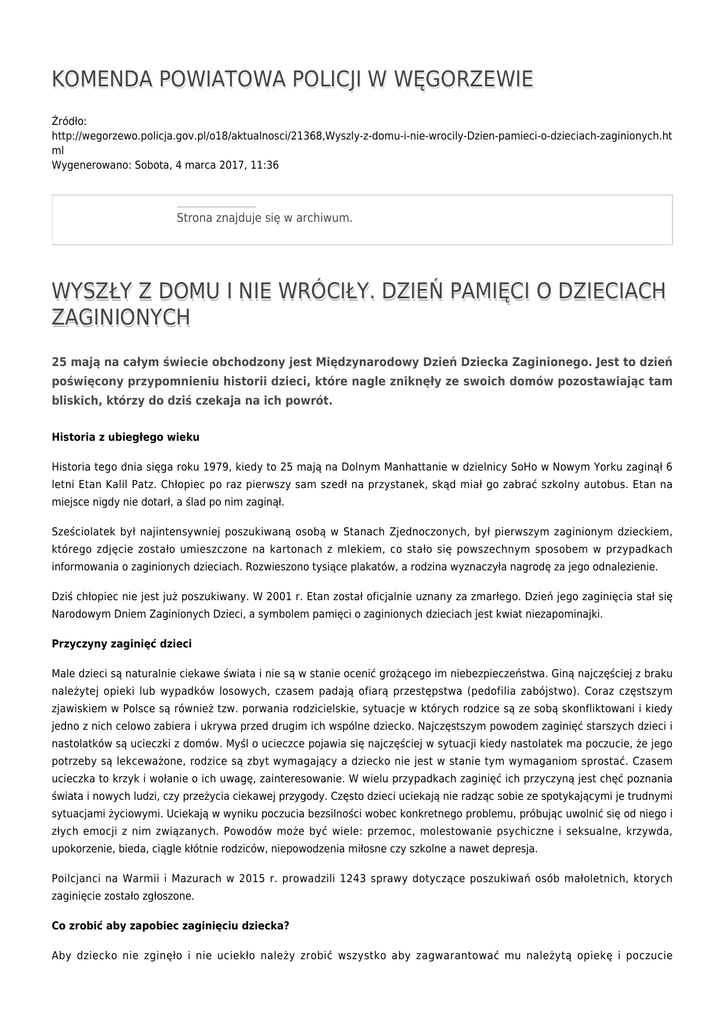 KOMENDA POWIATOWA POLICJI W WĘGORZEWIE Źródło: http://wegorzewo.policja.gov.pl/o18/aktualnosci/21368,Wyszly-z-domu-i-nie-wrocily-Dzien-pamieci-o-dzieciach-zaginionych.ht ml Wygenerowano: Sobota, 4 marca 2017, 11:36 Strona znajduje się w archiwum. WYSZŁY Z DOMU I NIE WRÓCIŁY. DZIEŃ PAMIĘCI O DZIECIACH ZAGINIONYCH 25 mają na całym świecie obchodzony jest Międzynarodowy Dzień Dziecka Zaginionego. Jest to dzień poświęcony przypomnieniu historii dzieci, które nagle zniknęły ze swoich domów pozostawiając tam bliskich, którzy do dziś czekaja na ich powrót. Historia z ubiegłego wieku Historia tego dnia sięga roku 1979, kiedy to 25 mają na Dolnym Manhattanie w dzielnicy SoHo w Nowym Yorku zaginął 6 letni Etan Kalil Patz. Chłopiec po raz pierwszy sam szedł na przystanek, skąd miał go zabrać szkolny autobus. Etan na miejsce nigdy nie dotarł, a ślad po nim zaginął. Sześciolatek był najintensywniej poszukiwaną osobą w Stanach Zjednoczonych, był pierwszym zaginionym dzieckiem, którego zdjęcie zostało umieszczone na kartonach z mlekiem, co stało się powszechnym sposobem w przypadkach informowania o zaginionych dzieciach. Rozwieszono tysiące plakatów, a rodzina wyznaczyła nagrodę za jego odnalezienie. Dziś chłopiec nie jest już poszukiwany. W 2001 r. Etan został oficjalnie uznany za zmarłego. Dzień jego zaginięcia stał się Narodowym Dniem Zaginionych Dzieci, a symbolem pamięci o zaginionych dzieciach jest kwiat niezapominajki. Przyczyny zaginięć dzieci Male dzieci są naturalnie ciekawe świata i nie są w stanie ocenić grożącego im niebezpieczeństwa. Giną najczęściej z braku należytej opieki lub wypadków losowych, czasem padają ofiarą przestępstwa (pedofilia zabójstwo). Coraz częstszym zjawiskiem w Polsce są również tzw. porwania rodzicielskie, sytuacje w których rodzice są ze sobą skonfliktowani i kiedy jedno z nich celowo zabiera i ukrywa przed drugim ich wspólne dziecko. Najczęstszym powodem zaginięć starszych dzieci i nastolatków są ucieczki z domów. Myśl o ucieczce pojawia się najczęściej w sytuacji kiedy nastolatek ma poczucie, że jego potrzeby są lekceważone, rodzice są zbyt wymagający a dziecko nie jest w stanie tym wymaganiom sprostać. Czasem ucieczka to krzyk i wołanie o ich uwagę, zainteresowanie. W wielu przypadkach zaginięć ich przyczyną jest chęć poznania świata i nowych ludzi, czy przeżycia ciekawej przygody. Często dzieci uciekają nie radząc sobie ze spotykającymi je trudnymi sytuacjami życiowymi. Uciekają w wyniku poczucia bezsilności wobec konkretnego problemu, próbując uwolnić się od niego i złych emocji z nim związanych. Powodów może być wiele: przemoc, molestowanie psychiczne i seksualne, krzywda, upokorzenie, bieda, ciągle kłótnie rodziców, niepowodzenia miłosne czy szkolne a nawet depresja. Poilcjanci na Warmii i Mazurach w 2015 r. prowadzili 1243 sprawy dotyczące poszukiwań osób małoletnich, ktorych zaginięcie zostało zgłoszone. Co zrobić aby zapobiec zaginięciu dziecka? Aby dziecko nie zginęło i nie uciekło należy zrobić wszystko aby zagwarantować mu należytą opiekę i poczucie bezpieczeństwa. W przypadku młodszych dzieci ważne jest nie pozostawiać ich bez opieki, a także nauczyć je własnego imienia i nazwiska, jeśli to możliwe również adresu zamieszkania. W przypadku starszych dzieci i nastolatków ważne jest okazanie im naszego zainteresowania, nie ignorowanie jego problemów i potrzeb, obserwowanie zachowania dziecka, reagowanie we wszelkich sytuacjach związanych z jego zachowaniem, budzących nasz niepokój. Jak reagować w sytuacji kiedy zginie nam dziecko? Przede wszystkim należy natychmiast rozpocząć poszukiwania. W przypadku zaginięć dzieci każda kolejna minuta upływająca od chwili zaginięcia jest niezwykle ważna. Oprócz przeszukania najbliższej okolicy, zaalarmowania sąsiadów i znajomym, zaginięcie należy jak najszybciej zgłosić na Policję, dostarczając policjantowi przyjmującemu sprawę możliwie najaktualniejszą fotografię, przedstawiającą wizerunek zaginionego dziecka a także informując go o wszelkich okolicznościach związanych z jego zaginięciem. Im więcej szczegółów dotyczących zaginięcia przekażemy policjantowi, tym większe prawdopodobieństwo odnalezienia zaginionego dziecka. Zarezerwowany numer telefonu 116 000 15 lutego 2007 r. Komisja Europejska przyjęła decyzję zobowiązującą państwa członkowskie do zarezerwowania numeru 116 000 dla telefonu alarmowego do zgłaszania zaginięć dzieci w UE. Telefon jest skierowany do rodziców i opiekunów, którym zaginęło dziecko, do zaginionych dzieci oraz do wszystkich osób, które mogą pomóc w ich odnalezieniu. Przy telefonie 116 000 pracują specjaliści Fundacji ITAKA - Centrum Poszukiwań Ludzi Zaginionych. Poszukują zaginionych dzieci: zbierają i analizują sygnały od informatorów, weryfikują je, a w razie uzasadnionej konieczności przekazują policji. W poszukiwania włączane są media, inne organizacje pozarządowe i służby w kraju i na całym świecie. Psycholodzy ITAKI pracujący przy telefonie 116 000 wspierają rodziny zaginionych dzieci o każdej porze dnia i nocy. 116 000 - telefon w sprawie zaginionego dziecka działa 24 godziny na dobę, 7 dni w tygodniu. Pod ten numer można dzwonić z terenu całego kraju, z każdej komórki i każdego telefonu stacjonarnego. Child Alert – szybki i masowy komunikat 20 listopada 2013 r. Polska dołączyła do grona państw korzystających z systemu Child Alert, czyli programu zakładającego natychmiastowe powiadamianie społeczeństwa o zaginięciach dzieci, który z powodzeniem wykorzystuje się w poszukiwaniach zaginionych w wielu krajach Europy i na świecie. Działanie systemu polega na bardzo szybkim rozpowszechnieniu informacji o zaginionym dziecku za pośrednictwem wszelkich dostępnych mediów, takich jak np.: telewizja, internet, radio, tabli