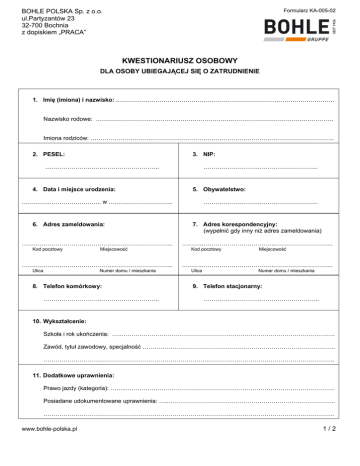 Formularz KA-005-02 BOHLE POLSKA Sp. z o.o. ul.Partyzantów 23 32-700 Bochnia z dopiskiem „PRACA” KWESTIONARIUSZ OSOBOWY DLA OSOBY UBIEGAJĄCEJ SIĘ O ZATRUDNIENIE 1. Imię (imiona) i nazwisko: ...……………………………………………………………………………………………. Nazwisko rodowe: ………………………………………………………………………………………………………. Imiona rodziców: …………………………………………………………………………………………………………. 2. PESEL: 3. NIP: ……………………….……………………….. 4. Data i miejsce urodzenia: ……………………….……………………….. 5. Obywatelstwo: …………..…………………….. w ………………………….. 6. Adres zameldowania: ………..……………………………...……………………….. Kod pocztowy Miejscowość ………..……………………………...……………………….. Ulica Numer domu / mieszkania 8. Telefon komórkowy: ………………………..……………………….. ……………………….……………………….. 7. Adres korespondencyjny: (wypełnić gdy inny niż adres zameldowania) ………..……………………………...……………………….. Kod pocztowy Miejscowość ………..……………………………...……………………….. Ulica Numer domu / mieszkania 9. Telefon stacjonarny: ………………………..……………………….. 10. Wykształcenie: Szkoła i rok ukończenia: …..……………………………………………………………………………………………. Zawód, tytuł zawodowy, specjalność …………………………………………………………………………………... ………………………………………………………………………..…………………………………………………….. 11. Dodatkowe uprawnienia: Prawo jazdy (kategoria): ……...…………………………………………………………………………………………. Posiadane udokumentowane uprawnienia: ….………………………………………………………………………... ………………………………………………………………………..…………………………………………………….. www.bohle-polska.pl 1/2 12. Znajomość języków obcych: Biegle: ……...……………………………………………………………………………………………………...………. Komunikatywnie w mowie i piśmie: ….……………………………………………………………………………….... Słabo: …………………………………………………………..…………………………………………………………. 13. Okresy dotychczasowego zatrudnienia w oparciu o posiadane świadectwa pracy: okres od okres do nazwa pracodawcy stanowisko kraj 14. Oświadczam, że pozostaję / nie pozostaję *) , w rejestrze osób bezrobotnych *) - niewłaściwe skreślić 15. Dodatkowe informacje niezbędne do przyjęcia Państwa kwestionariusza osobowego. A. Jakim rodzajem zatrudnienia jest pan zainteresowany w naszej firmie: a) Stałym b) Tylko czasowym (przejściowym) B. Ile miesięcy w roku deklaruje się pan pracować w Polsce a ile miesięcy za granicą? a) W Polsce…………………………..... b) Za granicą…………………………..... C. Jakie są pana oczekiwania finansowe brutto? a) Miesięcznie…………………………..... b) Rocznie……………………………..... Oświadczam, że podane w kwestionariuszu dane są zgodne z prawdą, zobowiązuję się do ich aktualizowania, oraz zgadzam się na przetwarzanie moich danych osobowych zawartych w ofercie pracy, dla potrzeb niezbędnych do realizacji procesu rekrutacji przez firmę BOHLE POLSKA SP. Z O.O. (zgodnie z Ustawą z dn.29.08.97 o Ochronie Danych Osobowych Dz. Ust. nr 133 poz. 883) ……………………….………..... Data, Miejscowość www.bohle-polska.pl …………………..…………………………..... Czytelny podpis osoby ubiegającej się o zatrudnienie 2 / 2