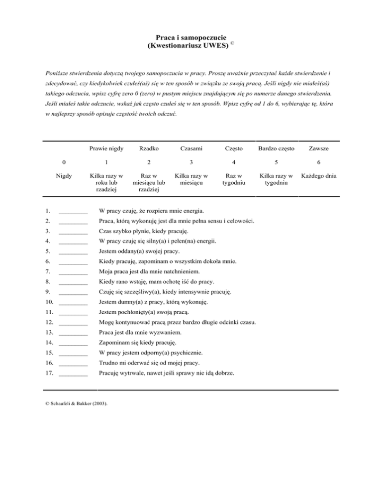 Praca i samopoczucie (Kwestionariusz UWES) © Poniższe stwierdzenia dotyczą twojego samopoczucia w pracy. Proszę uważnie przeczytać każde stwierdzenie i zdecydować, czy kiedykolwiek czułeś(aś) się w ten sposób w związku ze swoją pracą. Jeśli nigdy nie miałeś(aś) takiego odczucia, wpisz cyfrę zero 0 (zero) w pustym miejscu znajdującym się po numerze danego stwierdzenia. Jeśli miałeś takie odczucie, wskaż jak często czułeś się w ten sposób. Wpisz cyfrę od 1 do 6, wybierając tę, która w najlepszy sposób opisuje częstość twoich odczuć. Prawie nigdy Rzadko Czasami Często Bardzo często Zawsze 0 1 2 3 4 5 6 Nigdy Kilka razy w roku lub rzadziej Raz w miesiącu lub rzadziej Kilka razy w miesiącu Raz w tygodniu Kilka razy w tygodniu Każdego dnia 1. _________ W pracy czuję, że rozpiera mnie energia. 2. _________ Praca, którą wykonuję jest dla mnie pełna sensu i celowości. 3. _________ Czas szybko płynie, kiedy pracuję. 4. _________ W pracy czuję się silny(a) i pełen(na) energii. 5. _________ Jestem oddany(a) swojej pracy. 6. _________ Kiedy pracuję, zapominam o wszystkim dokoła mnie. 7. _________ Moja praca jest dla mnie natchnieniem. 8. _________ Kiedy rano wstaję, mam ochotę iść do pracy. 9. _________ Czuję się szczęśliwy(a), kiedy intensywnie pracuję. 10. _________ Jestem dumny(a) z pracy, którą wykonuję. 11. _________ Jestem pochłonięty(a) swoją pracą. 12. _________ Mogę kontynuować pracą przez bardzo długie odcinki czasu. 13. _________ Praca jest dla mnie wyzwaniem. 14. _________ Zapominam się kiedy pracuję. 15. _________ W pracy jestem odporny(a) psychicznie. 16. _________ Trudno mi oderwać się od mojej pracy. 17. _________ Pracuję wytrwale, nawet jeśli sprawy nie idą dobrze. © Schaufeli & Bakker (2003).