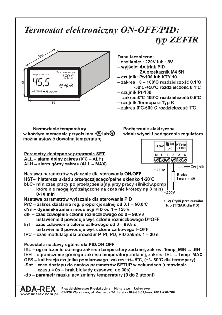 Termostat elektroniczny ON-OFF/PID: typ ZEFIR 0 11 Temp. nastawiona 48 Temp. zmierzona 1 20,0 45,5 GRZANIE SET ALARM 96 Nastawianie temperatury w każdym momencie przyciskami: lub można ustawić dowolną temperaturę Dane teczniczne: – zasilanie: ~220V lub ~8V – wyjście: 4A triak PID 2A przekaźnik M4 5H – czujnik: Pt-100 lub KTY 10 o o – zakres: 0 – 100 C rozdzielczość 0.1 C o o o -50 C-+50 C rozdzielczość 0.1 C – czujnik:Pt-100 o o o – zakres:0 C-499 C rozdzielczość 0.5 C – czujnik:Termopara Typ K o o o – zakres:0 C-600 C rozdzielczość 1 C Podłączenie elektryczne widok wtyczki podłączenia regulatora ~220V Parametry dostępne w programie SET o ALL – alarm dolny zakres (0 C – ALH) ALH – alarm górny zakres (ALL – MAX) lub KTY10 PT100 N L 1 2 ~220V 3 4 Czujnik Nastawa parametrów wyłącznie dla sterowania ON/OFF R obc o I max = 4A HST– histereza układu przełączającego/pełne okienko 1-20 C bLC– min.czas pracy po przełączeniu(np.przy pracy silników,pomp które nie mogą być załączone na czas nie krótszy np 3 min) ~220V 0-10 min Nastawa parametrów wyłacznie dla sterowania PID (1, 2) Styki przekaźnika o PrC – zakres działania reg. proporcjonalnej od 0.1 – 50.0 C lub (TRIAK dla PD) dYn – dynamika zmian modulacji PID od 1 – 150% dIF – czas zdwojenia członu różniczkowego od 0 – 99.9 s ustawienie 0 powoduje wył. członu różniczkowego D=OFF InT – czas zdławienia członu całkowego od 0 – 99.9 s ustawienie 0 powoduje wył. członu całkowego I=OFF tPC – czas modulacji dla procedur P, PI, PD, PID zakres 1 – 30 s Pozostałe nastawy ogólne dla PID/ON-OFF tEL – ograniczenie dolnego zakresu temperatury zadanej, zakres: Temp_MIN ... tEH tEH – ograniczenie górnego zakresu temperatury zadanej, zakres: tEL ... Temp_MAX o o OFS – kalibracja czujnika pomiarowego, zakres: +/– 5 C, (+/– 50 C dla termopary) -Sbt – czas dostępu do nastaw parametrów SETUP w sekundach (ustawienie czasu = 0s – brak blokady czasowej do 30s) -db – parametr maskujący zmiany temperatury (0 do 2 stopni) ADA-REX www.adarex.com.pl Przedsiębiorstwo Produkcyjno – Handlowo – Usługowe 01-926 Warszawa, ul. Kwitnąca 7A, tel./fax 669-86-51,kom. 0601-220-766 Programowanie: 1/ naciśnij SET trzmając go przez 5 sek - na dolnym wyświetlaczu wyświetli się symbol parametru, na górnym jego aktualna wartość 2/ przyciskami ustaw na dolnym wyświetlaczu symbol parametru, który chcesz zmienić 3/ ponownie naciśnij SET, wartość parametru na górnym wyświetlaczu zacznie migać 4/ na dolnym wyświetlaczu pojawi się wartość aktualnej temperatury 5/ przyciskami ustaw nową wartość danego parametru patrząc na zmianę temperatury 6/ zaakceptuj ją przyciskiem SET 7/ przyciskami zakończ programowanie UWAGA ! Praca regulatora rozpoczyna się po 30 sek. od momentu załączenia go do zasilania 220V USTAWIANIE PARAMETRÓW KOMORY CIEPLNEJ 180 LITRÓW o PrC – zakres działania reg. proporcjonalnej od 0.1 – 50.0 C dYn – dynamika zmian modulacji PID od 1 – 150% dIF – czas zdwojenia członu różniczkowego od 0 – 99.9 s ustawienie 0 powoduje wył. członu różniczkowego D=OFF InT – czas zdławienia członu całkowego od 0 – 99.9 s ustawienie 0 powoduje wył. członu całkowego I=OFF tPC – czas modulacji dla procedur P, PI, PD, PID zakres 1 – 30 s o OFS – kalibracja czujnika pomiarowego, zakres: +/– 5 C, o (+/– 50 C dla termopary) -Sbt – czas dostępu do nastaw parametrów SETUP w sekundach (ustawienie czasu = 0s – brak blokady czasowej do 30s) -db – parametr maskujący zmiany temperatury (0 do 2 stopni) 50.0oC 28% --2,0 --2,2 --18 -0,3 5s o 1C UWAGA: w przypadku umieszczenie w komorze wsadu chcąc utrzymać temperaturę zadaną wewnątrz komory należy zmieniać tylko parametr dYn. Zmiana wartości innych parametrów może rozregulować stabilność cieplną komory. ADA-REX www.adarex.com.pl Przedsiębiorstwo Produkcyjno – Handlowo – Usługowe 01-926 Warszawa, ul. Kwitnąca 7A, tel./fax 669-86-51,kom. 0601-220-766
