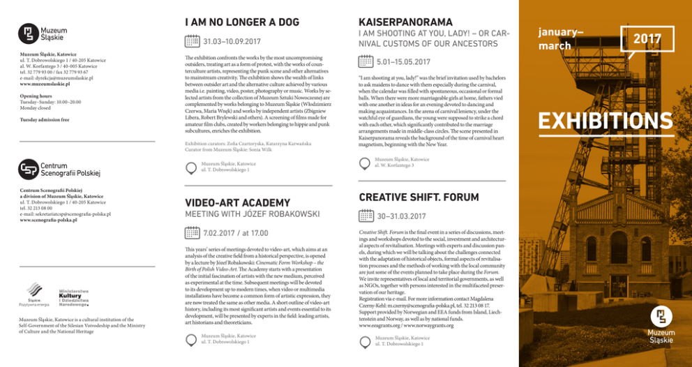 I AM NO LONGER A DOG 31.03–10.09.2017 Muzeum Śląskie, Katowice ul. T. Dobrowolskiego 1 / 40-205 Katowice al. W. Korfantego 3 / 40-005 Katowice tel. 32 779 93 00 / fax 32 779 93 67 e-mail: [email protected] www.muzeumslaskie.pl Opening hours Tuesday–Sunday: 10.00–20.00 Monday closed Tuesday admission free The exhibition confronts the works by the most uncompromising outsiders, treating art as a form of protest, with the works of counterculture artists, representing the punk scene and other alternatives to mainstream creativity. The exhibition shows the wealth of links between outsider art and the alternative culture achieved by various media i.e. painting, video, poster, photography or music. Works by selected artists from the collection of Muzeum Sztuki Nowoczesnej are complemented by works belonging to Muzeum Śląskie (Włodzimierz Czerwa, Maria Wnęk) and works by independent artists (Zbigniew Libera, Robert Brylewski and others). A screening of films made for amateur film clubs, created by workers belonging to hippie and punk subcultures, enriches the exhibition. Exhibition curators: Zofia Czartoryska, Katarzyna Karwańska Curator from Muzeum Śląskie: Sonia Wilk Muzeum Śląskie, Katowice ul. T. Dobrowolskiego 1 Centrum Scenografii Polskiej a division of Muzeum Śląskie, Katowice ul. T. Dobrowolskiego 1 / 40-205 Katowice tel. 32 213 08 00 e-mail: [email protected] www.scenografia-polska.pl VIDEO-ART ACADEMY MEETING WITH JÓZEF ROBAKOWSKI 7.02.2017 / at 17.00 Muzeum Śląskie, Katowice is a cultural institution of the Self-Government of the Silesian Voivodeship and the Ministry of Culture and the National Heritage This years’ series of meetings devoted to video-art, which aims at an analysis of the creative field from a historical perspective, is opened by a lecture by Józef Robakowski: Cinematic Form Workshop – the Birth of Polish Video-Art. The Academy starts with a presentation of the initial fascination of artists with the new medium, perceived as experimental at the time. Subsequent meetings will be devoted to its development up to modern times, when video or multimedia installations have become a common form of artistic expression, they are now treated the same as other media. A short outline of video-art history, including its most significant artists and events essential to its development, will be presented by experts in the field: leading artists, art historians and theoreticians. Muzeum Śląskie, Katowice ul. T. Dobrowolskiego 1 KAISERPANORAMA I AM SHOOTING AT YOU, LADY! – OR CARNIVAL CUSTOMS OF OUR ANCESTORS january– march 2017 5.01–15.05.2017 “I am shooting at you, lady!” was the brief invitation used by bachelors to ask maidens to dance with them especially during the carnival, when the calendar was filled with spontaneous, occasional or formal balls. When there were more marriageable girls at home, fathers vied with one another in ideas for an evening devoted to dancing and making acquaintances. In the arena of carnival leniency, under the watchful eye of guardians, the young were supposed to strike a chord with each other, which significantly contributed to the marriage arrangements made in middle-class circles. The scene presented in Kaiserpanorama reveals the background of the time of carnival heart magnetism, beginning with the New Year. Muzeum Śląskie, Katowice al. W. Korfantego 3 CREATIVE SHIFT. FORUM 30–31.03.2017 Creative Shift. Forum is the final event in a series of discussions, meetings and workshops devoted to the social, investment and architectural aspects of revitalisation. Meetings with experts and discussion panels, during which we will be talking about the challenges connected with the adaptation of historical objects, formal aspects of revitalisation processes and the methods of working with the local community are just some of the events planned to take place during the Forum. We invite representatives of local and territorial governments, as well as NGOs, together with persons interested in the multifaceted preservation of our heritage. Registration via e-mail. For more information contact Magdalena Czerny-Kehl: [email protected], tel. 32 213 08 17. Support provided by Norwegian and EEA funds from Island, Liechtenstein and Norway, as well as by national funds. www.eeagrants.org / www.norwaygrants.org Muzeum Śląskie, Katowice ul. T. Dobrowolskiego 1 EXHIBITIONS PIOTR SZYMON PHOTOGRAPHY 22.01–25.06.2017 A man shown in his everyday life, joy and sorrow, on the verge of the sacred and the profane, at a moment existentially significant for him – this is the main theme of Piotr Szymon’s works. The exhibition of his pictures presents three basic thematic and formal threads in the artist’s output, that is pilgrims, the Roma people, a portrait and an artistic experiment. Such circles of interest determine the manner in which he presents mankind – always in the centre of the photographic stories he creates. Systematic returns to selected themes are interpreted here as a creative attempt to solve the puzzle that is human life and to understand the values sought by human beings. MONUMENTAL BEAUTY STANISŁAW HILARY POPŁAWSKI 17.12.2016–26.03.2017 The presentation of Stanisław Hilary Popławski’s creations is not only a monographic exhibition, but also a reminder of an artist who has been somewhat neglected in recent times, represents the trend of new classicism. The exhibition of works by Popławski, who was at the time already highly esteemed for his technical mastery, is also an attempt to show how important tradition is in shaping what is defined as avant-garde. For the contemporary viewer, a new interpretation of his art may be an inspiring experience, but also a return to traditional, non-avant-garde art. Exhibition curator: Andrzej Holeczko-Kiehl Exhibition curator: Ada Grzelewska Muzeum Śląskie, Katowice al. W. Korfantego 3 VLADIMÍR BIRGUS PHOTOGRAPHY 25.03–3.09.2017 This exhibition of one of the most 