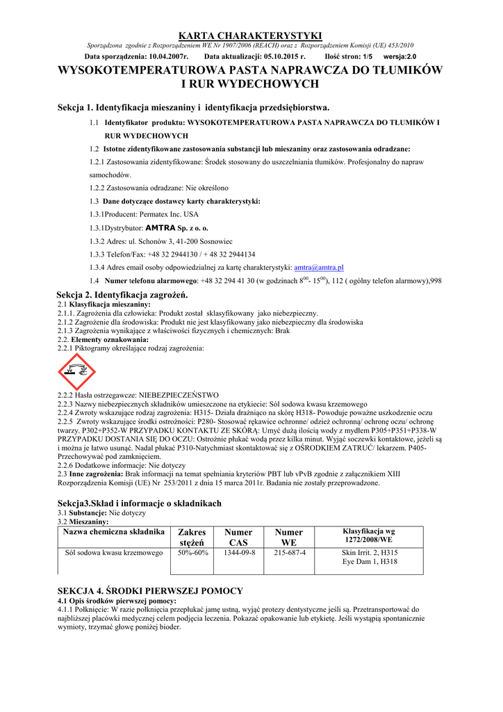 KARTA CHARAKTERYSTYKI Sporządzona zgodnie z Rozporządzeniem WE Nr 1907/2006 (REACH) oraz z Rozporządzeniem Komisji (UE) 453/2010 Data sporządzenia: 10.04.2007r. Data aktualizacji: 05.10.2015 r. Ilość stron: 1/5 wersja:2.0 WYSOKOTEMPERATUROWA PASTA NAPRAWCZA DO TŁUMIKÓW I RUR WYDECHOWYCH Sekcja 1. Identyfikacja mieszaniny i identyfikacja przedsiębiorstwa. 1.1 Identyfikator produktu: WYSOKOTEMPERATUROWA PASTA NAPRAWCZA DO TŁUMIKÓW I RUR WYDECHOWYCH 1.2 Istotne zidentyfikowane zastosowania substancji lub mieszaniny oraz zastosowania odradzane: 1.2.1 Zastosowania zidentyfikowane: Środek stosowany do uszczelniania tłumików. Profesjonalny do napraw samochodów. 1.2.2 Zastosowania odradzane: Nie określono 1.3 Dane dotyczące dostawcy karty charakterystyki: 1.3.1Producent: Permatex Inc. USA 1.3.1Dystrybutor: AMTRA Sp. z o. o. 1.3.2 Adres: ul. Schonów 3, 41-200 Sosnowiec 1.3.3 Telefon/Fax: +48 32 2944130 / + 48 32 2944134 1.3.4 Adres email osoby odpowiedzialnej za kartę charakterystyki: [email protected] 1.4 Numer telefonu alarmowego: +48 32 294 41 30 (w godzinach 800- 1500), 112 ( ogólny telefon alarmowy),998 Sekcja 2. Identyfikacja zagrożeń. 2.1 Klasyfikacja mieszaniny: 2.1.1. Zagrożenia dla człowieka: Produkt został sklasyfikowany jako niebezpieczny. 2.1.2 Zagrożenie dla środowiska: Produkt nie jest klasyfikowany jako niebezpieczny dla środowiska 2.1.3 Zagrożenia wynikające z właściwości fizycznych i chemicznych: Brak 2.2. Elementy oznakowania: 2.2.1 Piktogramy określające rodzaj zagrożenia: 2.2.2 Hasła ostrzegawcze: NIEBEZPIECZEŃSTWO 2.2.3 Nazwy niebezpiecznych składników umieszczone na etykiecie: Sól sodowa kwasu krzemowego 2.2.4 Zwroty wskazujące rodzaj zagrożenia: H315- Działa drażniąco na skórę H318- Powoduje poważne uszkodzenie oczu 2.2.5 Zwroty wskazujące środki ostrożności: P280- Stosować rękawice ochronne/ odzież ochronną/ ochronę oczu/ ochronę twarzy. P302+P352-W PRZYPADKU KONTAKTU ZE SKÓRĄ: Umyć dużą ilością wody z mydłem P305+P351+P338-W PRZYPADKU DOSTANIA SIĘ DO OCZU: Ostrożnie płukać wodą przez kilka minut. Wyjąć soczewki kontaktowe, jeżeli są i można je łatwo usunąć. Nadal płukać P310-Natychmiast skontaktować się z OŚRODKIEM ZATRUĆ/ lekarzem. P405Przechowywać pod zamknięciem. 2.2.6 Dodatkowe informacje: Nie dotyczy 2.3 Inne zagrożenia: Brak informacji na temat spełniania kryteriów PBT lub vPvB zgodnie z załącznikiem XIII Rozporządzenia Komisji (UE) Nr 253/2011 z dnia 15 marca 2011r. Badania nie zostały przeprowadzone. Sekcja3.Skład i informacje o składnikach 3.1 Substancje: Nie dotyczy 3.2 Mieszaniny: Nazwa chemiczna składnika Zakres stężeń Numer CAS Numer WE Klasyfikacja wg 1272/2008/WE Sól sodowa kwasu krzemowego 50%-60% 1344-09-8 215-687-4 Skin Irrit. 2, H315 Eye Dam 1, H318 SEKCJA 4. ŚRODKI PIERWSZEJ POMOCY 4.1 Opis środków pierwszej pomocy: 4.1.1 Połknięcie: W razie połknięcia przepłukać jamę ustną, wyjąć protezy dentystyczne jeśli są. Przetransportować do najbliższej placówki medycznej celem podjęcia leczenia. Pokazać opakowanie lub etykietę. Jeśli wystąpią spontanicznie wymioty, trzymać głowę poniżej bioder. KARTA CHARAKTERYSTYKI Sporządzona zgodnie z Rozporządzeniem WE Nr 1907/2006 (REACH) oraz z Rozporządzeniem Komisji (UE) 453/2010 Data sporządzenia: 10.04.2007r. Data aktualizacji: 05.10.2015 r. Ilość stron: 2/5 wersja:2.0 WYSOKOTEMPERATUROWA PASTA NAPRAWCZA DO TŁUMIKÓW I RUR WYDECHOWYCH 4.1.2. Zatrucie inhalacyjne: Wynieść poszkodowanego z miejsca narażenia i zapewnić dostęp świeżego powietrza oraz spokój i odpoczynek. W przypadku dolegliwości (kaszel, wymioty, zawroty głowy, świszczący oddech) zapewnić pomoc lekarską. Nieprzytomnego ułożyć w pozycji bocznej. 4.1.3. Skażenie skóry: Zdjąć skażoną odzież. Skórę zmyć ciepłą wodą z mydłem. W razie wystąpienia podrażnienia skóry skontaktować się z lekarzem. 4.1.4.Skażenie oczu: Jeżeli poszkodowany nosi szkła kontaktowe niezwłocznie je wyjąć. Dokładnie przemyć oczy dużą ilością wody, wywijając powieki. Zapewnić pomoc okulisty. Uwaga: osoby narażone na skażenie oczu powinny być pouczone o konieczności i sposobie natychmiastowego płukania oczu 4.2 Najważniejsze ostre i opóźnione objawy oraz skutki narażenia: 4.2.1 Skażenie oczu: Może wystąpić podrażnienie, zaczerwienienie oraz łzawienie 4.2.2 Połknięcie: Mogą pojawić się mdłości, wymioty oraz ból brzucha 4.2.3 Kontakt ze skórą: Może wystąpić podrażnienie skóry. 4.3 Wskazania dotyczące wszelkiej natychmiastowej pomocy lekarskiej i szczególnego postępowania z poszkodowanym: Leczenie objawowe. SEKCJA 5. POSTĘPOWANIE W PRZYPADKU POŻARU 5.1 Środki gaśnicze: 5.1.1 Odpowiednie środki gaśnicze: Stosować pianę gaśniczą odporną na alkohol, CO2, proszek gaśniczy, mgła wodna. 5.1.2 Niewłaściwe środki gaśnicze: Nie stosować wody w zwartym strumieniu. 5.2 Szczególne zagrożenia związane z mieszaniną: Nie są znane 5.3 Informacje dla straży pożarnej: Środki ochrony ogólnej typowe w przypadku pożaru. Nie należy przebywać w zagrożonej ogniem strefie bez odpowiedniego ubrania odpornego na chemikalia i aparatu do oddychania z niezależnym obiegiem powietrza. Zagrożone pożarem zbiorniki usunąć jeśli to możliwe i nie wiąże się z nadmiernym ryzykiem lub chłodzić rozpyloną wodą z odpowiedniej odległości. Izolować teren przez wyprowadzenie wszystkich osób z najbliższej okolicy wypadku, jeżeli wybuch pożar. Nie należy podejmować żadnych działań, które stwarzałyby ryzyko dla kogokolwiek chyba że jest się odpowiednio przeszkolonym. SEKCJA 6. POSTĘPOWANIE W PRZYPADKU NIEZAMIERZONEGO UWOLIENIA DO ŚRODOWISKA 6.1 Indywidualne środki ostrożności, wyposażenie ochronne i procedury w sytuacjach awaryjnych: 6.1.1 Dla osób niezależących do personelu likwidującego skutki awarii: Ograniczyć dostęp osób postronnych do obszaru awar
