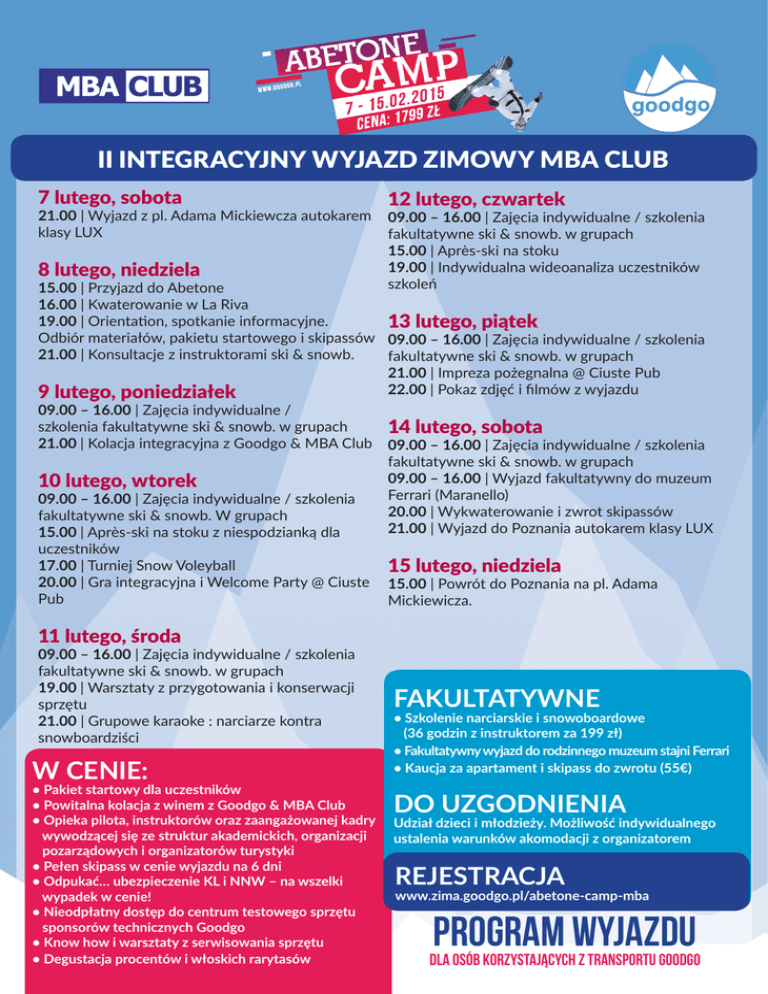 II INTEGRACYJNY WYJAZD ZIMOWY MBA CLUB 7 lutego, sobota 21.00 | Wyjazd z pl. Adama Mickiewcza autokarem klasy LUX 8 lutego, niedziela 12 lutego, czwartek 09.00 – 16.00 | Zajęcia indywidualne / szkolenia fakultatywne ski & snowb. w grupach 15.00 | Après-ski na stoku 19.00 | Indywidualna wideoanaliza uczestników szkoleń 15.00 | Przyjazd do Abetone 16.00 | Kwaterowanie w La Riva 19.00 | Orientation, spotkanie informacyjne. 13 lutego, piątek Odbiór materiałów, pakietu startowego i skipassów 09.00 – 16.00 | Zajęcia indywidualne / szkolenia 21.00 | Konsultacje z instruktorami ski & snowb. fakultatywne ski & snowb. w grupach 21.00 | Impreza pożegnalna @ Ciuste Pub 22.00 | Pokaz zdjęć i filmów z wyjazdu 9 lutego, poniedziałek 09.00 – 16.00 | Zajęcia indywidualne / szkolenia fakultatywne ski & snowb. w grupach 14 lutego, sobota 21.00 | Kolacja integracyjna z Goodgo & MBA Club 09.00 – 16.00 | Zajęcia indywidualne / szkolenia fakultatywne ski & snowb. w grupach 09.00 – 16.00 | Wyjazd fakultatywny do muzeum 10 lutego, wtorek Ferrari (Maranello) 09.00 – 16.00 | Zajęcia indywidualne / szkolenia 20.00 | Wykwaterowanie i zwrot skipassów fakultatywne ski & snowb. W grupach 21.00 | Wyjazd do Poznania autokarem klasy LUX 15.00 | Après-ski na stoku z niespodzianką dla uczestników 17.00 | Turniej Snow Voleyball 15 lutego, niedziela 20.00 | Gra integracyjna i Welcome Party @ Ciuste 15.00 | Powrót do Poznania na pl. Adama Pub Mickiewicza. 11 lutego, środa 09.00 – 16.00 | Zajęcia indywidualne / szkolenia fakultatywne ski & snowb. w grupach 19.00 | Warsztaty z przygotowania i konserwacji sprzętu 21.00 | Grupowe karaoke : narciarze kontra snowboardziści W CENIE: • Pakiet startowy dla uczestników • Powitalna kolacja z winem z Goodgo & MBA Club • Opieka pilota, instruktorów oraz zaangażowanej kadry wywodzącej się ze struktur akademickich, organizacji pozarządowych i organizatorów turystyki • Pełen skipass w cenie wyjazdu na 6 dni • Odpukać… ubezpieczenie KL i NNW – na wszelki wypadek w cenie! • Nieodpłatny dostęp do centrum testowego sprzętu sponsorów technicznych Goodgo • Know how i warsztaty z serwisowania sprzętu • Degustacja procentów i włoskich rarytasów FAKULTATYWNE • Szkolenie narciarskie i snowoboardowe (36 godzin z instruktorem za 199 zł) • Fakultatywny wyjazd do rodzinnego muzeum stajni Ferrari • Kaucja za apartament i skipass do zwrotu (55€) DO UZGODNIENIA Udział dzieci i młodzieży. Możliwość indywidualnego ustalenia warunków akomodacji z organizatorem REJESTRACJA www.zima.goodgo.pl/abetone-camp-mba PROGRAM WYJAZDU DLA OSÓB KORZYSTAJĄCYCH Z TRANSPORTU GOODGO