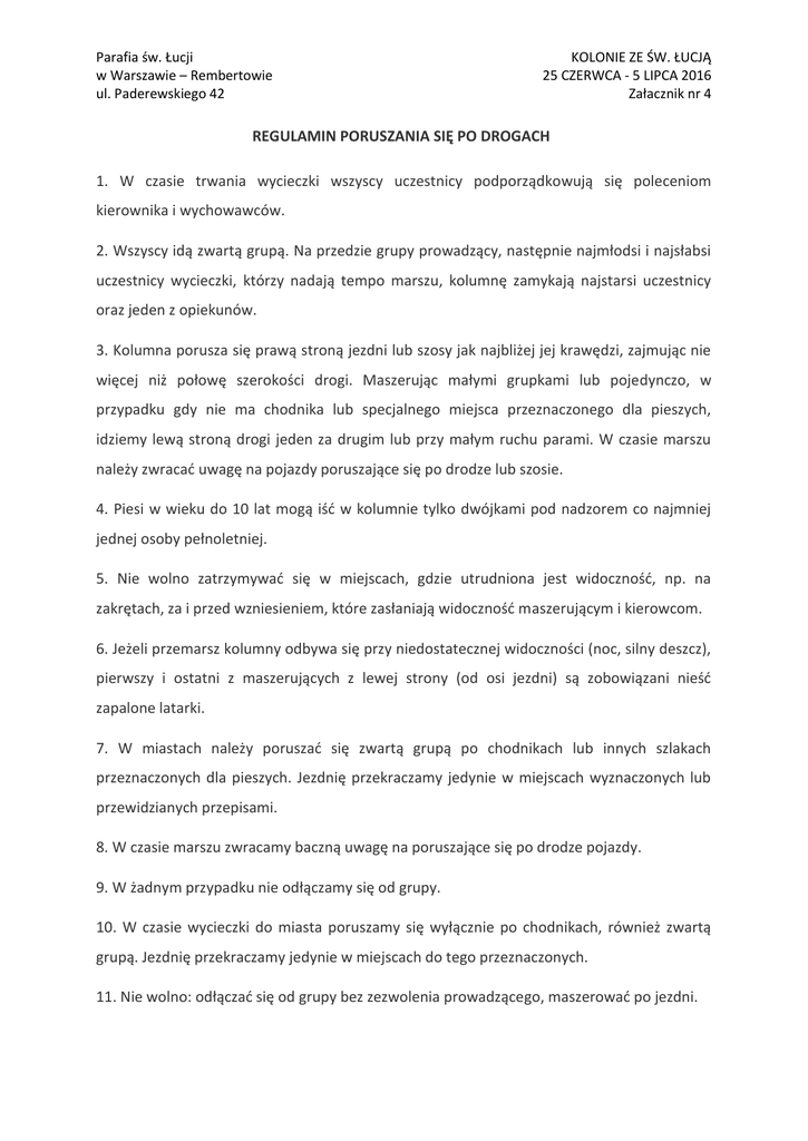 Parafia św. Łucji w Warszawie – Rembertowie ul. Paderewskiego 42 KOLONIE ZE ŚW. ŁUCJĄ 25 CZERWCA - 5 LIPCA 2016 Załacznik nr 4 REGULAMIN PORUSZANIA SIĘ PO DROGACH 1. W czasie trwania wycieczki wszyscy uczestnicy podporządkowują się poleceniom kierownika i wychowawców. 2. Wszyscy idą zwartą grupą. Na przedzie grupy prowadzący, następnie najmłodsi i najsłabsi uczestnicy wycieczki, którzy nadają tempo marszu, kolumnę zamykają najstarsi uczestnicy oraz jeden z opiekunów. 3. Kolumna porusza się prawą stroną jezdni lub szosy jak najbliżej jej krawędzi, zajmując nie więcej niż połowę szerokości drogi. Maszerując małymi grupkami lub pojedynczo, w przypadku gdy nie ma chodnika lub specjalnego miejsca przeznaczonego dla pieszych, idziemy lewą stroną drogi jeden za drugim lub przy małym ruchu parami. W czasie marszu należy zwracać uwagę na pojazdy poruszające się po drodze lub szosie. 4. Piesi w wieku do 10 lat mogą iść w kolumnie tylko dwójkami pod nadzorem co najmniej jednej osoby pełnoletniej. 5. Nie wolno zatrzymywać się w miejscach, gdzie utrudniona jest widoczność, np. na zakrętach, za i przed wzniesieniem, które zasłaniają widoczność maszerującym i kierowcom. 6. Jeżeli przemarsz kolumny odbywa się przy niedostatecznej widoczności (noc, silny deszcz), pierwszy i ostatni z maszerujących z lewej strony (od osi jezdni) są zobowiązani nieść zapalone latarki. 7. W miastach należy poruszać się zwartą grupą po chodnikach lub innych szlakach przeznaczonych dla pieszych. Jezdnię przekraczamy jedynie w miejscach wyznaczonych lub przewidzianych przepisami. 8. W czasie marszu zwracamy baczną uwagę na poruszające się po drodze pojazdy. 9. W żadnym przypadku nie odłączamy się od grupy. 10. W czasie wycieczki do miasta poruszamy się wyłącznie po chodnikach, również zwartą grupą. Jezdnię przekraczamy jedynie w miejscach do tego przeznaczonych. 11. Nie wolno: odłączać się od grupy bez zezwolenia prowadzącego, maszerować po jezdni.