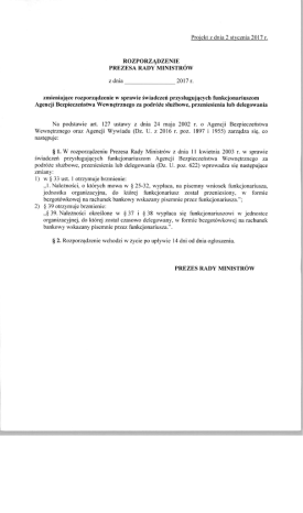 Projekt z dnia 2 stycznia 2017 r. ROZPORZĄDZENIE PREZESA RADY MINISTRÓW z dnia 2017 r. zmieniające rozporządzenie w sprawie świadczeń przysługujących funkcjonariuszom Agencji Bezpieczeństwa Wewnętrznego za podróże służbowe, przeniesienia lub delegowania N a podstawie art. 127 ustawy z dnia 24 maja 2002 r. o Agencji Bezpieczeństwa Wewnętrznego oraz Agencji Wywiadu (Dz. U . z 2016 r. poz. 1897 i 1955) zarządza się, co następuje: § 1. W rozporządzeniu Prezesa Rady Ministrów z dnia 11 kwietnia 2003 r. w sprawie świadczeń przysługujących funkcjonariuszom Agencji Bezpieczeństwa Wewnętrznego za podróże służbowe, przeniesienia lub delegowania (Dz. U . poz. 622) wprowadza się następujące zmiany: 1) w § 33 ust. 1 otrzymuje brzmienie: „1. Należności, o których mowa w § 25-32, wypłaca, na pisemny wniosek funkcjonariusza, jednostka organizacyjna, do której funkcjonariusz został przeniesiony, w formie bezgotówkowej na rachunek bankowy wskazany pisemnie przez funkcjonariusza."; 2) § 39 otrzymuje brzmienie: „§ 39. Należności określone w § 37 i § 38 wypłaca się funkcjonariuszowi w jednostce organizacyjnej, do której został czasowo delegowany, w formie bezgotówkowej na rachunek bankowy wskazany pisemnie przez funkcjonariusza.". § 2. Rozporządzenie wchodzi w życie po upływie 14 dni od dnia ogłoszenia. PREZES RADY MINISTRÓW UZASADNIENIE Przedmiotowa nowelizacja rozporządzenia nadaje nowe brzmienie ust. 1 w § 33 oraz § 39 rozporządzenia Prezesa Rady Ministrów z dnia 11 kwietnia 2003 r. w sprawie świadczeń przysługujących funkcjonariuszom Agencji Bezpieczeństwa Wewnętrznego za podróże służbowe, przeniesienia lub delegowania (Dz. U . poz. 622). Konieczność zmiany brzmienia ww. przepisu przedmiotowego rozporządzenia wynika z wprowadzania w Agencji Bezpieczeństwa Wewnętrznego obrotu bezgotówkowego w zakresie wypłaty funkcjonariuszom wszelkich świadczeń pieniężnych. W nowym stanie prawnym wypłata świadczeń pieniężnych przysługujących funkcjonariuszowi Agencji Bezpieczeństwa Wewnętrznego za podróże służbowe, przeniesienia lub delegowania, będzie następowała w formie bezgotówkowej na wskazany pisemnie rachunek bankowy. Dane statystyczne posiadane przez Agencję Bezpieczeństwa Wewnętrznego wskazują, iż tylko 1,5% funkcjonariuszy Agencji Bezpieczeństwa Wewnętrznego pobiera świadczenia pieniężne za podróże służbowe, przeniesienia lub delegowania w formie gotówkowej w kasie właściwej jednostki organizacyjnej Agencji Bezpieczeństwa Wewnętrznego. Pozostała część funkcjonariuszy Agencji Bezpieczeństwa Wewnętrznego otrzymuje świadczenia pieniężne za podróże służbowe, przeniesienia lub delegowania w formie przelewu na wskazany rachunek bankowy. Mając powyższe na uwadze należy stwierdzić, iż utrzymywanie w Agencji Bezpieczeństwa Wewnętrznego obrotu gotówkowego dla nielicznej grupy funkcjonariuszy jest działaniem nieekonomicznym oraz nieracjonalnym. Ponadto przyczynia się do generowania nieproporcjonalnie dużych nakładów pracy i czasu oraz kosztów związanych z zaangażowaniem funkcjonariuszy do obsługi tej formy płatności. Przedmiotowy przewidzianym w projekt rozporządzenia przepisach dotyczących nie podlega sposobu notyfikacji funkcjonowania zgodnie z trybem krajowego sytemu notyfikacji norm i aktów prawnych, ponieważ nie zawiera przepisów technicznych. Przedmiotowy projekt rozporządzenia nie był przedstawiany instytucjom i organom Unii Europejskiej lub Europejskiemu Bankowi Centralnemu, celem uzyskania opinii, dokonania konsultacji albo uzgodnienia, ponieważ przepisy przedmiotowego projektu pozostają poza zakresem prawa Unii Europejskiej. rozporządzenia Projekt rozporządzenia będzie podlegał udostępnieniu na stronie podmiotowej A B W w Biuletynie Informacji Publicznej, zgodnie z art. 5 ustawy z dnia 7 lipca 2005 r. o działalności lobbingowej w procesie stanowienia prawa (Dz. U . poz. 1414, z późn. zm.). Zgodnie z § 52 uchwały nr 190 Rady Ministrów z dnia 29 października 2013 r. Regulamin pracy Rady Ministrów (M.P. z 2016 r. poz. 1006 i 1204) projekt będzie podlegał udostępnieniu w Biuletynie Informacji Publicznej na stronie podmiotowej Rządowego Centrum Legislacji, w serwisie Rządowy Proces Legislacyjny. Przedmiot projektowanej regulacji pozostaje poza zakresem prawa Unii Europejskiej. Nazwa projektu Projekt rozporządzenia Prezesa Rady Ministrów zmieniającego rozporządzenie w sprawie świadczeń przysługujących funkcjonariuszom Agencji Bezpieczeństwa Wewnętrznego za podróże służbowe, przeniesienia lub delegowania Ministerstwo wiodące i ministerstwa współpracujące Kancelaria Prezesa Rady Ministrów; Szef Agencji Bezpieczeństwa Wewnętrznego Osoba odpowiedzialna za projekt w randze Ministra, Sekretarza Stanu lub Podsekretarza Stanu Szef A B W prof. dr hab. Piotr Pogonowski Data sporządzenia 2 stycznia 2017 r. Źródło: upoważnienie ustawowe art. 127 ustawy z dnia 24 maja 2002 r. o Agencji Bezpieczeństwa Wewnętrznego oraz Agencji Wywiadu (Dz. U . z 2016 r. poz. 1897 i 1955) Nr w wykazie prac: 104 Kontakt do opiekuna merytorycznego projektu Dyrektor Biura Prawnego A B W Teresa Rdzanowska tel. 22 58 57 233; e-mail b.prawne(a),abw.gov.pl 1. Jaki problem jest rozwiązywany? Projekt rozporządzenia Prezesa Rady Ministrów zmieniającego rozporządzenie w sprawie świadczeń przysługujących funkcjonariuszom Agencji Bezpieczeństwa Wewnętrznego za podróże służbowe, przeniesienia lub delegowania ma na celu wprowadzenie w Agencji Bezpieczeństwa Wewnętrznego wyłącznie bezgotówkowej wypłaty funkcjonariuszom świadczeń przysługujących za podróże służbowe, przeniesienia lub delegowania 2. Rekomendowane rozwiązanie, w tym planowane narzędzia interwencji, i oczekiwany efekt Projekt rozporządzenia Prezesa Rady Ministrów zmieniającego rozporządzenie w sprawie świadczeń przysługujących funkcjonariuszom Agencji 