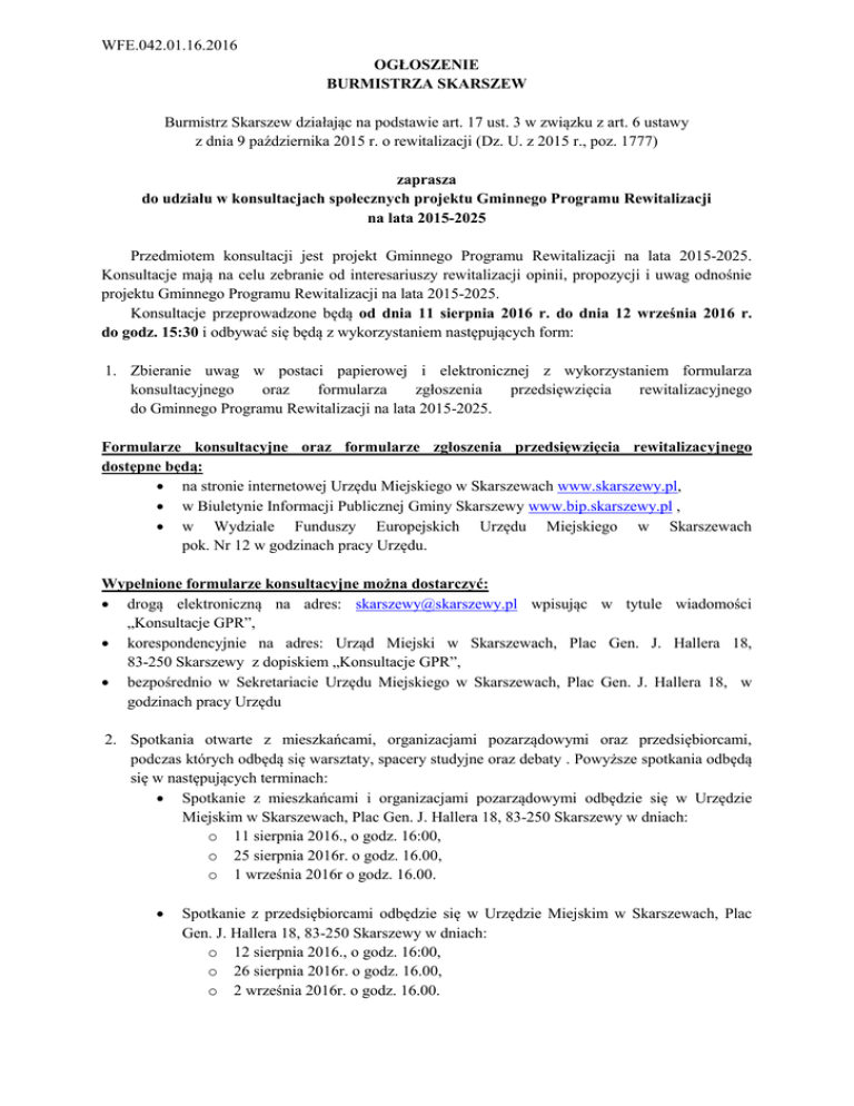WFE.042.01.16.2016 OGŁOSZENIE BURMISTRZA SKARSZEW Burmistrz Skarszew działając na podstawie art. 17 ust. 3 w związku z art. 6 ustawy z dnia 9 października 2015 r. o rewitalizacji (Dz. U. z 2015 r., poz. 1777) zaprasza do udziału w konsultacjach społecznych projektu Gminnego Programu Rewitalizacji na lata 2015-2025 Przedmiotem konsultacji jest projekt Gminnego Programu Rewitalizacji na lata 2015-2025. Konsultacje mają na celu zebranie od interesariuszy rewitalizacji opinii, propozycji i uwag odnośnie projektu Gminnego Programu Rewitalizacji na lata 2015-2025. Konsultacje przeprowadzone będą od dnia 11 sierpnia 2016 r. do dnia 12 września 2016 r. do godz. 15:30 i odbywać się będą z wykorzystaniem następujących form: 1. Zbieranie uwag w postaci papierowej i elektronicznej z wykorzystaniem formularza konsultacyjnego oraz formularza zgłoszenia przedsięwzięcia rewitalizacyjnego do Gminnego Programu Rewitalizacji na lata 2015-2025. Formularze konsultacyjne oraz formularze zgłoszenia przedsięwzięcia rewitalizacyjnego dostępne będą: na stronie internetowej Urzędu Miejskiego w Skarszewach www.skarszewy.pl, w Biuletynie Informacji Publicznej Gminy Skarszewy www.bip.skarszewy.pl , w Wydziale Funduszy Europejskich Urzędu Miejskiego w Skarszewach pok. Nr 12 w godzinach pracy Urzędu. Wypełnione formularze konsultacyjne można dostarczyć: drogą elektroniczną na adres: [email protected] wpisując w tytule wiadomości „Konsultacje GPR”, korespondencyjnie na adres: Urząd Miejski w Skarszewach, Plac Gen. J. Hallera 18, 83-250 Skarszewy z dopiskiem „Konsultacje GPR”, bezpośrednio w Sekretariacie Urzędu Miejskiego w Skarszewach, Plac Gen. J. Hallera 18, w godzinach pracy Urzędu 2. Spotkania otwarte z mieszkańcami, organizacjami pozarządowymi oraz przedsiębiorcami, podczas których odbędą się warsztaty, spacery studyjne oraz debaty . Powyższe spotkania odbędą się w następujących terminach: Spotkanie z mieszkańcami i organizacjami pozarządowymi odbędzie się w Urzędzie Miejskim w Skarszewach, Plac Gen. J. Hallera 18, 83-250 Skarszewy w dniach: o 11 sierpnia 2016., o godz. 16:00, o 25 sierpnia 2016r. o godz. 16.00, o 1 września 2016r o godz. 16.00. Spotkanie z przedsiębiorcami odbędzie się w Urzędzie Miejskim w Skarszewach, Plac Gen. J. Hallera 18, 83-250 Skarszewy w dniach: o 12 sierpnia 2016., o godz. 16:00, o 26 sierpnia 2016r. o godz. 16.00, o 2 września 2016r. o godz. 16.00. 3. Zbieranie uwag oraz propozycji ustnych w siedzibie Urzędu Miejskiego w Skarszewach, Plac Gen. J. Hallera 18, 83-250 Skarszewy, pok. 12, od poniedziałku do piątku w godzinach od 7:30 do 15:30. Materiał informacyjny oraz formularz konsultacyjny i formularz zgłoszenia przedsięwzięcia rewitalizacyjnego do Gminnego Programu Rewitalizacji na lata 2015-2025 będą dostępne od dnia ogłoszenia niniejszych konsultacji tj.: 3 sierpnia 2016 roku: na stronie internetowej www.skarszewy.pl, w Biuletynie Informacji Publicznej Urzędu Miejskiego w Skarszewach www.bip.skarszewy.pl, zakładka „REWITALIZACJA”, w siedzibie Urzędu Miejskiego w Skarszewach, Plac. Gen. J. Hallera 18, pok. 12, od poniedziałku do piątku w godzinach od 7:30 do 15:30. Nie będą rozpatrywane propozycje i opinie: zgłoszone przed lub po terminie prowadzenia ww. konsultacji (tj. przed dniem 11 sierpnia 2016 r. i po godz. 15:30 w dniu 12 września 2016 r.), niepodpisane czytelnie imieniem i nazwiskiem, przesłane w innej formie niż formularz konsultacyjny (za wyjątkiem propozycji i opinii zgłoszonych ustnie w siedzibie Urzędu Miejskiego w Skarszewach lub w trakcie otwartego spotkania z interesariuszami rewitalizacji). Niniejsze ogłoszenie zostaje podane do wiadomości poprzez zamieszczenie: w Biuletynie Informacji Publicznej na stronie internetowej www.skarszewy.pl na tablicy ogłoszeń w Urzędzie Miejskiego w Skarszewach BURMISTRZ Jacek Pauli __________________________________________ Interesariuszami rewitalizacji w rozumieniu art. 2 ust. 2 ustawy z dnia 9 października 2015 r. o rewitalizacji są w szczególności: 1) mieszkańcy obszaru rewitalizacji oraz właściciele, użytkownicy wieczyści nieruchomości i podmioty zarządzające nieruchomościami znajdującymi się na tym obszarze, w tym spółdzielnie mieszkaniowe, wspólnoty mieszkaniowe i towarzystwa budownictwa społecznego; 2) mieszkańcy gminy inni niż wymienieni w pkt 1; 3) podmioty prowadzące lub zamierzające prowadzić na obszarze gminy działalność gospodarczą; 4) podmioty prowadzące lub zamierzające prowadzić na obszarze gminy działalność społeczną, w tym organizacje pozarządowe i grupy nieformalne; 5) jednostki samorządu terytorialnego i ich jednostki organizacyjne; 6) organy władzy publicznej; 7) podmioty, inne niż wymienione w pkt 6, realizujące na obszarze rewitalizacji uprawnienia Skarbu Państwa.