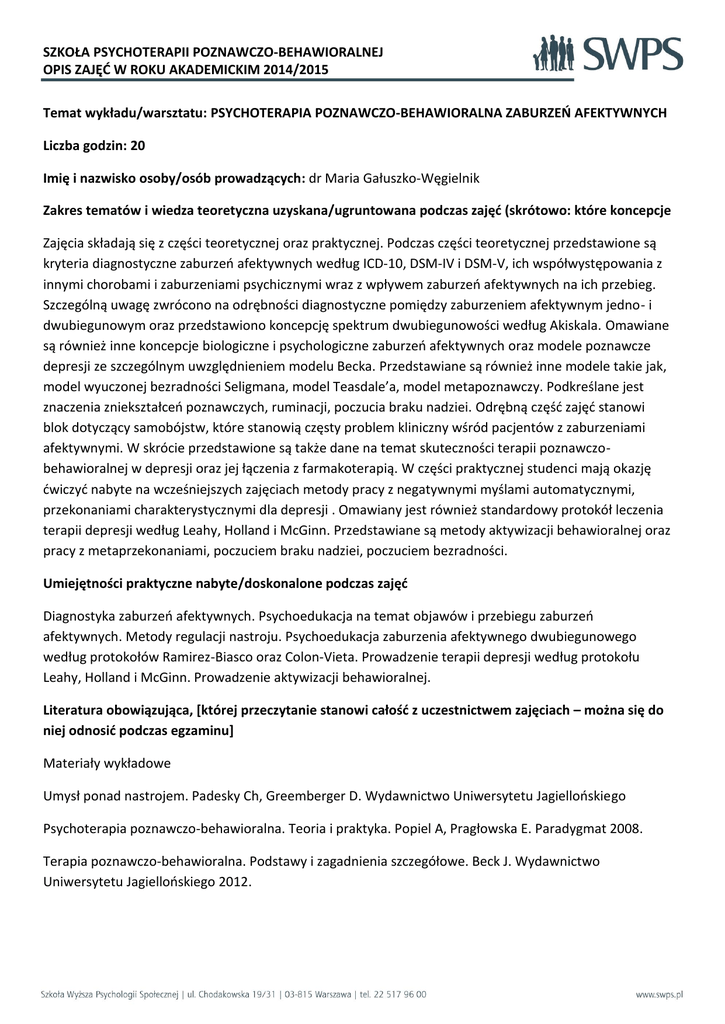 SZKOŁA PSYCHOTERAPII POZNAWCZO-BEHAWIORALNEJ OPIS ZAJĘĆ W ROKU AKADEMICKIM 2014/2015 Temat wykładu/warsztatu: PSYCHOTERAPIA POZNAWCZO-BEHAWIORALNA ZABURZEŃ AFEKTYWNYCH Liczba godzin: 20 Imię i nazwisko osoby/osób prowadzących: dr Maria Gałuszko-Węgielnik Zakres tematów i wiedza teoretyczna uzyskana/ugruntowana podczas zajęć (skrótowo: które koncepcje Zajęcia składają się z części teoretycznej oraz praktycznej. Podczas części teoretycznej przedstawione są kryteria diagnostyczne zaburzeń afektywnych według ICD-10, DSM-IV i DSM-V, ich współwystępowania z innymi chorobami i zaburzeniami psychicznymi wraz z wpływem zaburzeń afektywnych na ich przebieg. Szczególną uwagę zwrócono na odrębności diagnostyczne pomiędzy zaburzeniem afektywnym jedno- i dwubiegunowym oraz przedstawiono koncepcję spektrum dwubiegunowości według Akiskala. Omawiane są również inne koncepcje biologiczne i psychologiczne zaburzeń afektywnych oraz modele poznawcze depresji ze szczególnym uwzględnieniem modelu Becka. Przedstawiane są również inne modele takie jak, model wyuczonej bezradności Seligmana, model Teasdale’a, model metapoznawczy. Podkreślane jest znaczenia zniekształceń poznawczych, ruminacji, poczucia braku nadziei. Odrębną część zajęć stanowi blok dotyczący samobójstw, które stanowią częsty problem kliniczny wśród pacjentów z zaburzeniami afektywnymi. W skrócie przedstawione są także dane na temat skuteczności terapii poznawczobehawioralnej w depresji oraz jej łączenia z farmakoterapią. W części praktycznej studenci mają okazję ćwiczyć nabyte na wcześniejszych zajęciach metody pracy z negatywnymi myślami automatycznymi, przekonaniami charakterystycznymi dla depresji . Omawiany jest również standardowy protokół leczenia terapii depresji według Leahy, Holland i McGinn. Przedstawiane są metody aktywizacji behawioralnej oraz pracy z metaprzekonaniami, poczuciem braku nadziei, poczuciem bezradności. Umiejętności praktyczne nabyte/doskonalone podczas zajęć Diagnostyka zaburzeń afektywnych. Psychoedukacja na temat objawów i przebiegu zaburzeń afektywnych. Metody regulacji nastroju. Psychoedukacja zaburzenia afektywnego dwubiegunowego według protokołów Ramirez-Biasco oraz Colon-Vieta. Prowadzenie terapii depresji według protokołu Leahy, Holland i McGinn. Prowadzenie aktywizacji behawioralnej. Literatura obowiązująca, [której przeczytanie stanowi całość z uczestnictwem zajęciach – można się do niej odnosić podczas egzaminu] Materiały wykładowe Umysł ponad nastrojem. Padesky Ch, Greemberger D. Wydawnictwo Uniwersytetu Jagiellońskiego Psychoterapia poznawczo-behawioralna. Teoria i praktyka. Popiel A, Pragłowska E. Paradygmat 2008. Terapia poznawczo-behawioralna. Podstawy i zagadnienia szczegółowe. Beck J. Wydawnictwo Uniwersytetu Jagiellońskiego 2012. SZKOŁA PSYCHOTERAPII POZNAWCZO-BEHAWIORALNEJ OPIS ZAJĘĆ W ROKU AKADEMICKIM 2014/2015 Literatura uzupełniająca, pogłębiająca wiedzę na dany temat Pokonaj depresję zanim ona pokona ciebie Leahy R.L. Wydawnictwo Uniwersytetu Jagiellońskiego 2014 Terapia poznawcza depresji oparta na uważności Segal Z. Williams J. Teasdale J. Wydawnictwo Uniwersytetu Jagiellońskiego 2009 Zaburzenia afektywne dwubiegunowe Ramirez-Basco M, Rush A. Wydawnictwo Uniwersytetu Jagiellońskiego 2007 Zaburzenia afektywne dwubiegunowe. Podręcznik pacjenta. Ramirez-Basco M, Rush A. Wydawnictwo Uniwersytetu Jagiellońskiego 2007 Podręcznik psychoedukacji w chorobie afektywnej dwubiegunowej. Colom F, Vieta E. Medipage 2009. Dodatkowe oczekiwania wykładowcy wobec studentów związane z przygotowaniem się do zajęć np. wymaganie aktywnego uczestnictwa, konieczność przygotowania przypadku itp. Aktywny udział w zajęciach. Informacja o osobie prowadzącej (lub osobach) [krótki biogram] Dr n med. Maria Gałuszko-Węgielnik jest praktykującym lekarzem psychiatrą, terapeutą poznawczobehawioralnym i superwizorem - dydaktykiem PTTPB. Na co dzień pracuje jako adiunkt w Klinice Chorób Psychicznych i Zaburzeń Nerwicowych Gdańskiego Uniwersytetu Medycznego. Jest aktywnym członkiem Polskiego Towarzystwa Terapii Poznawczej i Behawioralnej, zasiada w Komisji Naukowo-Dydaktycznej. W pracy zawodowej koncentruje się na zaburzeniach lękowych, odżywiania i nastroju, łącząc farmakoterapię i psychoterapię.