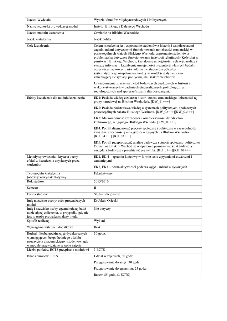 Nazwa Wydziału Wydział Studiów Międzynarodowych i Politycznych Nazwa jednostki prowadzącej moduł Instytut Bliskiego i Dalekiego Wschodu Nazwa modułu kształcenia Ormianie na Bliskim Wschodzie Język kształcenia Język polski Cele kształcenia Celem kształcenia jest: zapoznanie studentów z historią i współczesnymi zagadnieniami dotyczącymi funkcjonowania mniejszości ormiańskiej w poszczególnych krajach Bliskiego Wschodu, zapoznanie studentów z problematyką dotyczącą funkcjonowania instytucji religijnych (Kościoła) w państwach Bliskiego Wschodu, kształcenie umiejętności selekcji, analizy i syntezy informacji, kształcenie umiejętności prezentacji własnych badań i obserwacji naukowych, uświadomienie studentom potrzeby systematycznego uzupełnienia wiedzy w kontekście dynamicznie zmieniającej się sytuacji politycznej na Bliskim Wschodzie. Uświadomienie znaczenia metod badawczych osadzonych w historii a wykorzystywanych w badaniach etnograficznych, politologicznych, socjologicznych nad społeczeństwami diasporycznymi. Efekty kształcenia dla modułu kształcenia EK1: Posiada wiedzę z zakresu historii etnosu ormiańskiego i obecności tej grupy narodowej na Bliskim Wschodzie. [KW_11+++] EK2: Posiada podstawową wiedzę o systemach politycznych, społecznych poszczególnych państw Bliskiego Wschodu. [KW_02+++][KW_03+++] EK3: Ma świadomość złożoności i kompleksowości dziedzictwa kulturowego, religijnego Bliskiego Wschodu. [KW_08+++] EK4: Potrafi diagnozować procesy społeczne i polityczne w szczególności związane z obecnością mniejszości religijnych na Bliskim Wschodzie. [KU_04+++] [KU_03+++] EK5: Potrafi przeprowadzić analizę badawczą sytuacji społeczno-politycznej Ormian na Bliskim Wschodzie w oparciu o poznany warsztat badawczy, narzędzia badawcze i przedstawić jej wyniki. [KU_01++][KU_02+++] Metody sprawdzania i kryteria oceny efektów kształcenia uzyskanych przez studentów EK1, EK 4 – egzamin końcowy w formie testu z pytaniami otwartymi i zamkniętymi Typ modułu kształcenia (obowiązkowy/fakultatywny) Rok studiów Fakultatywny Semestr II Forma studiów Studia stacjonarne Imię nazwisko osoby/ osób prowadzących moduł Imię i nazwisko osoby egzaminującej bądź udzielającej zaliczenia, w przypadku gdy nie jest to osoba prowadząca dany moduł Sposób realizacji Dr Jakub Osiecki Wymagania wstępne i dodatkowe Brak Rodzaj i liczba godzin zajęć dydaktycznych wymagających bezpośredniego udziału nauczyciela akademickiego i studentów, gdy w module przewidziane są takie zajęcia Liczba punktów ECTS przypisana modułowi 30 godz. Bilans punktów ECTS Udział w zajęciach, 30 godz. EK3, EK3 – ocena aktywności podczas zajęć – udział w dyskusjach 2015/2016 Nie dotyczy Wykład 3 ECTS Przygotowanie do zajęć: 30 godz. Przygotowanie do egzaminu: 25 godz. Razem 85 godz. (3 ECTS) Stosowane metody dydaktyczne Konwersatorium: - Metody podające – opis - Metody podające – objaśnienie lub wyjaśnienie - Metody podające – prezentacja multimedialna - Metody problemowe - wykład problemowy - Metody problemowe - metody aktywizujące - dyskusja dydaktyczna Forma i warunki zaliczenia modułu, w tym zasady dopuszczenia do egzaminu, zaliczenia, a także forma i warunki zaliczenia poszczególnych zajęć wchodzących w zakres danego modułu Treści modułu kształcenia Warunkiem zaliczenia kursu jest egzamin pisemny obejmujący całość treści merytorycznych modułu, na które składają się treści przekazywane podczas wykładu oraz wiedza uzyskana na podstawie samodzielnego studiowania. Wykaz literatury podstawowej i uzupełniającej, obowiązującej do zaliczenia danego modułu Literatura podstawowa: Dzieje narodu ormiańskiego zamieszkującego tereny Bliskiego Wschodu. Problematyka funkcjonowania Diaspory ormiańskiej w Konstantynopolu, w Isfahanie, Teheranie i Bejrucie. Sytuacja społeczna danej grupy narodowej poczynając od XVII wieku a kończąc na współczesnych problem politycznych dotyczących tejże grupy narodowej. W sposób szczegółowy przedstawiona zostanie sytuacja Ormian po 1915 roku, tj. po ludobójstwie Ormian i w Turcji i pojawieniem się tzw. Diaspory. Omówione zostaną relacje Ormian z Bliskiego Wschodu z „ojczyzną”, w zarówno w toku całego XX wieku jak i po 1991 roku (ogłoszenie przez Armenią niepodległości). Kwestie religijne oraz działalność Apostolskiego Kościoła Ormiańskiego i Kościoła katolickiego obrządku ormiańskiego wśród ludności muzułmańskiej. Panossian R., The Armenians, London 2006 Suny, R. G., Looking toward Ararat, Bloomington 1993 Ormanian M., Kościół ormiański, Kraków 2004 Ritter L., Ormiańskie losy. Historia i przyszłość diaspory, Warszawa 2009 Literatura uzupełniająca: Atamian A., Archdiocese of Naxjevan in the 17th century, Proquest dissertations 1988 Bournoutian G., Khatante of Erivan under Kajar Rule, NY 2003 Emin J., The life and adventures of Joseph Emin, Calcutta 1918 Lynch H. F. B., Armenia. Travels and Studies, London 1901 The Cambridge History of Iran by William Bayne Fisher, Peter Avery, Ilya Gershevitch, Gavin Hambly, Charles Melville, Cambridge University Press, 1991