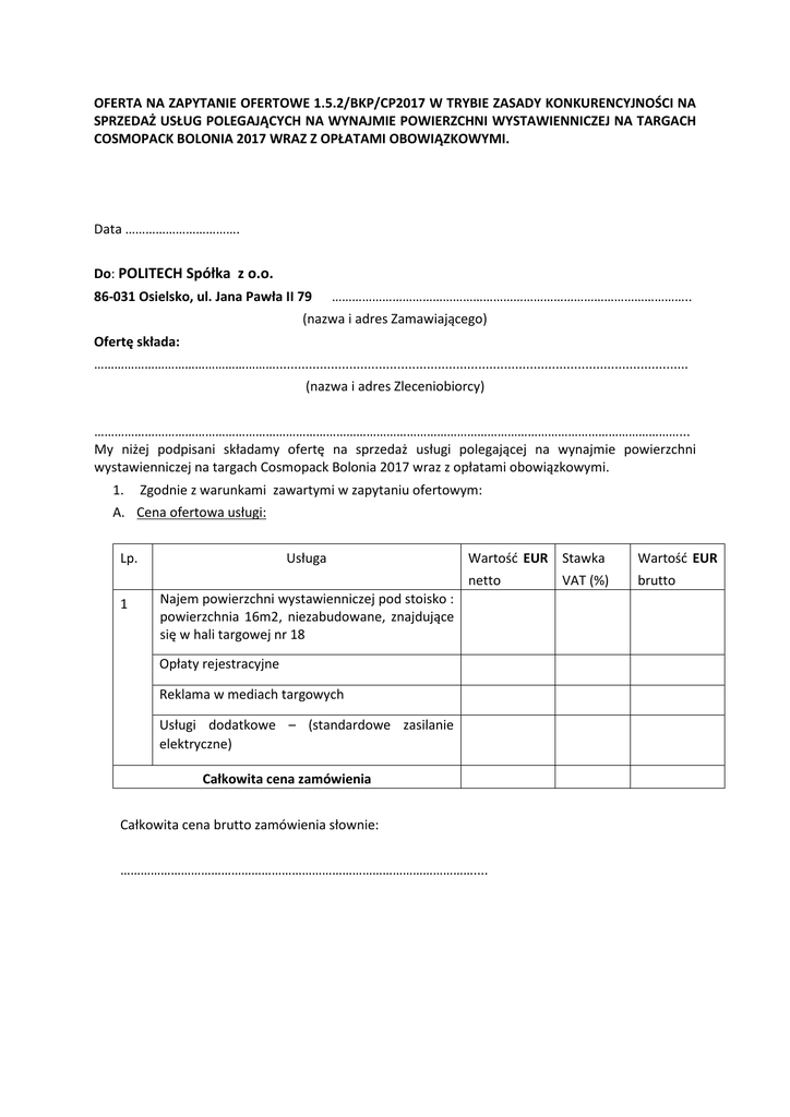 OFERTA NA ZAPYTANIE OFERTOWE 1.5.2/BKP/CP2017 W TRYBIE ZASADY KONKURENCYJNOŚCI NA SPRZEDAŻ USŁUG POLEGAJĄCYCH NA WYNAJMIE POWIERZCHNI WYSTAWIENNICZEJ NA TARGACH COSMOPACK BOLONIA 2017 WRAZ Z OPŁATAMI OBOWIĄZKOWYMI. Data ……………………………. Do: POLITECH Spółka z o.o. 86-031 Osielsko, ul. Jana Pawła II 79 …………………………………………………………………………………………….. (nazwa i adres Zamawiającego) Ofertę składa: ………………………………………………................................................................................................................ (nazwa i adres Zleceniobiorcy) …………………………………………………………………………………………………………………………………………………………... My niżej podpisani składamy ofertę na sprzedaż usługi polegającej na wynajmie powierzchni wystawienniczej na targach Cosmopack Bolonia 2017 wraz z opłatami obowiązkowymi. 1. Zgodnie z warunkami zawartymi w zapytaniu ofertowym: A. Cena ofertowa usługi: Lp. 1 Usługa Wartość EUR Stawka Wartość EUR netto brutto Najem powierzchni wystawienniczej pod stoisko : powierzchnia 16m2, niezabudowane, znajdujące się w hali targowej nr 18 Opłaty rejestracyjne Reklama w mediach targowych Usługi dodatkowe – (standardowe zasilanie elektryczne) Całkowita cena zamówienia Całkowita cena brutto zamówienia słownie: …………………………………………………………………………………………….... VAT (%) B. Warunki zapłaty Lp. Odroczenie terminu płatności połowy ceny zamówienia (licząc od daty umowy, zawartej niezwłocznie po przeprowadzeniu postępowania z wyłonionym wykonawcą) o: 1 0 miesięcy (płatność całkowitej ceny zamówienia w terminie 7 dni od momentu podpisania umowy) 2 1 miesiąc 3 2 miesiące 4 3 miesiące 5 4 miesiące 6 5 miesięcy Zaznacz właściwe 2. Specyfikacja do oferty: Oferta obejmuje pełen zakres usługi wyspecyfikowany w pkt. I Zapytania ofertowego. 3. Warunki i termin płatności za usługę: Zgodne z Zapytaniem ofertowym i niniejszą Ofertą. 4. Termin związania ofertą wynosi 7 dni roboczych od daty wyznaczonej jako termin składania oferty. 5. Potwierdzamy, iż nie uczestniczymy w jakiejkolwiek innej ofercie dotyczącej tego samego postępowania. 6. Oświadczamy, że spełniamy warunki udziału w postępowaniu określone w pkt. II Zapytania ofertowego. 7. Oświadczamy, że nie jesteśmy powiązani z Zamawiającym osobowo lub kapitałowo. Przez powiązania kapitałowe lub osobowe rozumie się wzajemne powiązania między Zamawiającym lub osobami upoważnionymi do zaciągania zobowiązań w imieniu Zamawiającego lub osobami wykonującymi w imieniu Zamawiającego czynności związane z przygotowaniem i przeprowadzeniem procedury wyboru wykonawcy a wykonawcą, polegające w szczególności na: a) uczestniczeniu w spółce jako wspólnik spółki cywilnej lub spółki osobowej, b) posiadaniu co najmniej 10% udziałów lub akcji, c) pełnieniu funkcji członka organu nadzorczego lub zarządzającego, prokurenta, pełnomocnika, d) pozostawaniu w związku małżeńskim w stosunku pokrewieństwa lub powinowactwa w linii prostej, pokrewieństwa drugiego stopnia lub powinowactwa drugiego stopnia w linii bocznej lub w stosunku przysposobienia, opieki lub kurateli. 8. Oświadczamy, że dokonaliśmy wynajmu powierzchni pod co najmniej 10 stoisk wystawowych. 2 Miejscowość i data: ……………………………………… Podpis osoby upoważnionej do reprezentowania Zleceniobiorcy……………………….. (pieczęć Zleceniobiorcy) 3