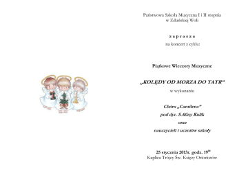 Państwowa Szkoła Muzyczna I i II stopnia w Zduńskiej Woli zaprasza na koncert z cyklu: Piątkowe Wieczory Muzyczne „KOLĘDY OD MORZA DO TATR” w wykonaniu Chóru „Cantilena” pod dyr. S.Aliny Kulik oraz nauczycieli i uczniów szkoły 25 stycznia 2013r. godz. 1900 Kaplica Trójcy Św. Księży Orionistów