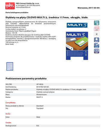 PBS Connect Polska Sp. z o.o. ul. Annopol 3, 03-236 Warszawa www.pbspolska.eu Warszawa, 2017-03-04 Karta katalogowa produktu: Etykiety na płyty CD/DVD MULTI 3, średnica 117mm, okrągłe, białe Etykiety samoprzylepne, przeznaczone do opisywania, oznaczania płyt CD/DVD, odpowiednie do drukarek atramentowych, laserowych oraz kserokopiarek Rozmiar etykiety: ø117mm Liczba etykiet na arkuszu: 2 Gramatura: front 70gsm, podkład 55gsm Białość: 150 CIE Średnica etykiet idealnie pasująca do średnicy płyt CD/DVD Darmowy program do projektowania i wydruku etykiet APLI SOFT kompatybilny również z oprogramowaniem Windows 7 dostępny na apli.com lub pbspolska.eu 100 arkuszy w j.s. Kolor biały Podstawowe parametry produktu SKU PBS AP10816 Kod kreskowy 8410782108160 Nazwa produktu Etykiety na płyty CD/DVD MULTI 3, średnica 117mm, okrągłe, białe Kategoria Etykiety samoprzylepne Klasa Ekonomiczne Marka MULTI 3 Certyfikaty Nowy produkt w ofercie Standard Hit Standard Kolor Kolor Biały Cecha Ekologiczność B.d. PBS Connect Polska Sp. z o.o. ul. Annopol 3, 03-236 Warszawa www.pbspolska.eu Warszawa, 2017-03-04 Karta katalogowa produktu cd. Etykiety na płyty CD/DVD MULTI 3, średnica 117mm, okrągłe, białe Podstawowe parametry produktu Produkt Etykiety na cd/dvd Typ Inkjet, laser, copier Kształt Okrągłe Materiał Papier W ofercie od 2013-01 Wymiary Gramatura (g/m2) 70/55 Wymiary (mm) Średnica: 117 Ilość Ilość arkuszy 100 Ilość etykiet na arkuszu 2 Wspólny słownik zamówień CPV 30192800-9 Etykiety samoprzylepne Jednostki logistyczne Opakowanie 1 5 op